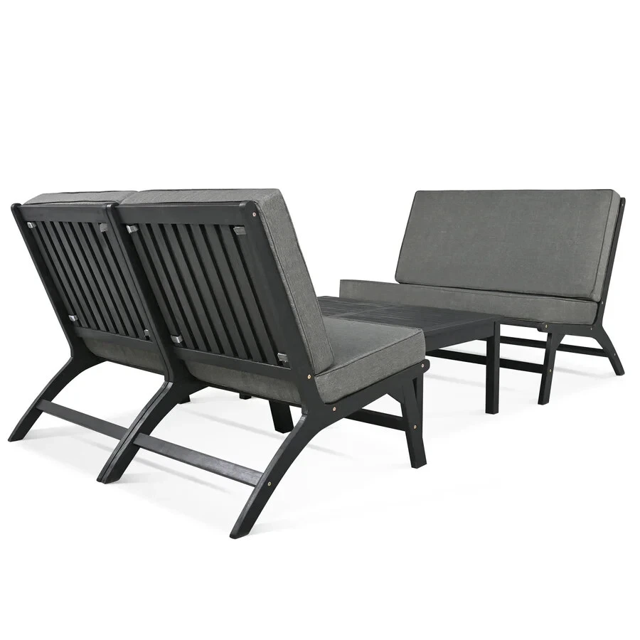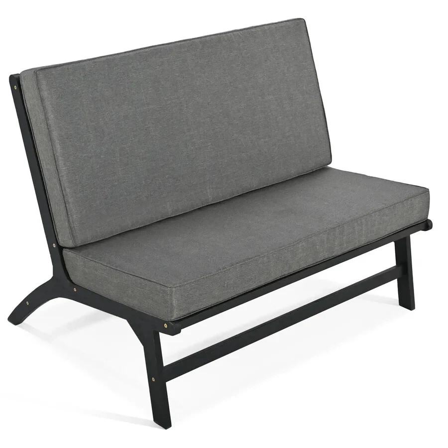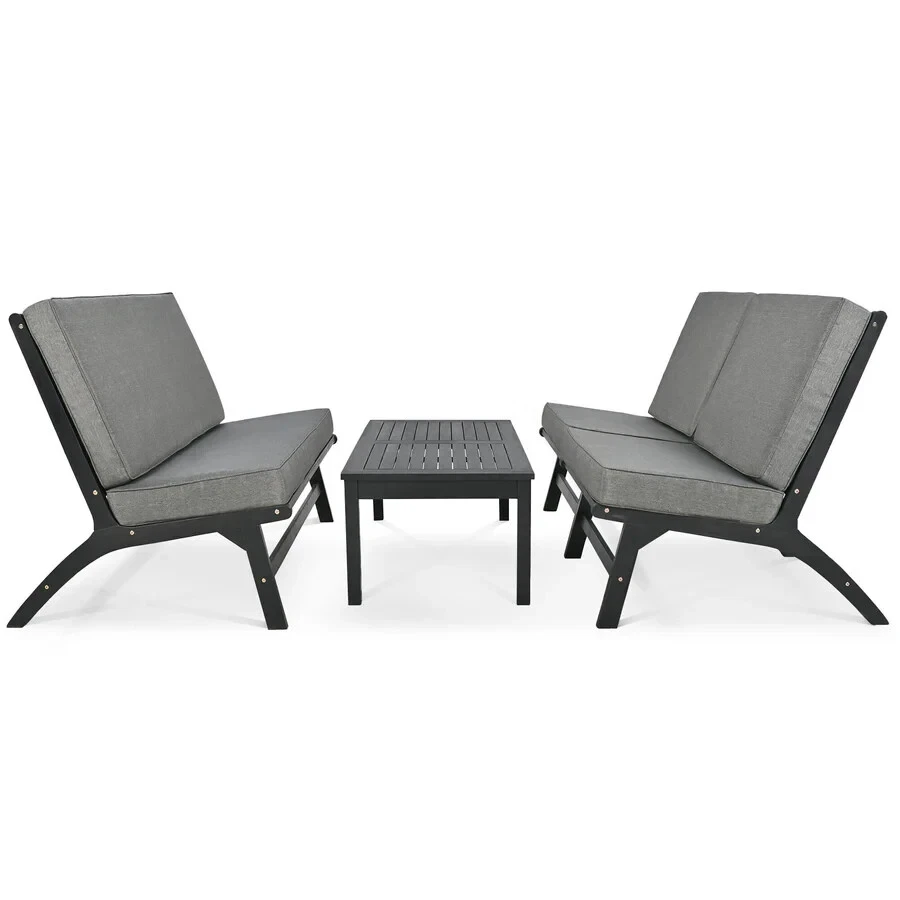 [CLASSIC COLOR] The classic combination of wood color and beige brings high-end to your place. [HIGH-QUALITY MATERIAL] Made of high-quality acacia wood for durability and longevity. [UNIQUE DESIGN] The V-shaped deep seats provide plenty of seating space and comfort for you and your guests. [COMFORTABLITY] The thicker cushions are fixed with Velcro and won't slide off easily, making them stable and comfortable. [TABLE COVER] The set comes with a free table cover to protect the tabletop when not in use.