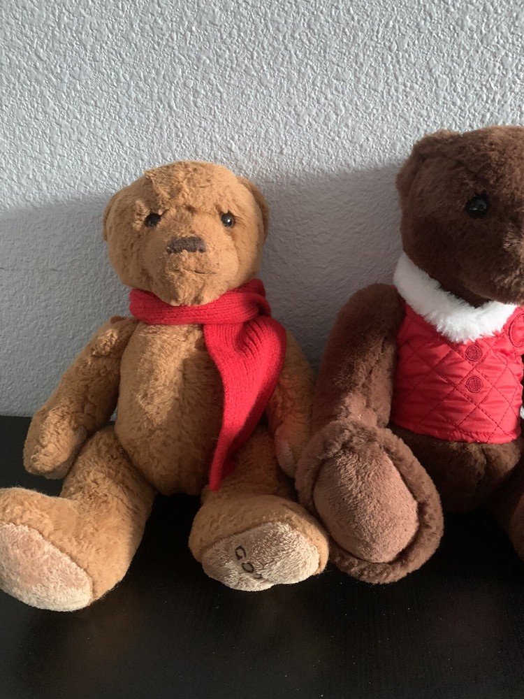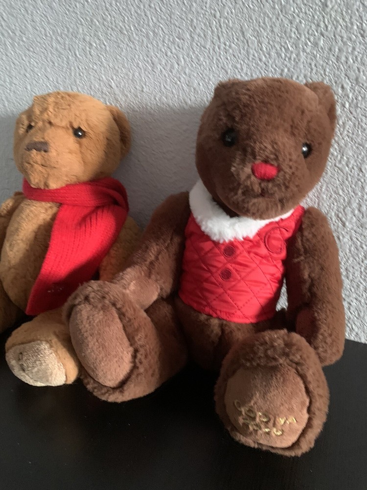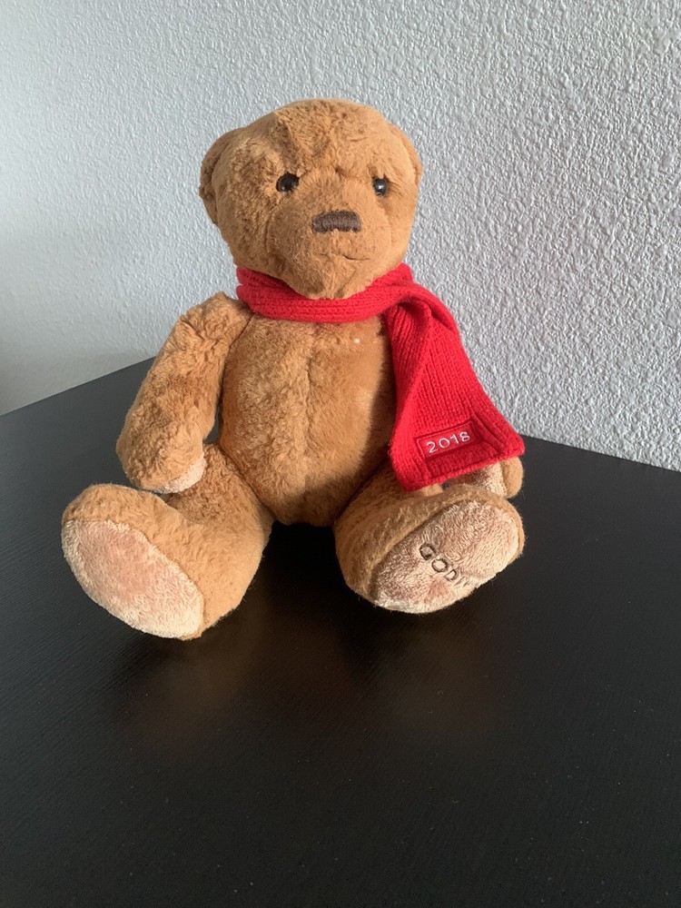 GODIVA brand plush teddy bears one is wearing a red vest (2020) and one is wearing a red scarf (2018). The bear is designed with a holiday theme, perfect for the festive season.
