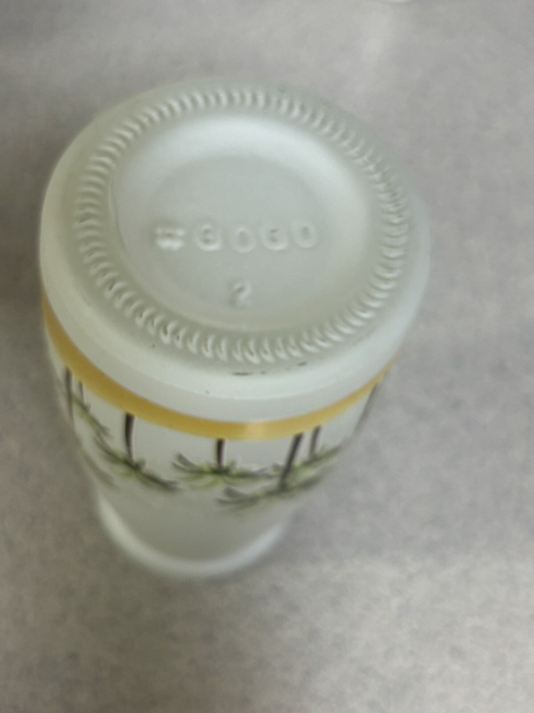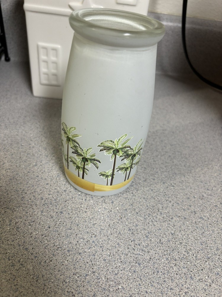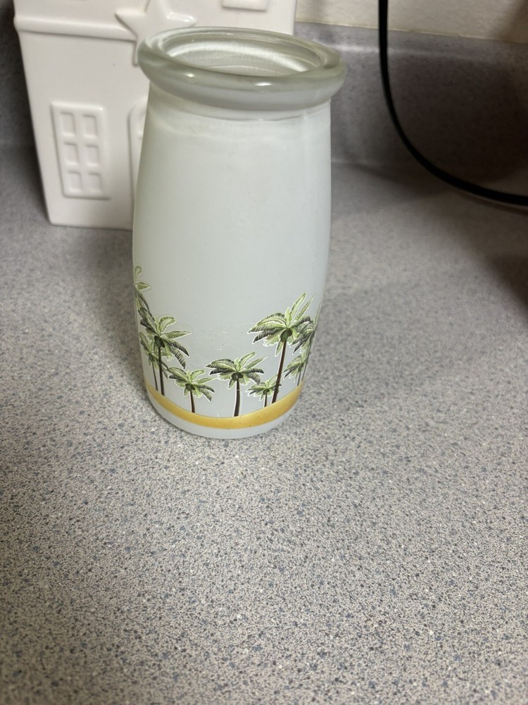 Add a tropical touch to your home decor with this #GOGO glass vase in the shape of a milk jug. The vase stands at 5.5 inches tall and features a white base with colorful palm trees pattern. It is made of glass and can be used as a vase for all occasions. The vase has a cylindrical shape and a floral pattern. It is an original piece and can be cleaned with warm water. The vase has a width of 2.25 inches at the top and 2.5 inches at the bottom, and weighs 8.8 ounces. B1/14