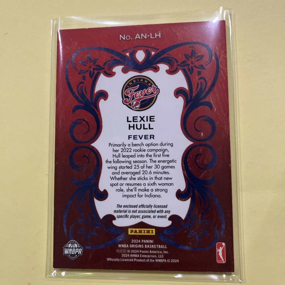 This is a rare and highly sought-after Gold Art Nouveau trading card featuring Lexie Hull, a talented player for the Indiana Fever team in the Women's National Basketball Association (WNBA). The card is an original and licensed reprint from the 2024 Panini WNBA Origins set, and is serial numbered and parallel/variety. The card's unique features include a 2-color patch and an insert, making it a must-have for any serious collector. The card is in excellent shape and is a great addition to any sports trading card collection. Don't miss your chance to own this amazing piece of basketball memorabilia! 9/10