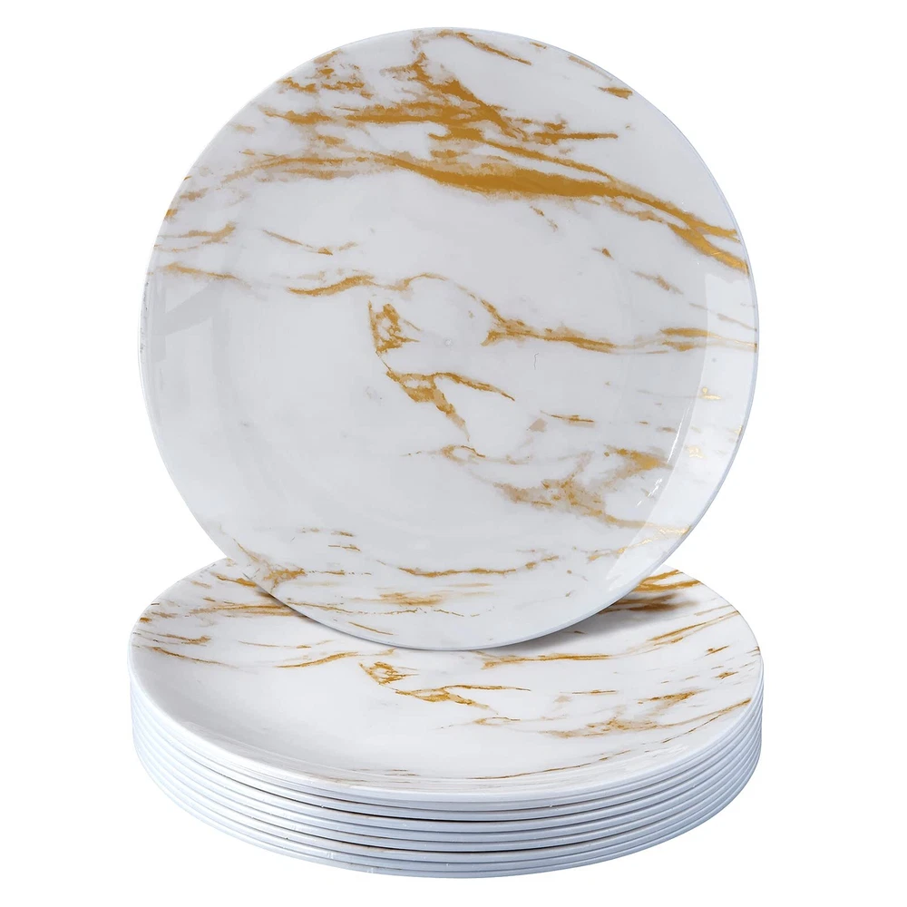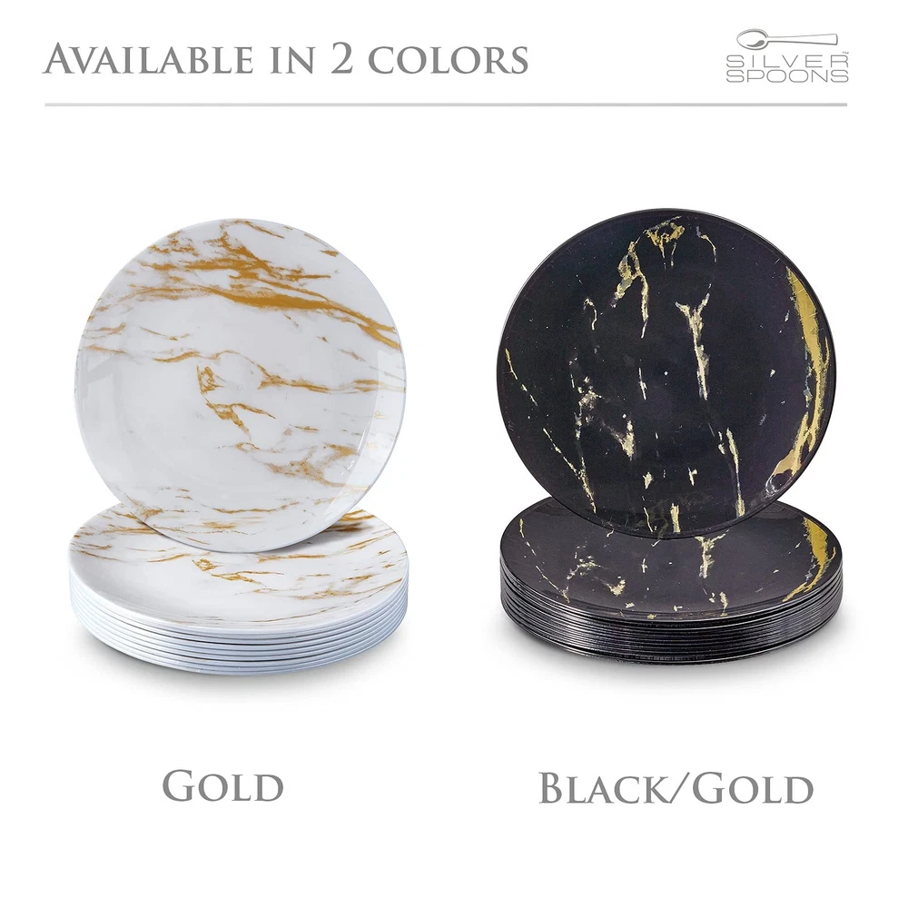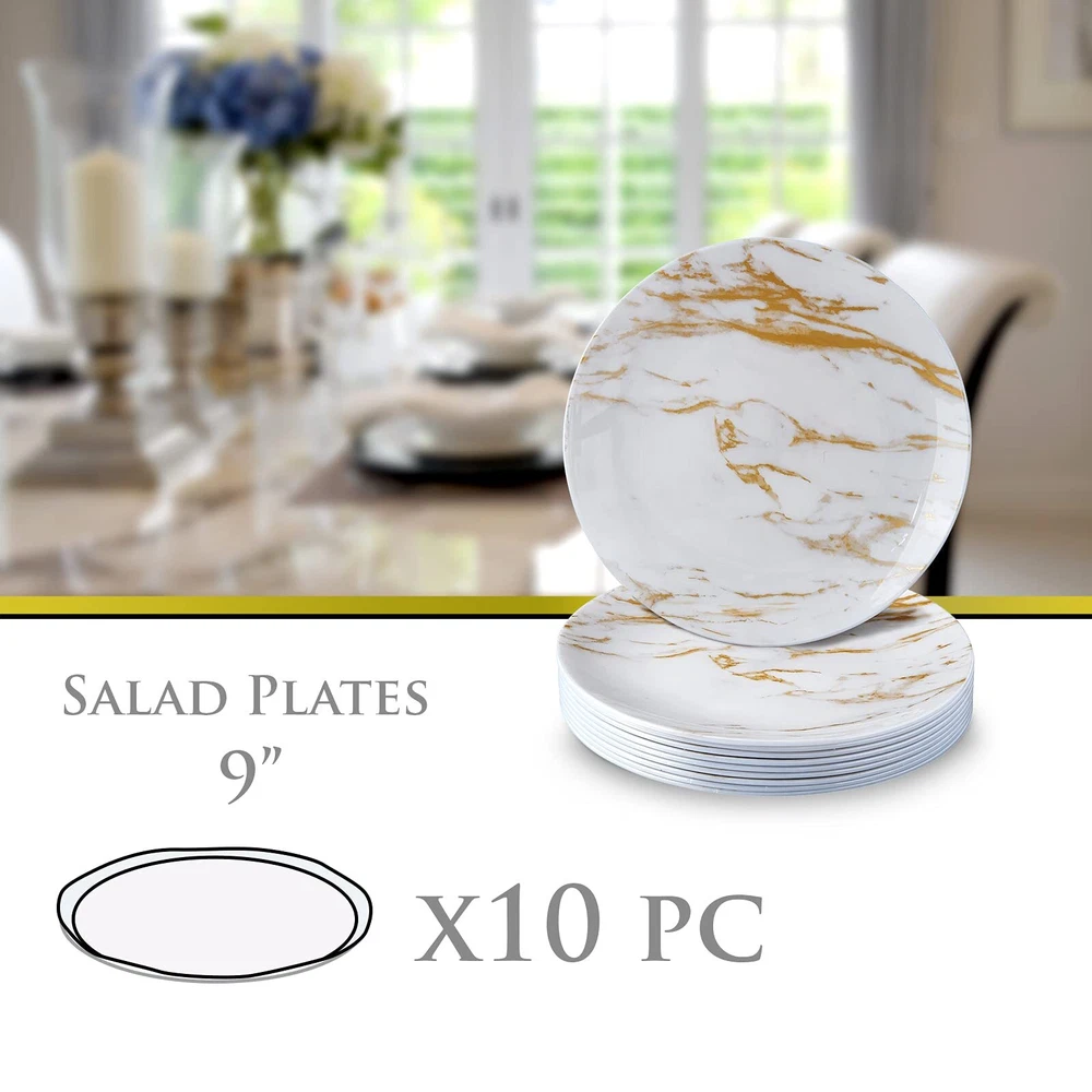 GOLD MARBLE DESIGN PLATES | Elegant Salad Plates | Carrara Marble Collection | 9” – 10 PC PREMIUM QUALITY: Our dinnerware sets are non-, made from high heavyweight plastic materials. These are safe to use for hot, wet, and cold foods. MARBLE DESIGN: Deck your table with this painted marble stone design plate. It will bring the whole event to a new level. INCLUDES: 10 Salad Plates STURDY AND DURABLE: These gold party plates are sturdy enough to handle large amounts of food making it the perfect option for main courses and more. The secret is yours; no else will know that these are disposable. CONVENIENT: This disposable plate set is the hassle-free alternative to real dinnerware. Simply dispose of them after the party and relax. To reuse them at a later time, simply hand-wash and them away. SERVES ALL YOUR CATERING NEEDS: These marble plates are the ideal choice for all occasions ranging from weddings to home dinners and more