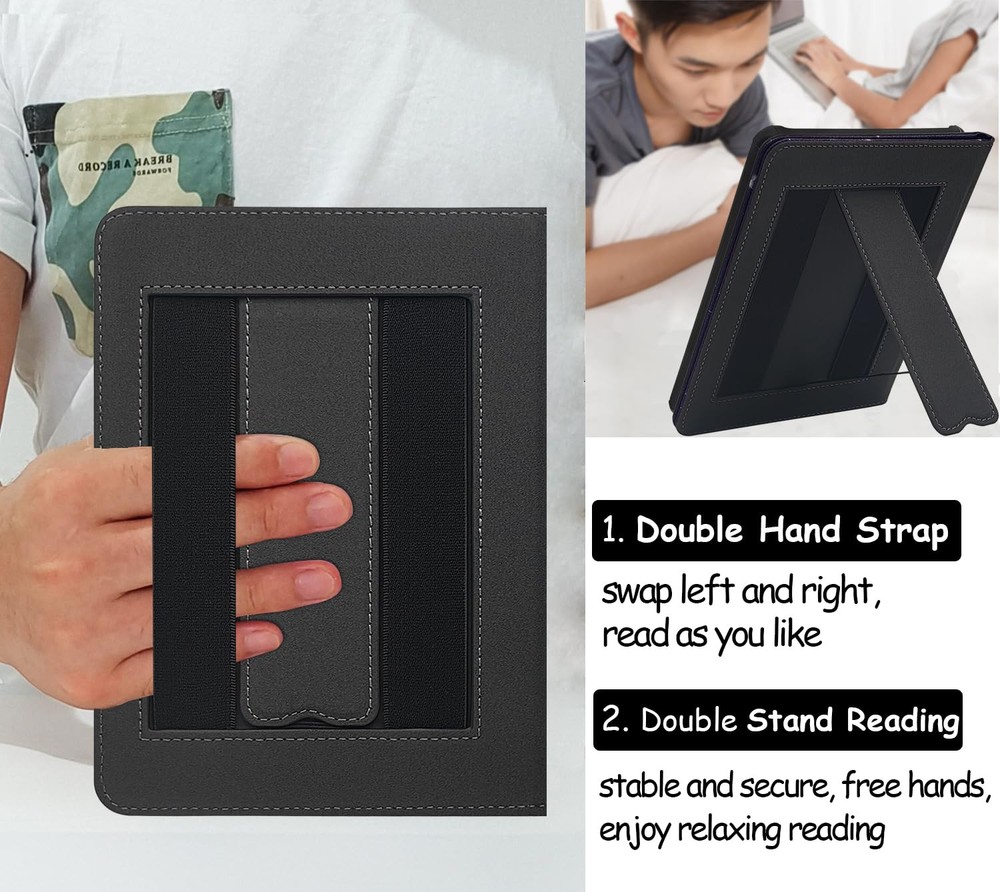 This case is a game-changer for my Kindle! The double hand straps make reading so comfortable, and the built-in stand is perfect for hands-free use. The auto sleep/wake feature works flawlessly, and the snug fit keeps my device secure. The material feels premium, and the design is sleek—definitely worth it for any Kindle owner!