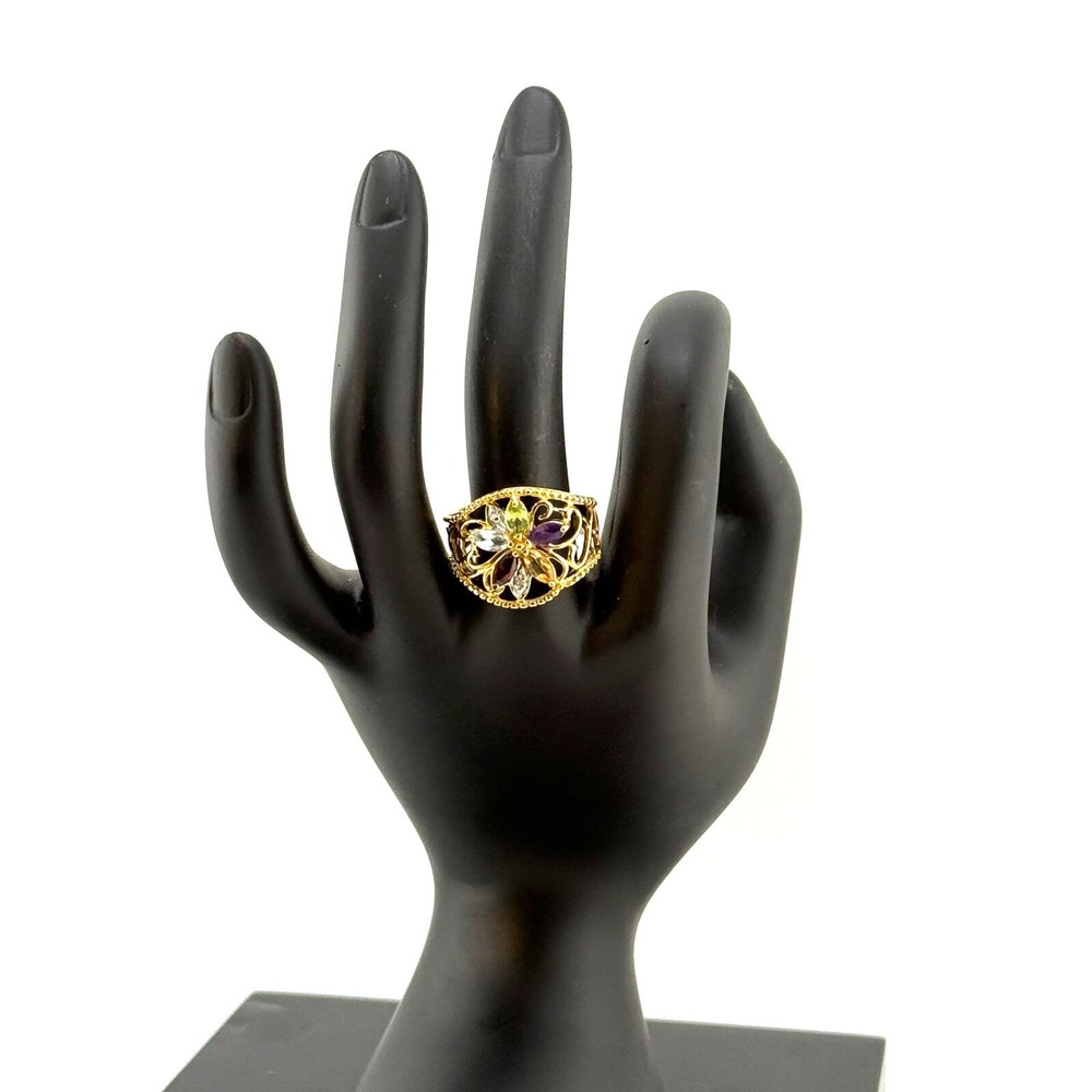 Beautiful ring in gold plated sterling silver with 5 semi-precious stones including Amethysts, Citrine, and more. Size 8 and signed "PAJ" Stamped 925. Setting is approx. 0.75 by 0.6. Gorgeous statement ring.