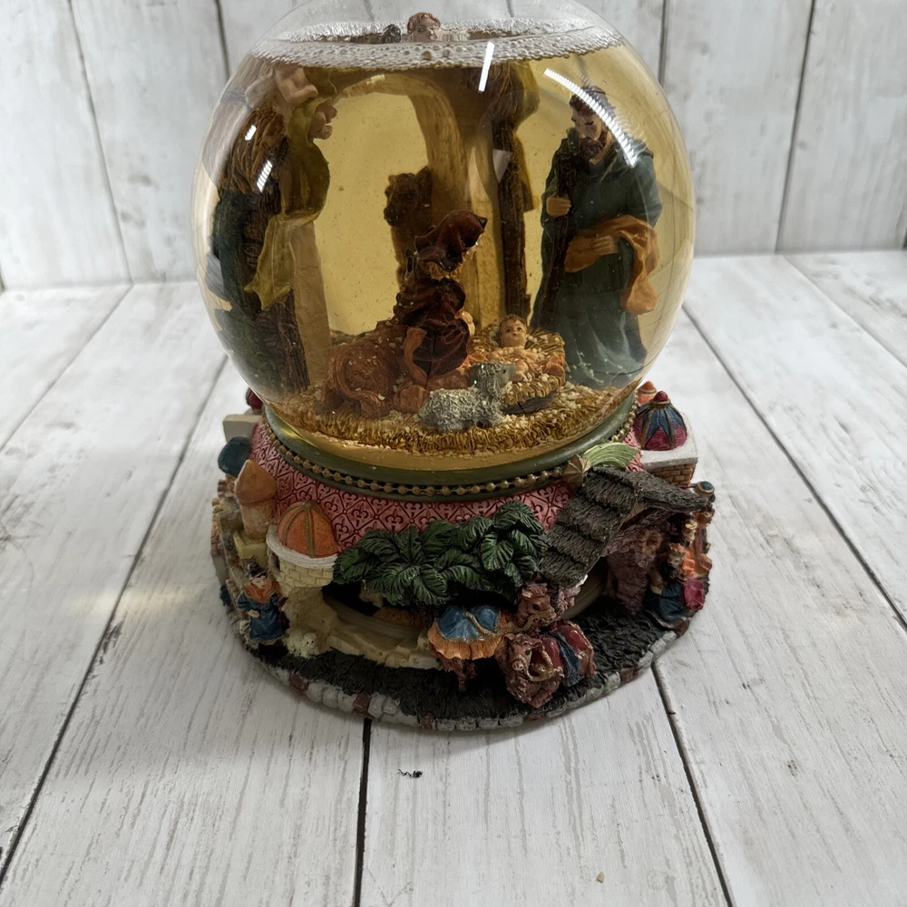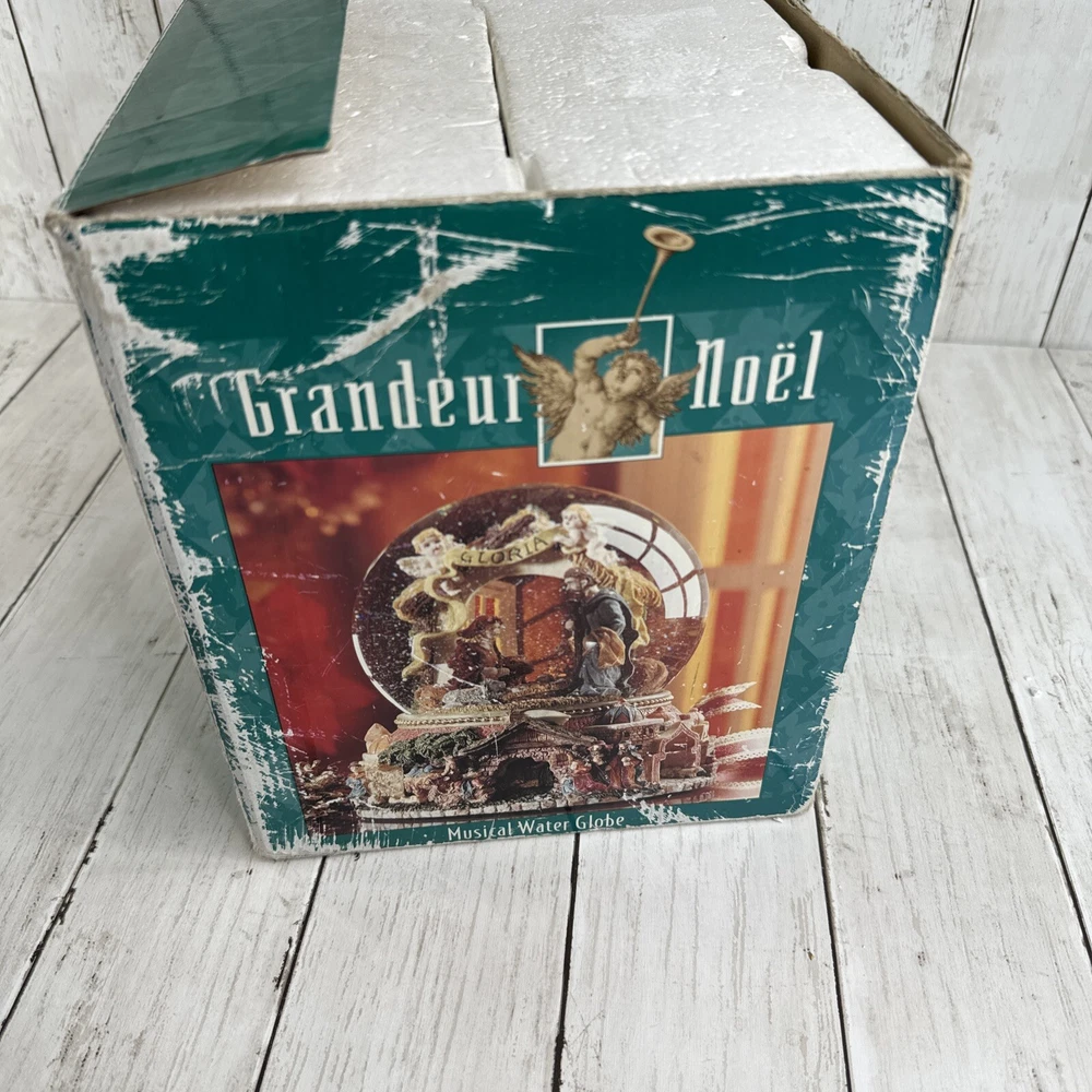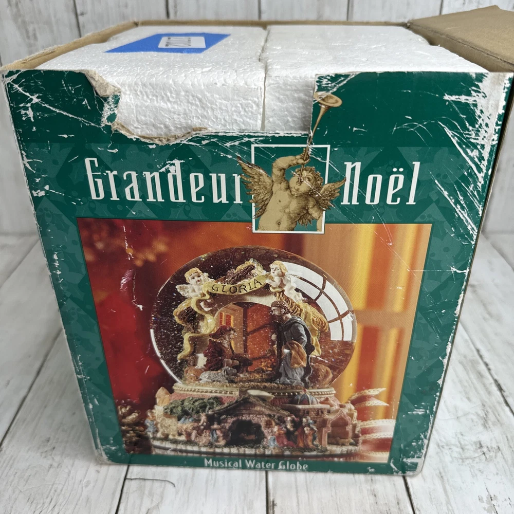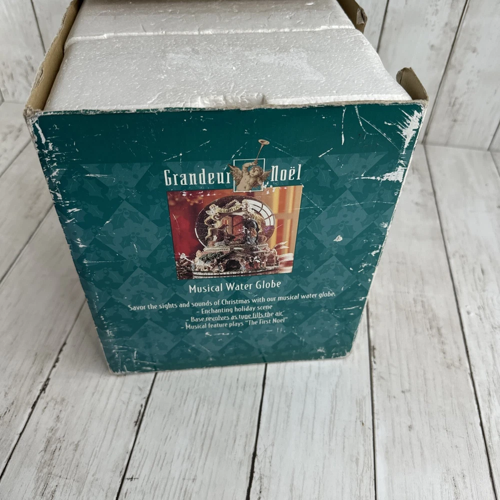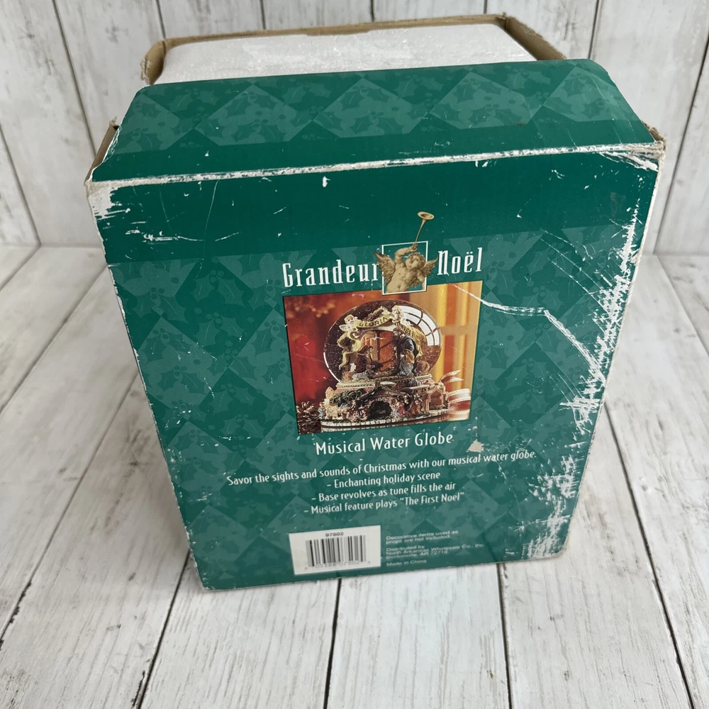GRANDEUR NOEL Nativity Scene Musical Water Globe the First Noel Base Revolves Some water evaporation. No other flaws found. Comes with original box and foam insert. Box does have shelf wear and is missing the lid Used item stored in a smoke free home One business day handling. Sales on Friday, Saturday, or Sunday are mailed on Monday.