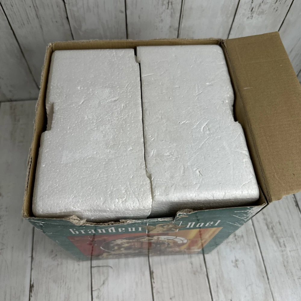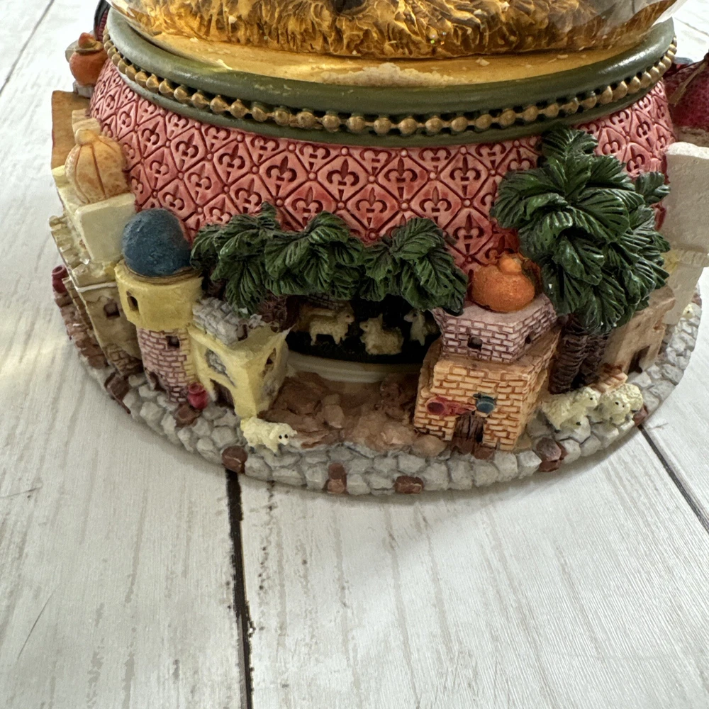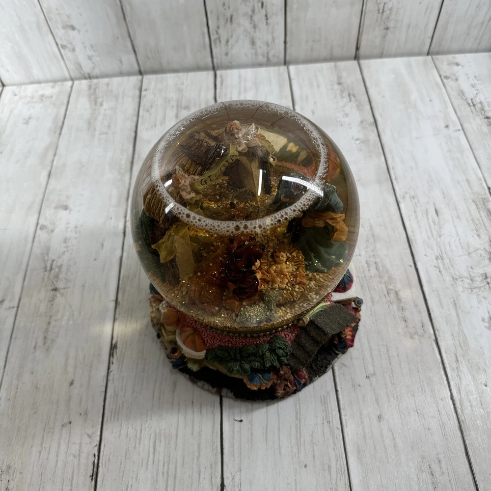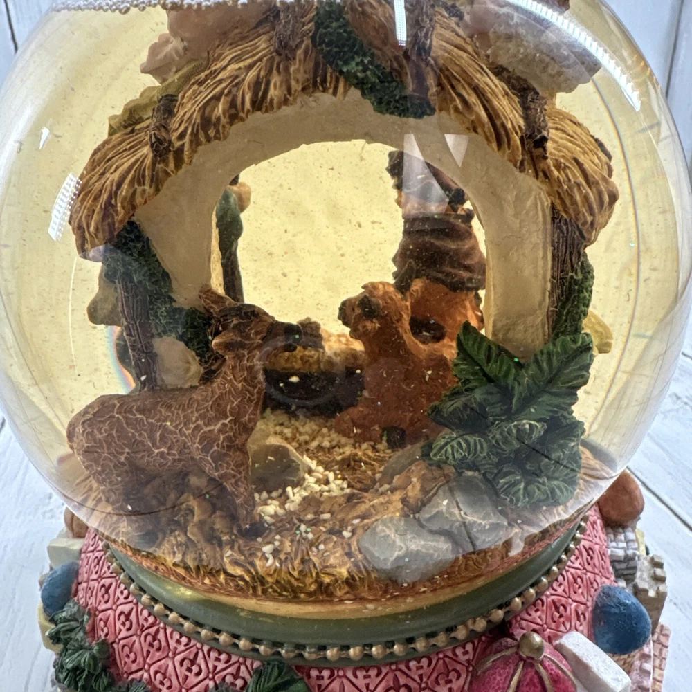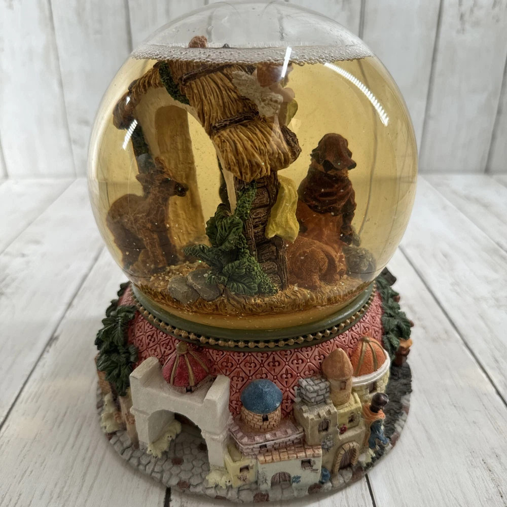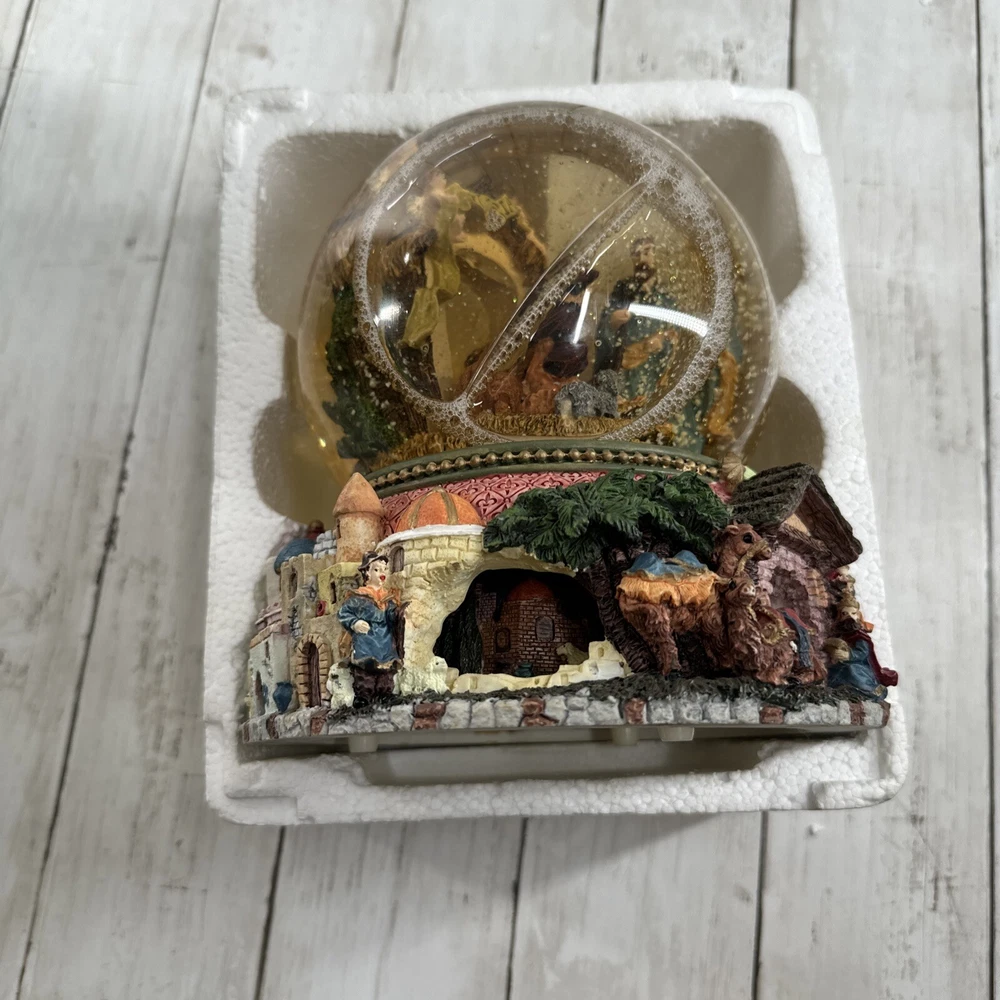GRANDEUR NOEL Nativity Scene Musical Water Globe the First Noel Base Revolves Some water evaporation. No other flaws found. Comes with original box and foam insert. Box does have shelf wear and is missing the lid Used item stored in a smoke free home One business day handling. Sales on Friday, Saturday, or Sunday are mailed on Monday.