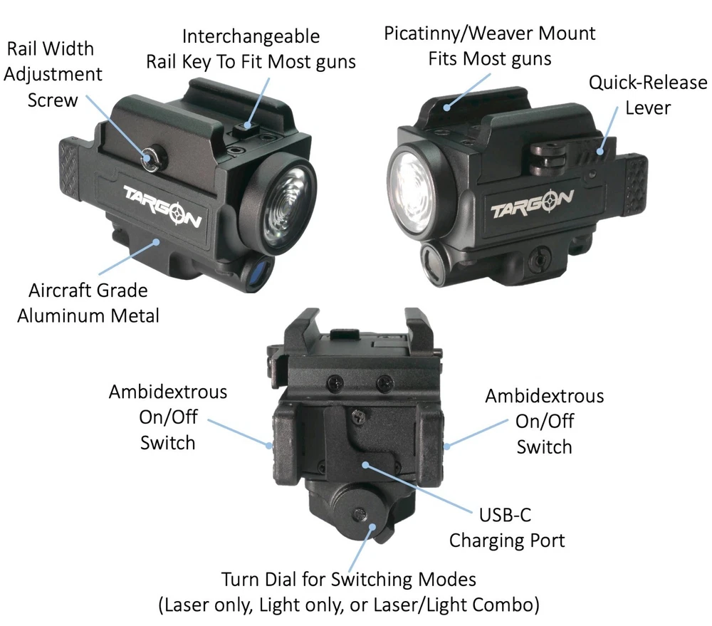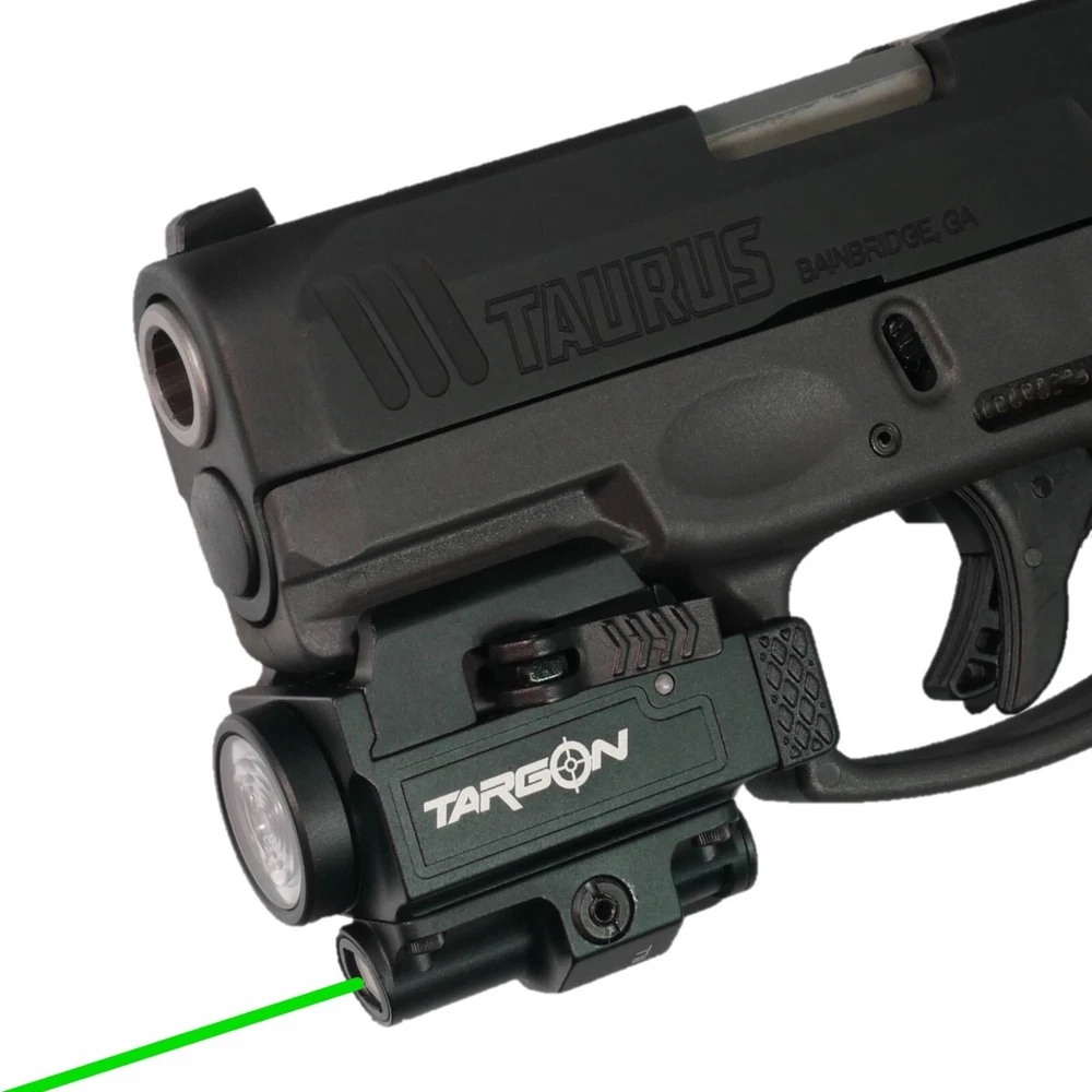 TGX35 GREEN LASER LED TACTICAL FLASHLIGHT COMBO 800 LUMENS Extremely High-Quality, 12-month Warranty! PRODUCT DESCRIPTION ● Powerful Green Laser and LED Flashlight Combo ● Super Bright 800 Lumen Output LED Flashlight ● Three-position Mode Selector Switch for Laser Only, Flashlight Only and Laser + Flashlight Modes ● Quick Mount/Release Lever (no need for tools) ● Ambidextrous Switch for Left- and Right-Hand Operation ● Constructed with Aircraft Grade Aluminum Metal ● Shock, Impact and Gun Recoil Resistant Design ● Dust Proof and Water Resistant ● Integrated Weaver/Picatinny Mounting Deck ● Designed to Fit Most Handguns, Rifles and Shotguns with a Rail System ● 12-month Factory Warranty MAIN SPECIFICATIONS ● Laser Type: Green ● Laser Output Power: 5mW (Most Powerful Green Laser Allowed by Law) ● LED Light Output: 800 Lumens (Brighter Than Most Others Sold on eBay) ● Laser Spot Size:1.5” @ 100ft ● LED Flash Beam Distance: ~500ft ● Laser Operating Temp.: -4ºF (-20C) to 131ºF (55C) ● Dimensions: 2”(L) x 1.3”(W) x 1.5”(H) ● Material: Full Aircraft Grade Aluminum Metal Construction ● Net Weight: 2.5oz ● Battery Type: Built-in Rechargeable Lithium Battery WHAT'S IN THE BOX ● TGX35 Green Laser LED Flashlight Combo ● Built-in Rechargeable Battery ● USB-C Charging Cable ● 5 x Replaceable Rail Groove Adaptors ● T6/T8 socket head wrench (for adjusting laser windage and elevation) ● User Manual ● 12-month Factory Warranty GUN COMPATIBILITY ● Fits most full-size, compact and subcompact handguns, pistols and rifles. ● Glock : 17, 17L, 19, 19X, 20, 21, 22, 23, 24, 29, 30, 34, 35, 36, 37, 38, 40, 41, 44, 45. All Glock models with a rail. ● Taurus : G2, G2c, G3, G3c, PT111, TH9, TH40, TX22, PT92, PT845 ● Smith & Wesson: Fits all full size and compact M&P and M&P M2.0 9 and 45, M&P 10mm SD9, SD40, SD9VE, SD40VE, 9 and 380 Shield EZ. Will NOT fit M&P Shield. ● Beretta: APX (full size only), PX4 Storm (full size), 92X (full size and compact), 92 FS compact, 96A1, M9A1, M9A3, M9A4 ● Sig Sauer: P220, P226, P229, SP2022, and P320 (M17, M18, Nitron compact, Nitron full-size, X-Carry, XFive Legion, XFull), Mosquito (a.k.a. GSG Firefly). Will not fit P365s, P320 Xcompact and nitron subcompact ● Walther: Creed, all PDP models (4" and 4.5" barrels), all PPQ models (22, 45, M1, M2, Navy SD, Q4, Q5), CCP, PK380. Will NOT fit PPQ SC. ● Ruger: Security-9, 9E, SR9, SR40, SR45, American Duty, Mark IV tactical, 57 ● Springfield Amory: Fits all XD, XD-M, and Elite models with 3.8" or longer barrel. Fits Hellcat Pro but will NOT fit Hellcat or other models with barrel lengths shorter than 3.8" ● CZ: P-01, P-07, P-09, P-10 (C, F, SC), 75 SP-01, AccuShadow 2. Will NOT fit P-10S and P-10M ● FN: FN 509, FNP-9, FNS (9, 9C, 40, 40C), FNX (9, 40, 45), Five-seveN ● Canik: METE (SFX, SFT), TP9DA, TP9 Elite Combat, TP9 Elite SC TP9SF, TP9SFx, TP95 (A, F, Fx, F Elite). ● Kel-Tec: P50, PMR-30, CP33 ● HK: HK45, P30, P2000, VP9, VP9 Tactical. Will not fit P2000SK ● Sar USA: Sar 9, Sar 9 SP, K2 45 ● Remington: RP9, RP4 ● Mossberg: MC2c ● Stoeger: STR-9 ● Tisas Zigana PX-9 ● Arex Defense: Rex Alpha, Rex Zero 1, Delta Gen.2 L ● Grand Power: K100, K22S, LP380, P1, P380, Q1, Q100, X Calibur, ROXOR ● Steyr Arms: L9 A1, M9-A1 ● IWI: Masada ● Zastava : EZ9, EZ40 ● Staccato: C, C2, P, XC, XL ● Fits many more full-size and compact handguns. The list is constantly changing so please feel free to contact us to confirm compatibility with your handgun model WHY PURCHASE FROM RANGEFINDERSUSA ● RangefindersUSA has been selling high quality laser products since 2004 ● We only sell laser products that pass our strict criteria for quality and value ● We stand by our products and offer an unrivaled 12-month warranty ● We believe in honesty and integrity when it comes to doing business ● We have a 100% customer satisfaction record and we will continue to work hard to ensure our customers are completely satisfied with their purchase experience