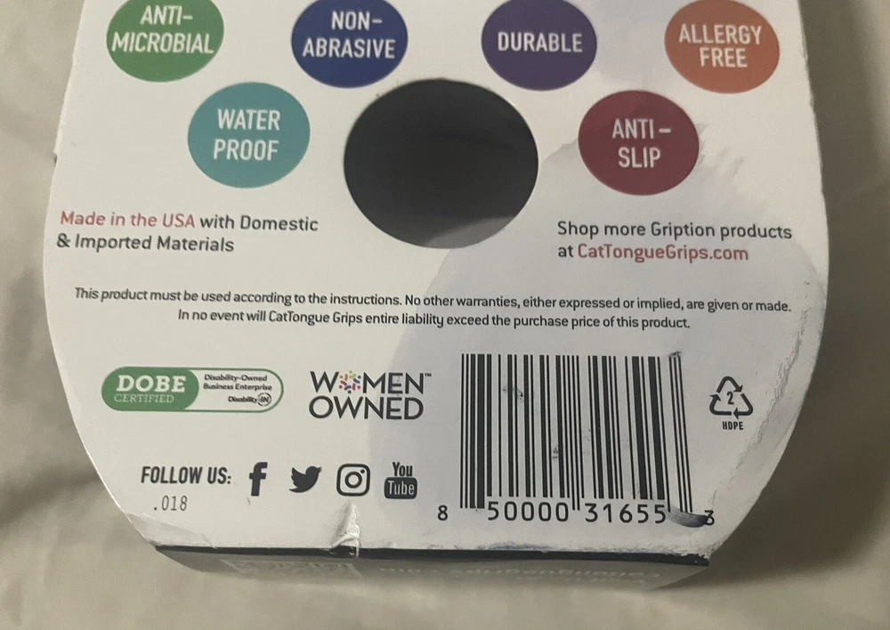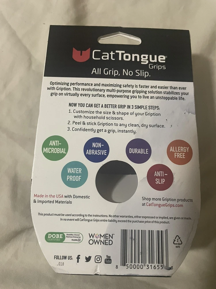 One new roll. Shipping $FREE Introducing the latest addition from Cat Tongue - GRIPTION Cat Tongue Grips! This non-abrasive anti-slip grip tape is perfect for a variety of surfaces, providing a strong and secure hold. Waterproof. With its unique formula, this security tape is perfect for businesses and industrial settings, as well as for use in adhesives, sealants, and tapes. The brand name "Cat Tongue" is synonymous with quality and reliability, and this product is no exception. Order now and experience the strength and security of GRIPTION Cat Tongue Grips!