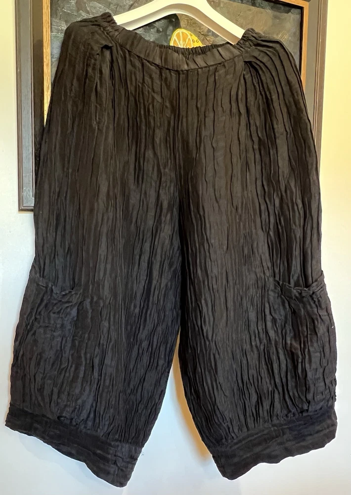 GRIZAS Women 60% Linen 40% Silk Pants are designed with a wide-leg, relaxed fit and a high-rise elastic waist, making them comfortable for casual wear or travel. The pants feature a solid black color in a chambray fabric with lage pockets for added style and convenience. Made of a linen and silk blend, these oversized pants are perfect for a relaxed and chic look in size Medium with a 30” to 40" (max stretch) waist size. Excellent condition. Please check my other listing for a matching blouse.