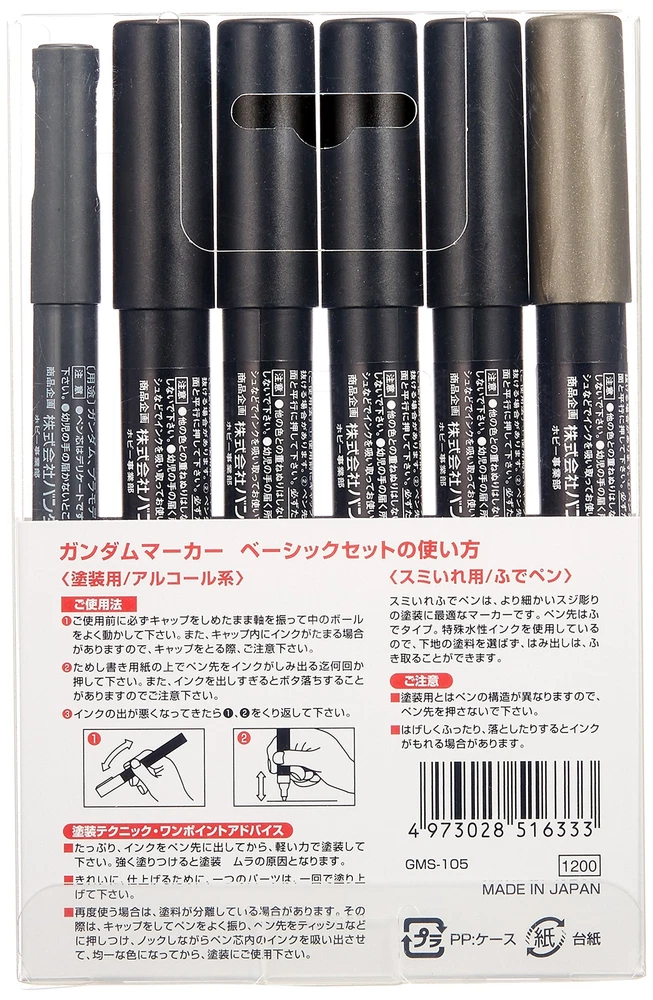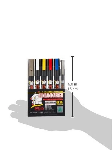 Product Description Mr.Hobby Gundam Marker Basic Set (Set of 6) From the Manufacturer A pack of 6 easy to use paint markers that come in a variety of colors for use on Gundam models and other plastic model kits. Colors include gray, white, yellow, blue and red and 1 fine tip gray marker 5 Chisel type marker tips and 1 Fine tip marker for panel lines Paint can aso be extracted into a small tray to be handbrushed on