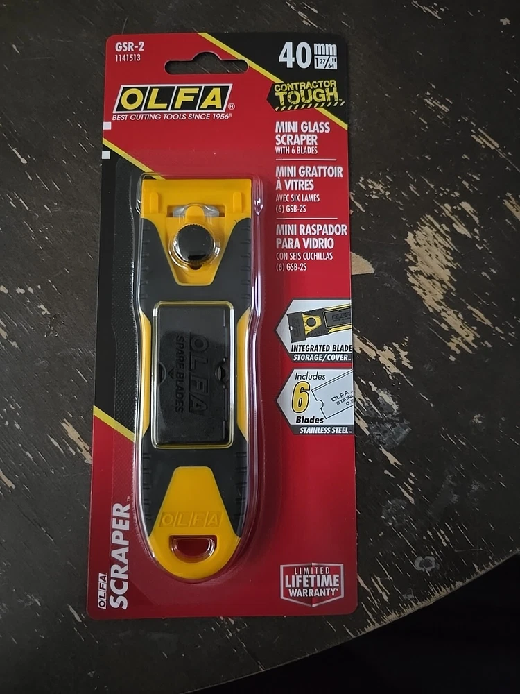 Items photographed will be the exact item shipped to buyer. I currently have 7 tools available. I will be offering a bulk discount as well. All tools are unopened and brand new The GSR-2 OLFA Hand Held Multi-Grip Glass Scraper is a versatile tool designed for tasks like scraping glass surfaces. It features a stainless steel blade with a width of 0.25mm and comes with 6 replacement blades. The scraper has a yellow and black color scheme, measures 40mm in length, and 18mm in width. The ergonomic multi-grip design provides comfort during use, and the product is manufactured by OLFA in Japan. Weighing 5oz, this tool is a handy addition to any toolkit for various hand tool projects.