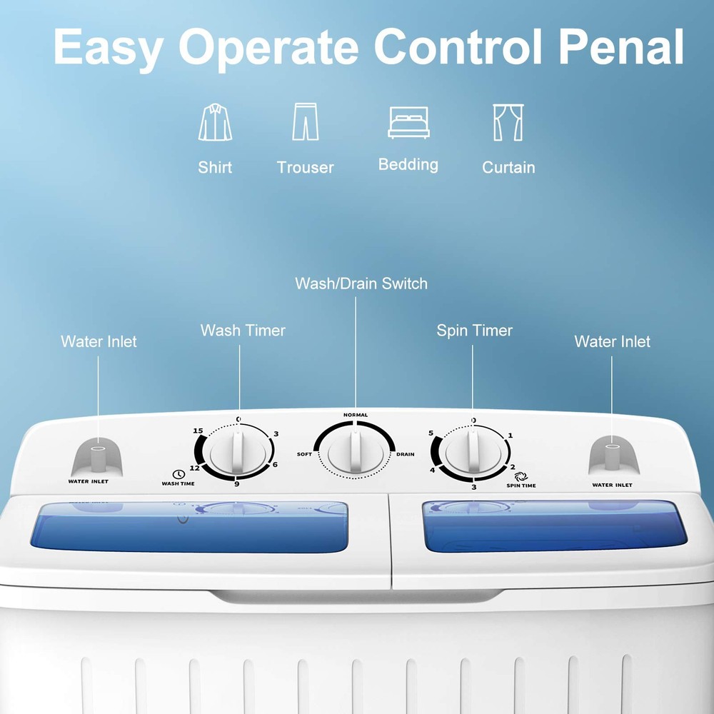 【Easy to Operate】: This portable twin tub washing machine is so easy to use and operate and helps you save losts of time and money on laundry mat and hand washing. 【Powerful Capacity】: Large capacity for washing and drying. Rated washing capacity: 12 lbs. Rated spinner dryer capacity: 8 lbs (half of the washing capacity, you may spin twice). The washing machine is perfectly suitable for home and apartment use. 【Relieve Hands from Hand Washing】: The maximum washing time is 15 min and the spin time is 5 minutes per load. Based on futures of your clothes, you can choose the most suitable time for appropriate washing. Compared with standard washing, this washer will give you much more freedom and options. 【Space Saving Design】: Although having large capacity inside the tubs, the lightweight washing machine is easy for you to move. Compact and mini design enable it to be placed at any corner. 300w washing power & 110w spinner provide sufficient power for washing and drying. 【Compact Twin Tub Washing Design】: Whatever for house or apartment use, the washing machine can work well. The filter net on the washing barrel can easily filter while washing, and it can be easily pulled off if the tub needs cleaning. It also comes with a cover plate which can effectively avoid high speed throw away while drying the clothes. Easy assembly is required with complete hardware inside the package.