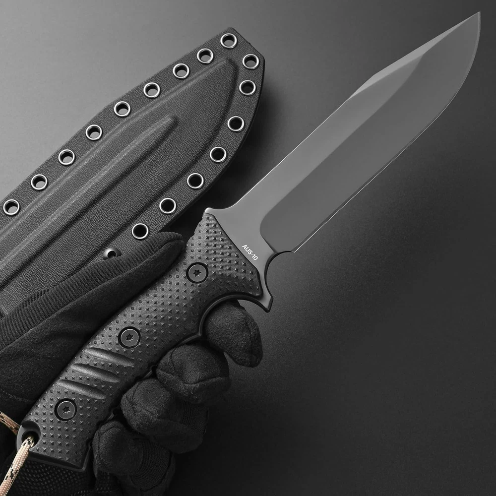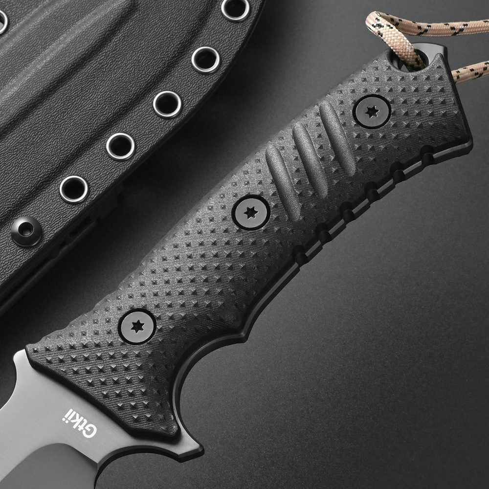 Knife Dimensions: 12.9 inch (33 cm) overall length , Blade length: 6.4 inch(16.3cm), Handle length: 6.5 inch(16.7cm) ,Blade thickness: 6mm, Blade width: 3.8cm(1.5 inch),Handle Thickness: 1.8cm, Knife Net weight :376g(13.2 oz), Weight with Kydex sheath: 533g ( 18.8 oz ) EXQUISITE Nylon Fiberglass HANDLE: The better ergonomic High Hardness Nylon Fiberglass handle provide a durable, security grip and increase concealability and multi-environment functionality. This new type material handle is better than G10 handle , it's temperature resistant, has good abrasion resistance, is anti-slip, moisture-proof, does not expand or contract due to normal temperature and moisture exposure, and is exceptionally rugged. Premium AUS-10 Steel Blade: Blade made of AUS-10 stainless steel,hardness 59-61HRC,using stone wash and Titanium coating process ,blade finish is pretty smooth and even,sturdy build cool beefy blade , provides razor sharp for ultimate precision cutting performance and excellent edge retention. Durable Kydex Sheath: Safe high-strength lightweight ,high temperature resistant and corrosion resistant imported kydex material sheath for easy portability and everyday carry. The sheath is tight, with no rattle, but still allows quick deployment.It has an adjustable clip to fit the width of your belt for a good snug grip. EDC Camping Fixed Knife:The highest quality material keep the knife a long service life. Gtkii knife professional outdoor camp knives is fully qualified,excellent choice for EDC tools& Hunting, Fishing, Camping, Hiking, gardening,electrician tool, field living , Emergency Rescue, Adventure,Collection and all Outdoors &Sports activities, it is a nice and cool gift for man,husband, boyfriend, father, brothers, good friends. Product Description GKTII is our brand name ,which means great knives. we will produce and provide a serises of good quality cool style fixed knives , folding knives and claw knives to the knife market, at the same time all our knives will be with a reasonable ,affordable offer, you can get an attractive knife from us without breaking your bank account. premium AUS-10 stainless steel Full Tang Straight knife with thick handle is robust built, more stronger and more powerful, qualified for almost any task from home using ,Kitchen, gardening , farm, ranches, electrician tool, tactical to outdoor Jungle, camping, hunting, hiking, fishing, survival, adventure , bushcraft,field living challenge . Better ergonomic High Hardness Nylon Fiberglass handle provide a durable, security grip and nice whole knife balance , effortless with more confidence when put it in many kinds of heavy using. a thick full tang make it more powerful. it will definitely be qualified for outdoor living, jungle hunting, wood choping, camp works. Classical and cool style beefy blade is solid build up and razor sharp, cool looking and Powerful!! it will definitely be a cool thing to show off among your friends, if you give it to them as an amazing gift , they will be very happy and excited to take it and thankful from their deep heart!
