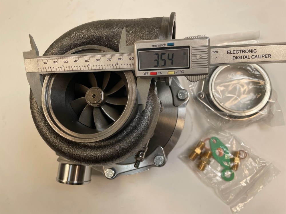 Turbo model for G-Series G35-900 2-V-Band horsepower:550-900HP Fit engine displacement 2.0-4.0L 9 blades Point billet compressor wheel bearing type:Ceramic Dual ball bearing cooled type:water and oil cooled oil restrictor & water fittings included Includes Oil Feed (1mm) Restrictor Fitting to -4AN Includes two Coolant Fittings to -6AN Includes Turbine Housing Outlet V-Band Clamps Compressor details a/r 0.72 anti-surge air inlet 4" air outlet 2.0" inducer 61.75mm exducer 76.60mm Compressor Trim: 65 Turbine details a/r .83 Turbine Housing Inlet: 3 Inch O.D. V-Band Turbine Housing Outlet: 3.55 inch (90mm)O.D. w/81mm centering ring V-Band inducer 68.00mm exducer 62.30mm Turbine Trim: 84 ****************Very Important Points******************* 1.Please make sure to open the box immediately when taking delivery, to avoid any potential issues Do NOT sign for any damaged package and report it to the couriers immediately, let the couriers sign for damage, then Contact us please! We will work with the couriers to solve shipping issues. 2.we can accepet customized order!more products you order, the price will be nice.