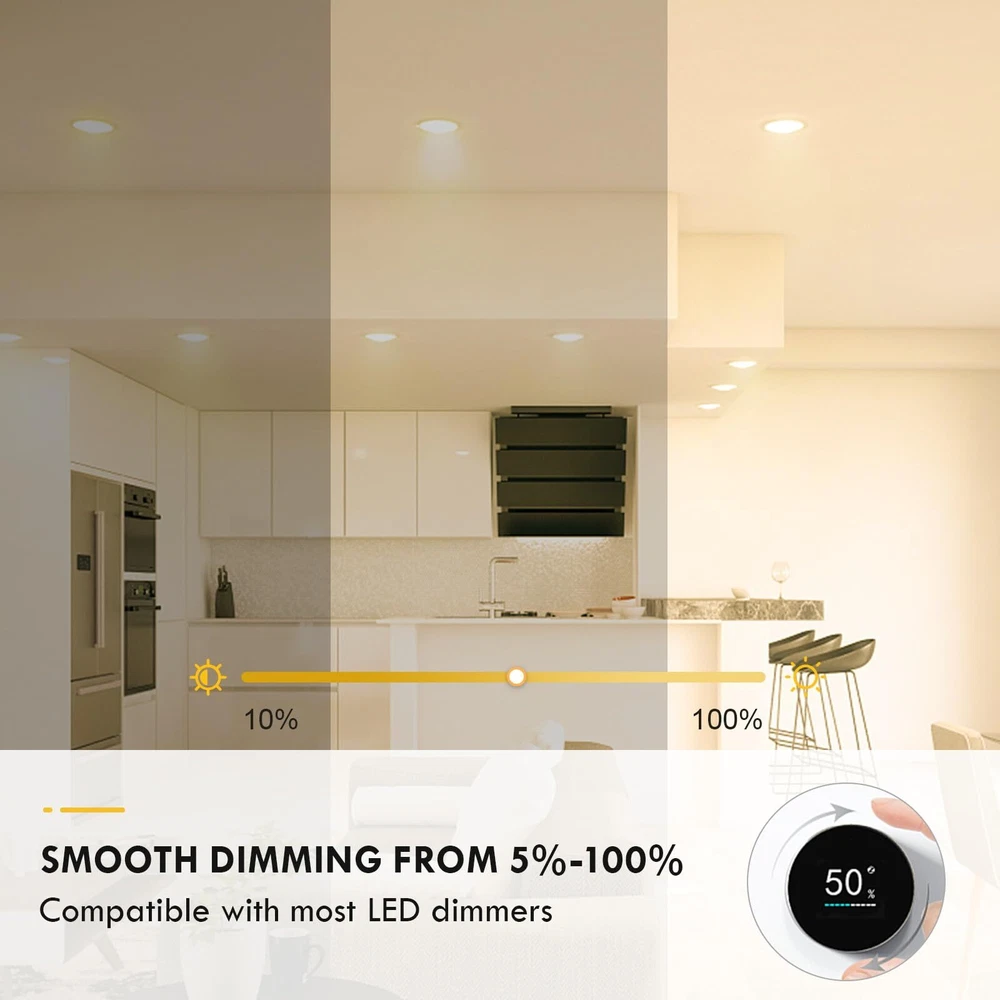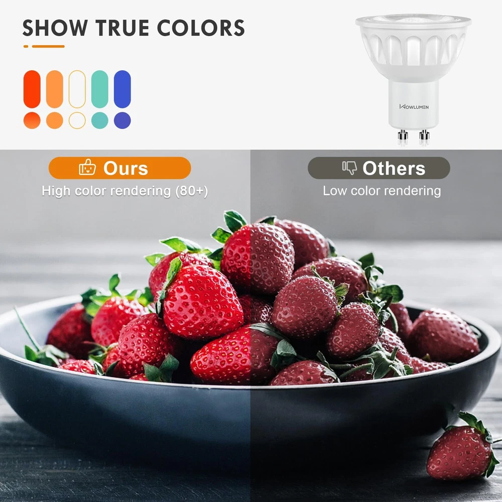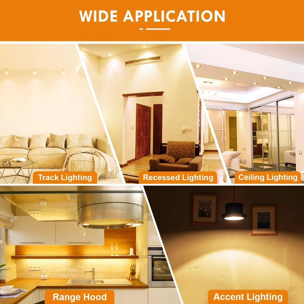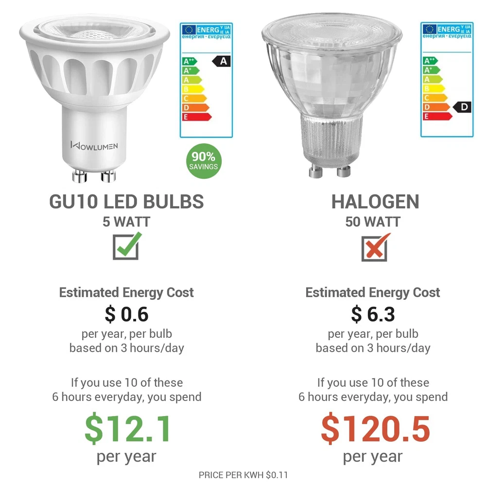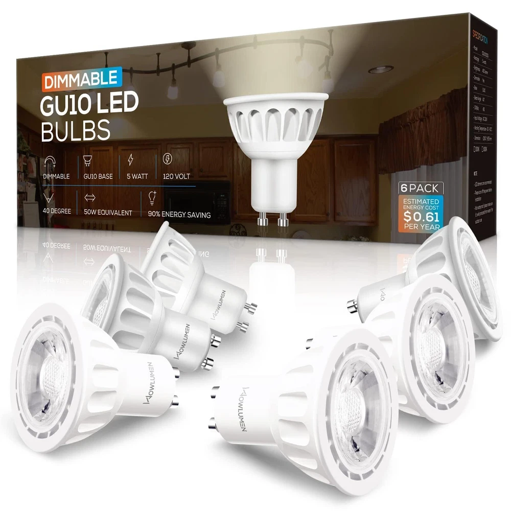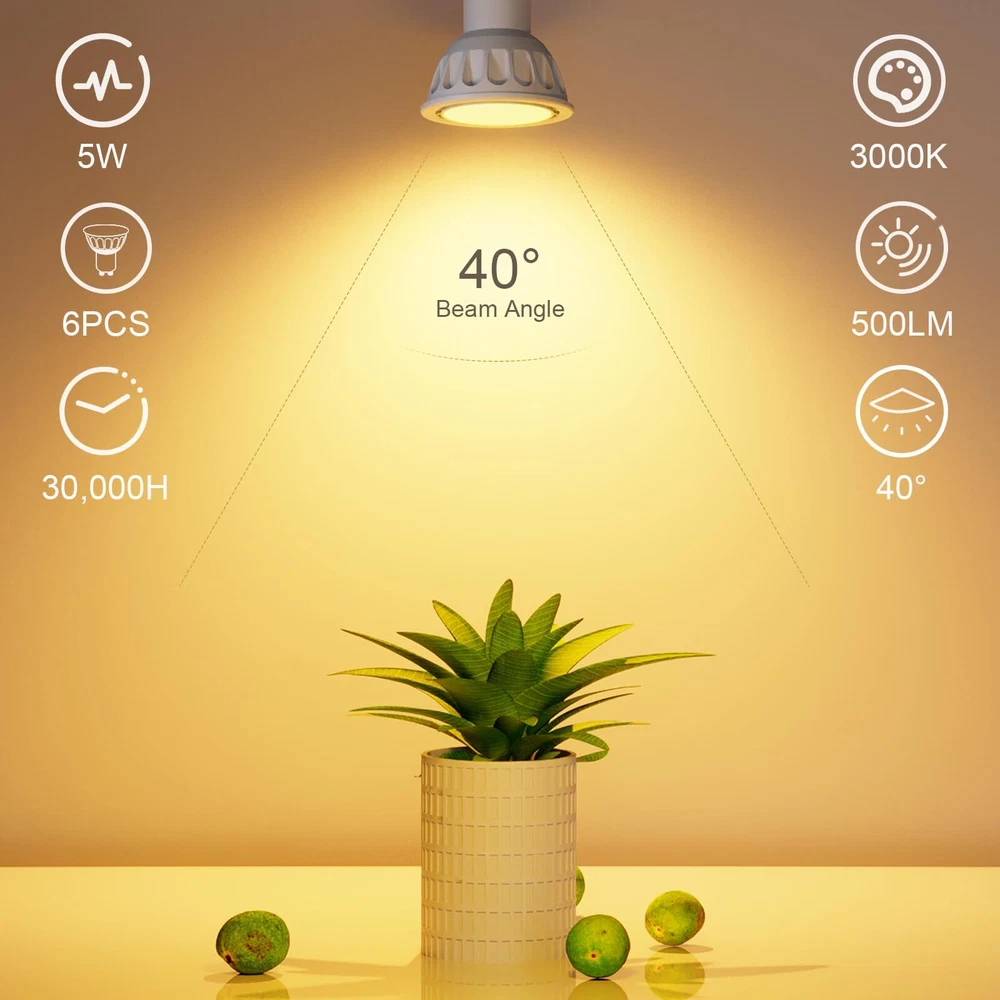 3000K WARM WHITE - With a warm soft color temperature of 3000 Kelvin, gu10 base led bulbs are the ideal light for setting up cozy and comfortable atmospheres. Provides 500 lumens of soft warm light with 40-degree beam angle, this GU10 led bulb is the perfect replacement to halogen light bulbs without harsh glare SMOOTH DIMMING & FLICKER FREE -Smoothly control the brightness of your GU10 led bulbs from 5%-100% according to your mood every time immediately, with no waiting time to adjust to any brightness. Zero flickering light, zero delay, zero buzz sound LONGLASTING - With 30,000H lifespan, each GU10 led bulb is expected to last over 10 years (based on 3 hours/day). The fire-proof plastic case and the aluminum base construction for the best heat dissipation and longer life. No mercury & no UV light means more safe for your family and the environment ENERGY EFFICIENT - Paying too much in electricity bill every month? By investing in GU10 LED bulbs right now, you start saving money right away. By switching to this GU10 led bulb, you can spend $0.61 per year per bulb only (based on 3 hours/day, 0.11/kWh) and quit the hassle of replacing your bulbs frequently 2-YEAR SERVES - GU10 led bulbs are covered by 2 year serves from the date of purchase. We are dedicating to providing ultra premium products and service to ensure our customers buy with confidence