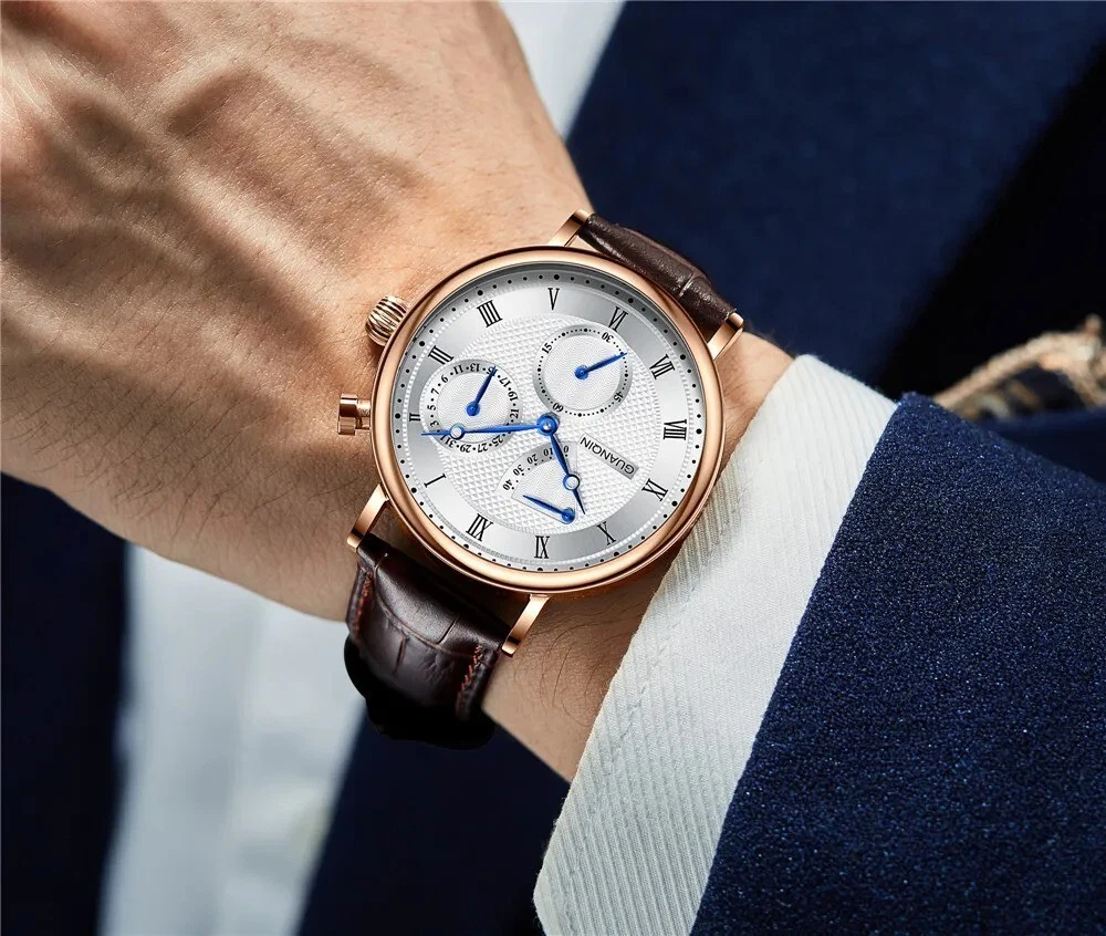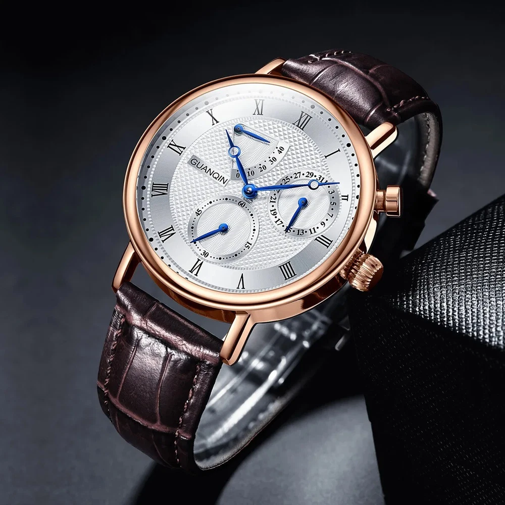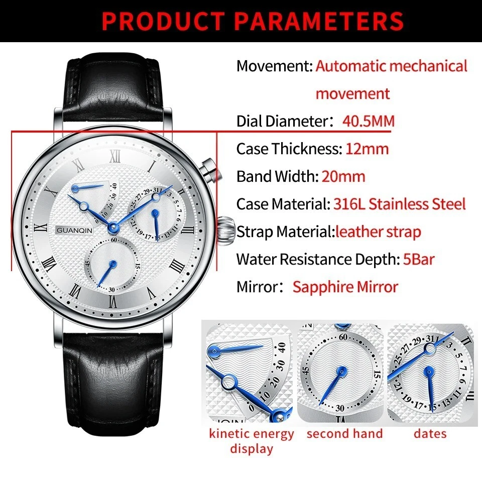 GUANQIN Sapphire MIYOTA Mechanical Automatic Men's Watch Date Sterile Dial Leather Case Shape - Round Case Thickness - 12mm Band Width - 20mm Band Material Type - Leather Boxes & Cases Material - Leatherette Dial Window Material Type - Hardlex Feature - Shock Resistant, Complete Calendar, swim Dial Diameter - 40mm Water Resistance Depth - 5Bar Clasp Type - Push Button Hidden Clasp Band Length - 22inch Case Material - Stainless Steel Style - Business Movement - Automatic Self-Wind Brand Name - GUANQIN