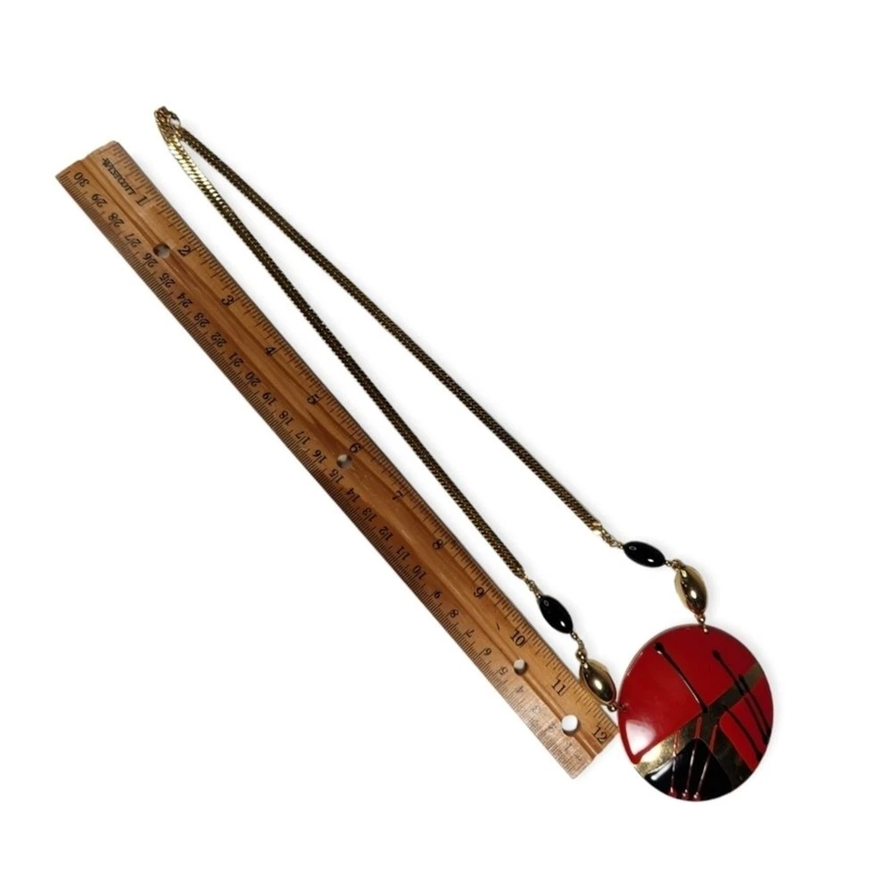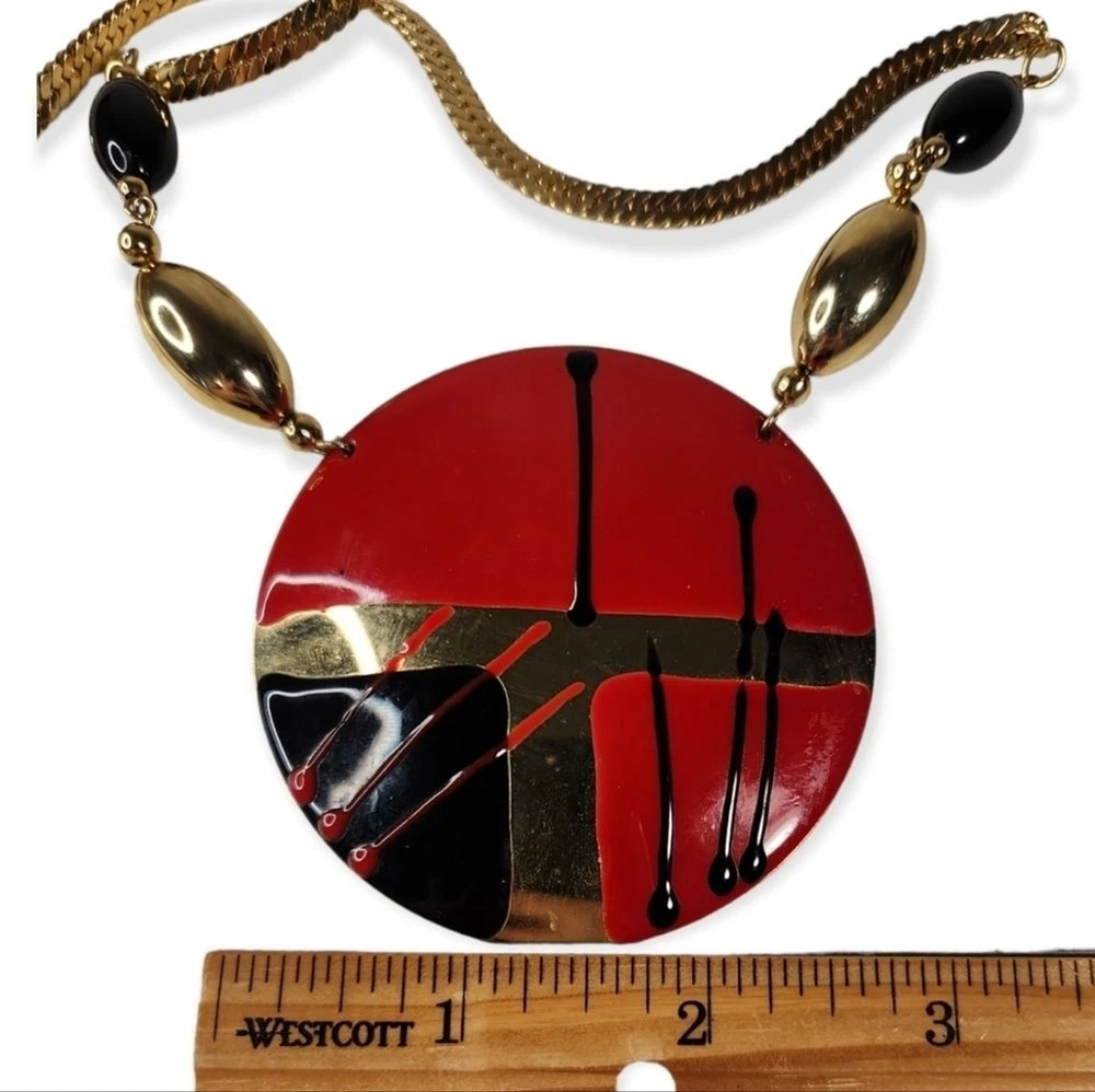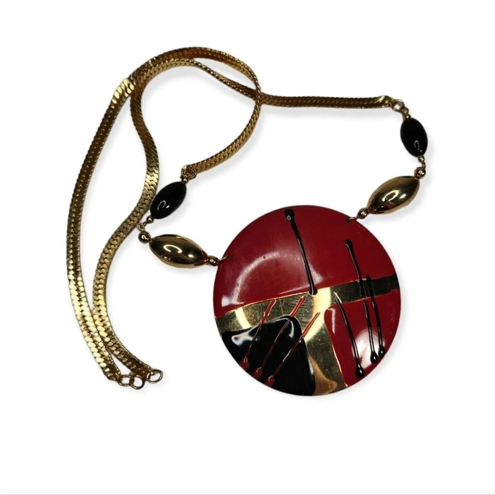 This is a very cool vintage piece - a gold tone medallion on a great herringbone chain. The disc is painted in red and black and does have some marks on the back, but overall the piece is in great shape!