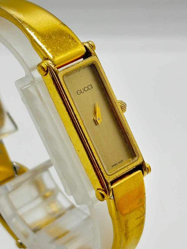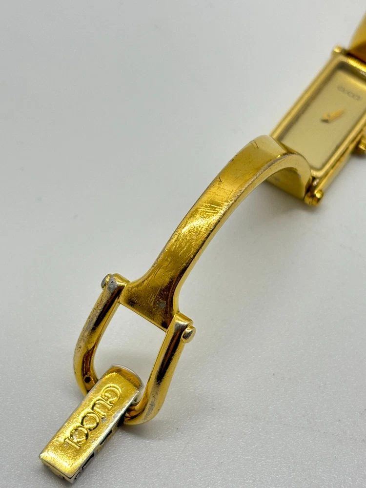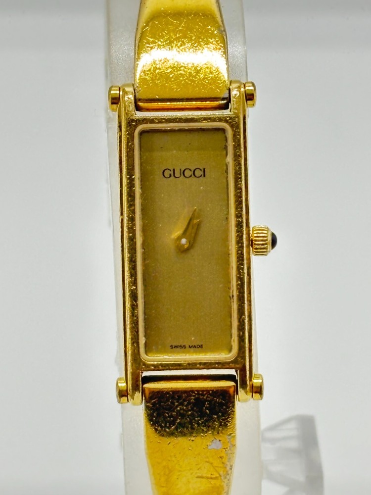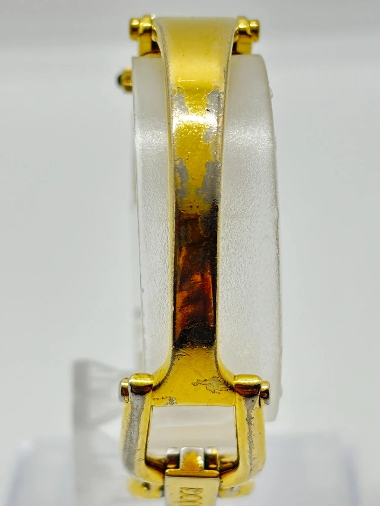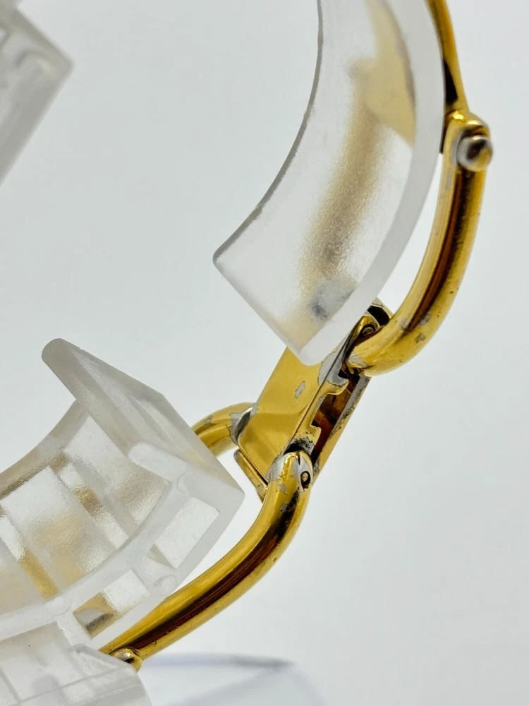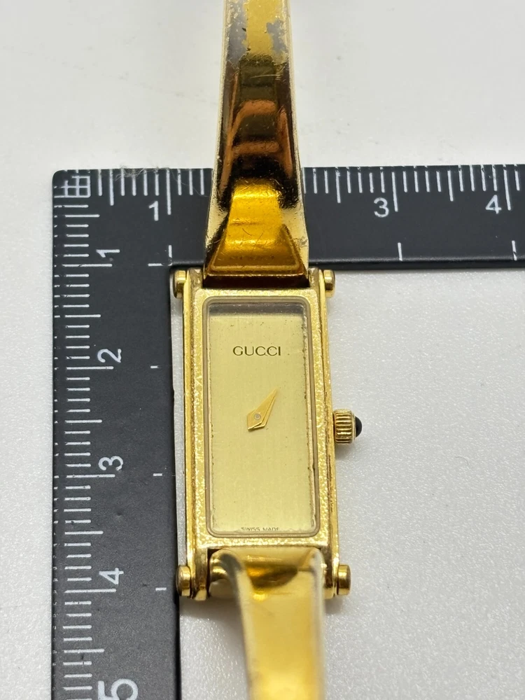 This watch is absolutely stunning—the gold and black dial gives it such a luxurious vibe! Even with some wear, it still looks elegant and works perfectly. The bangle design is unique and fits comfortably. Shipping was fast, and the seller was transparent about the condition. A great find for anyone who loves vintage Gucci pieces!