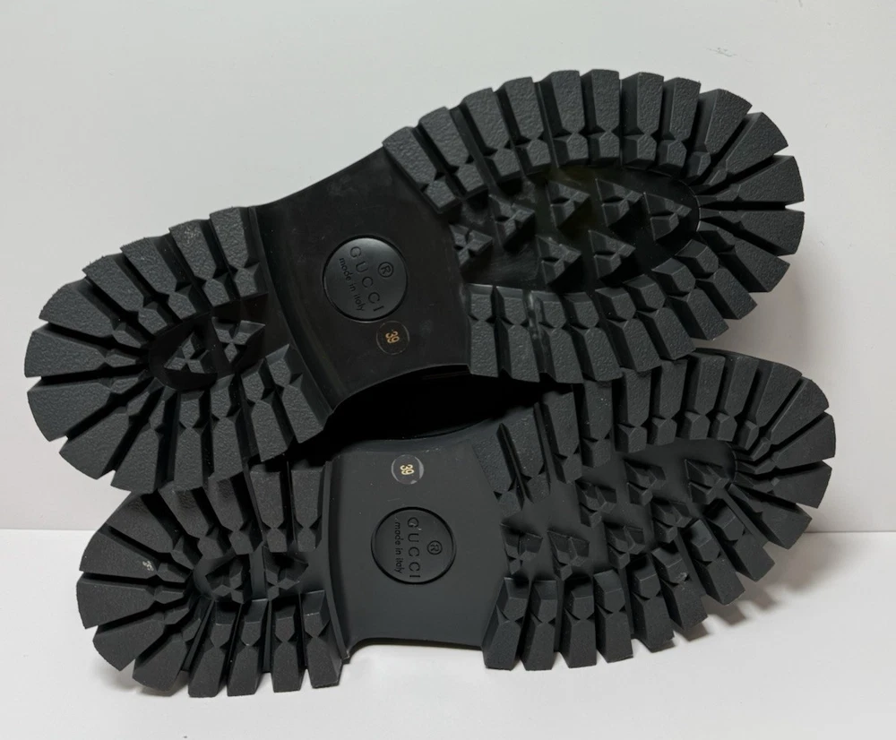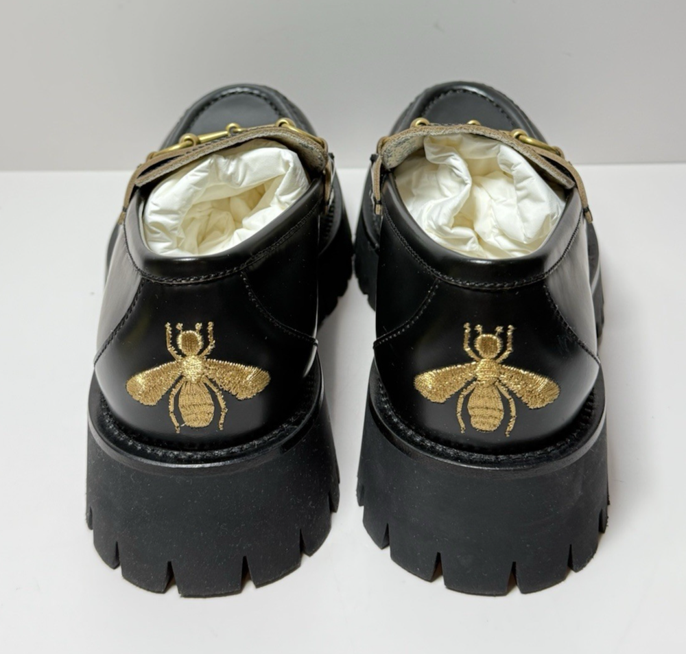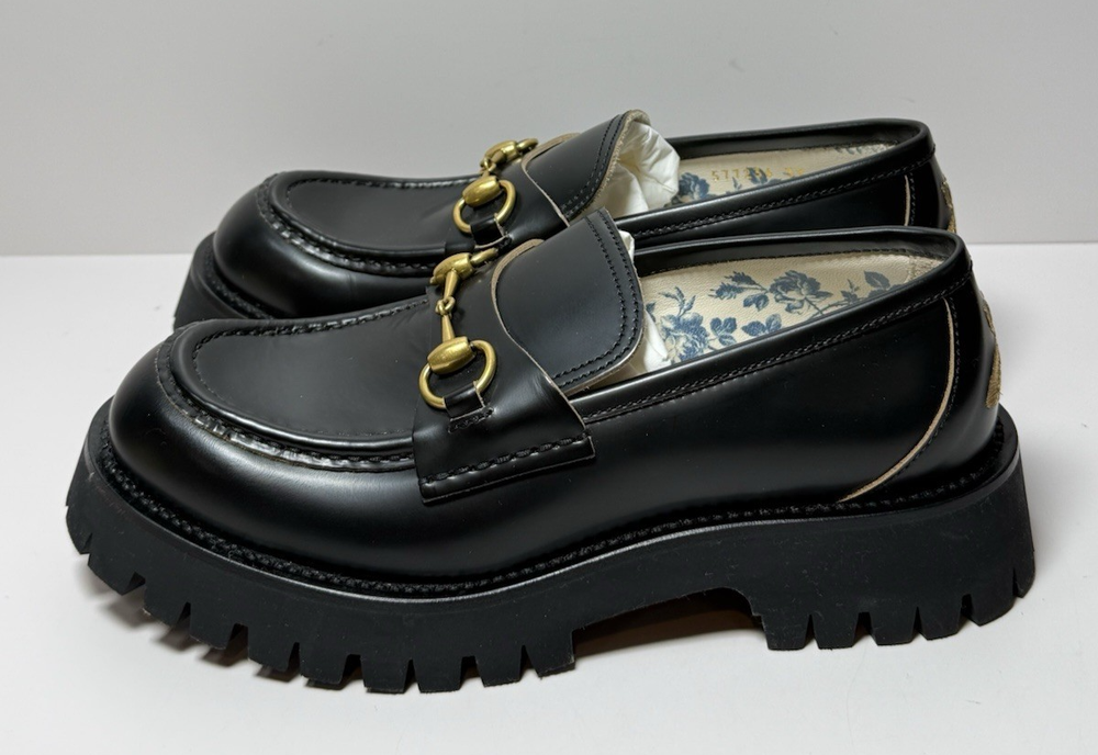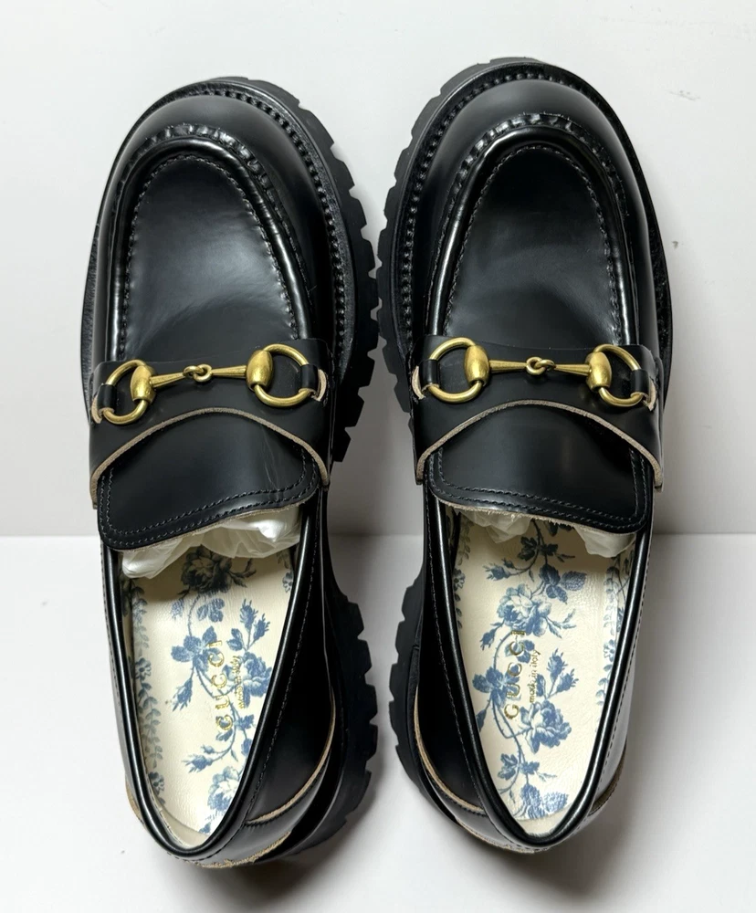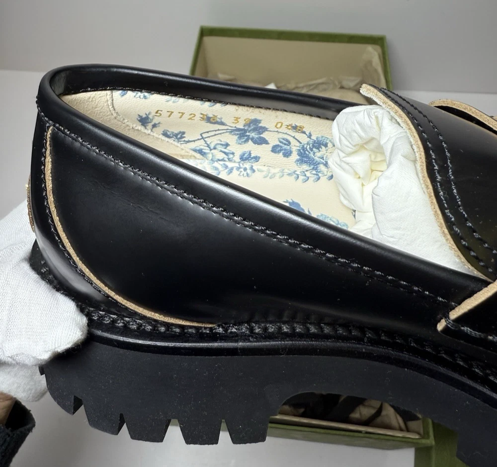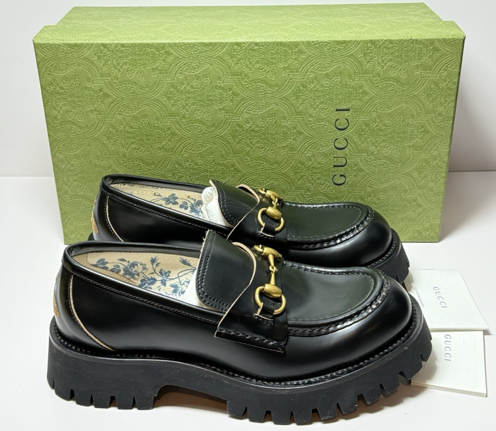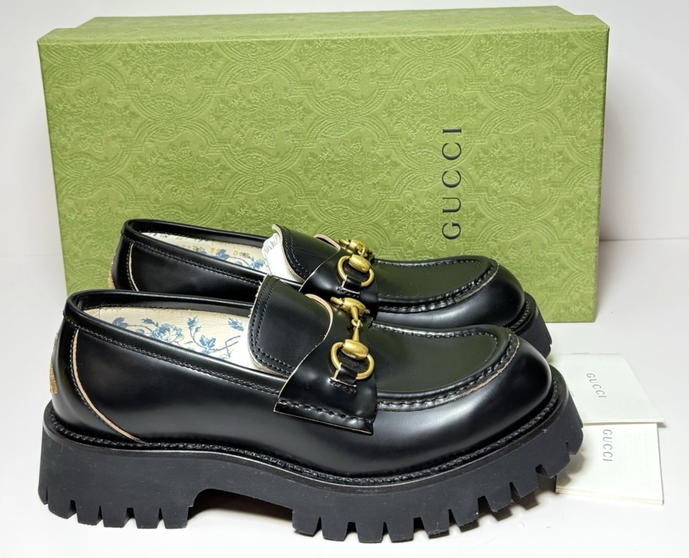 Brand New wit original box, dust bags, and original receipt, as pictured. Never worn. Black leather Women's Light gold-toned hardware Leather lining Horsebit Beige and dark brown Original GG canvas lining Rubber lug sole Flat Made in Italy