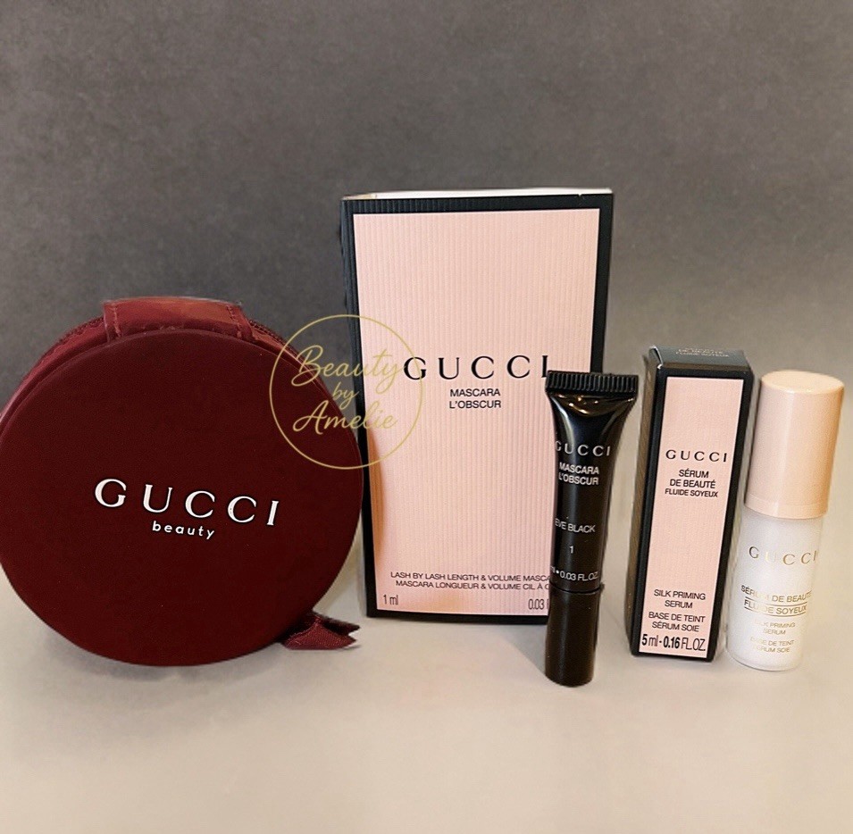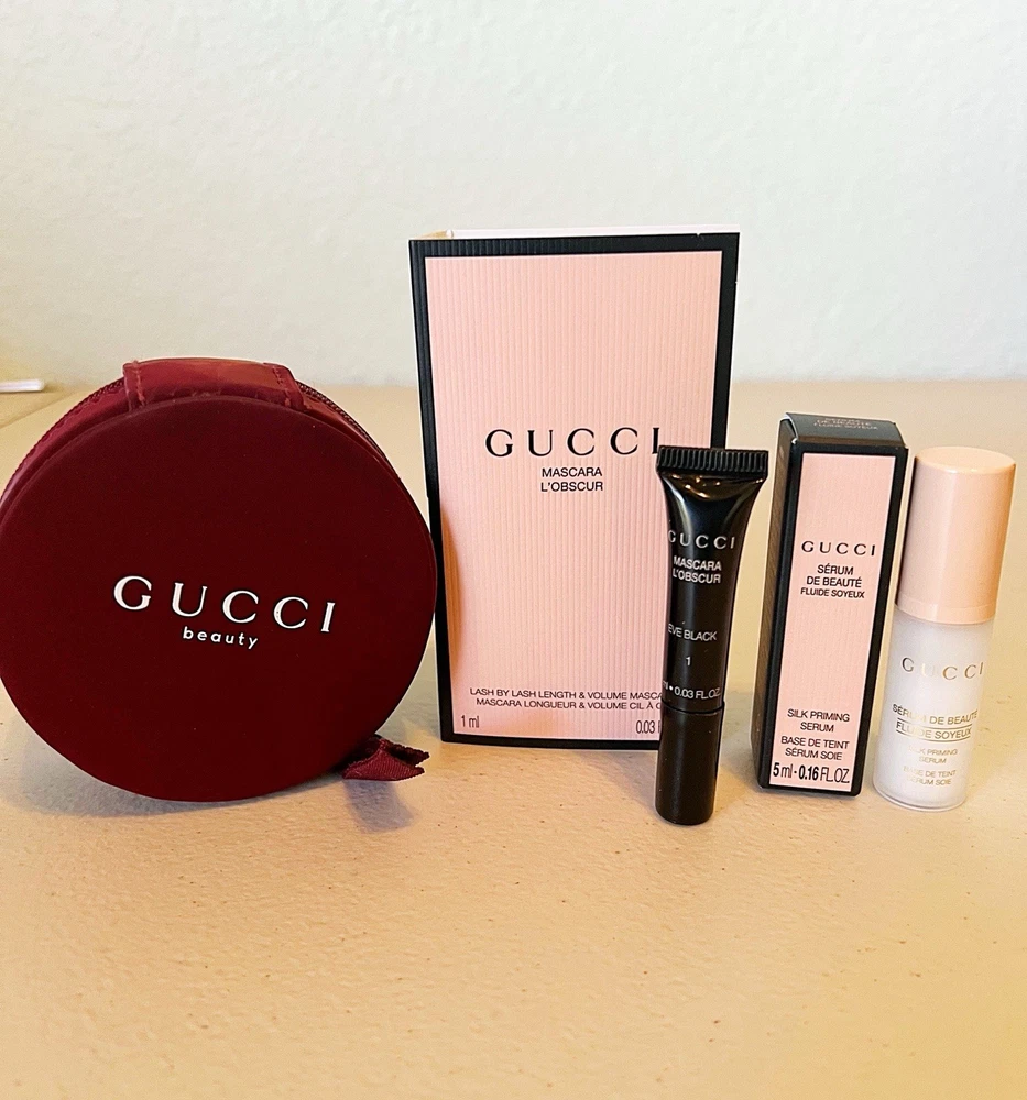 GUCCI Beauty Limited Edition 3 Pc Travel Gift Set. Mascara Gucci mini zipper pouch Silk Priming Serum