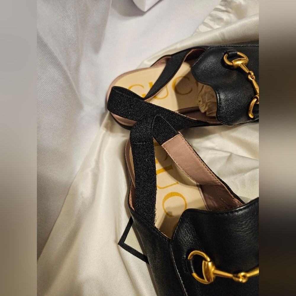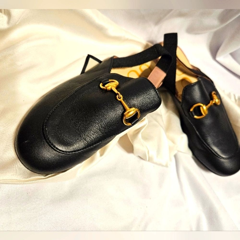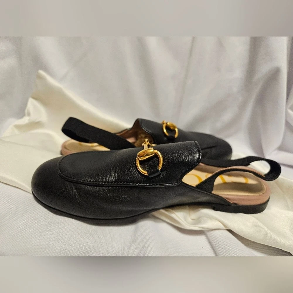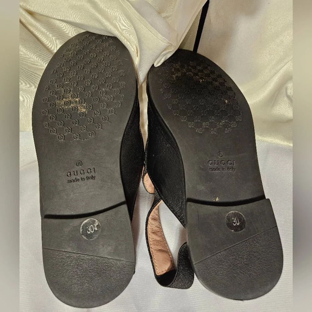 These slippers are absolutely adorable and look just like the adult version! The black leather is sleek and high-quality, and the gold Horsebit adds a luxe touch. They run a bit small, so sizing up is a good idea. Even though they were tried on in-store, they’re in perfect condition—no signs of wear. Perfect for little fashionistas who want to rock the Gucci look!