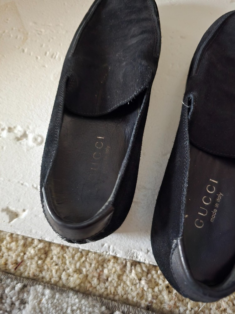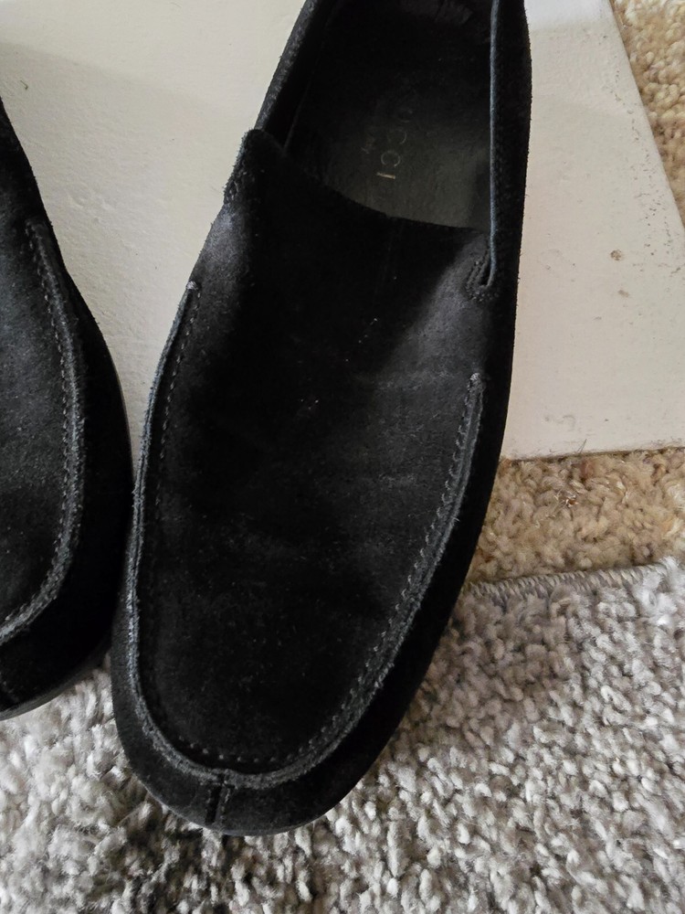 Step into sophistication with these black suede loafers from the iconic brand Gucci. Designed with the modern woman in mind, they perfectly blend style and comfort. The classic loafer silhouette is crafted to complement a variety of outfits, making them a versatile addition to your wardrobe.These flats are a size US 8.5 B, ensuring a comfortable and snug fit. The high-quality suede upper material offers durability while exuding a luxurious feel. Whether you're heading to the office or enjoying a casual day out, these Gucci loafers are sure to elevate your ensemble.