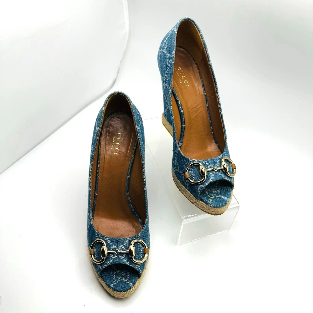 GUCCI DENIM MONOGRAM HORSEBIT WEDGES Size 37 - I’d say these are true to size Excellent used condition, box included ! Some residue on bottom soles and some signs or wear on denim. No major stains These Gucci denim monogram wedges with the classic horsebit detail combine a casual and chic aesthetic. Their espadrille-inspired rope trim and wedge heel make them a versatile choice for summer outings. Measurements are approximate . It may be helpful to compare these product measurements to a similar piece you already own. tags: fall, autumn, winter, cool weather, boho, bohemian, mini, tiered, ruffle, fit & flare, long sleeve, date night, night out, event, evening, special occasion, cocktail, dinner, career, business, work, workwear, professional, fashion, fashionable, trendy, wedding, bride, trendsetter, ootd