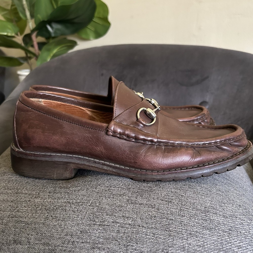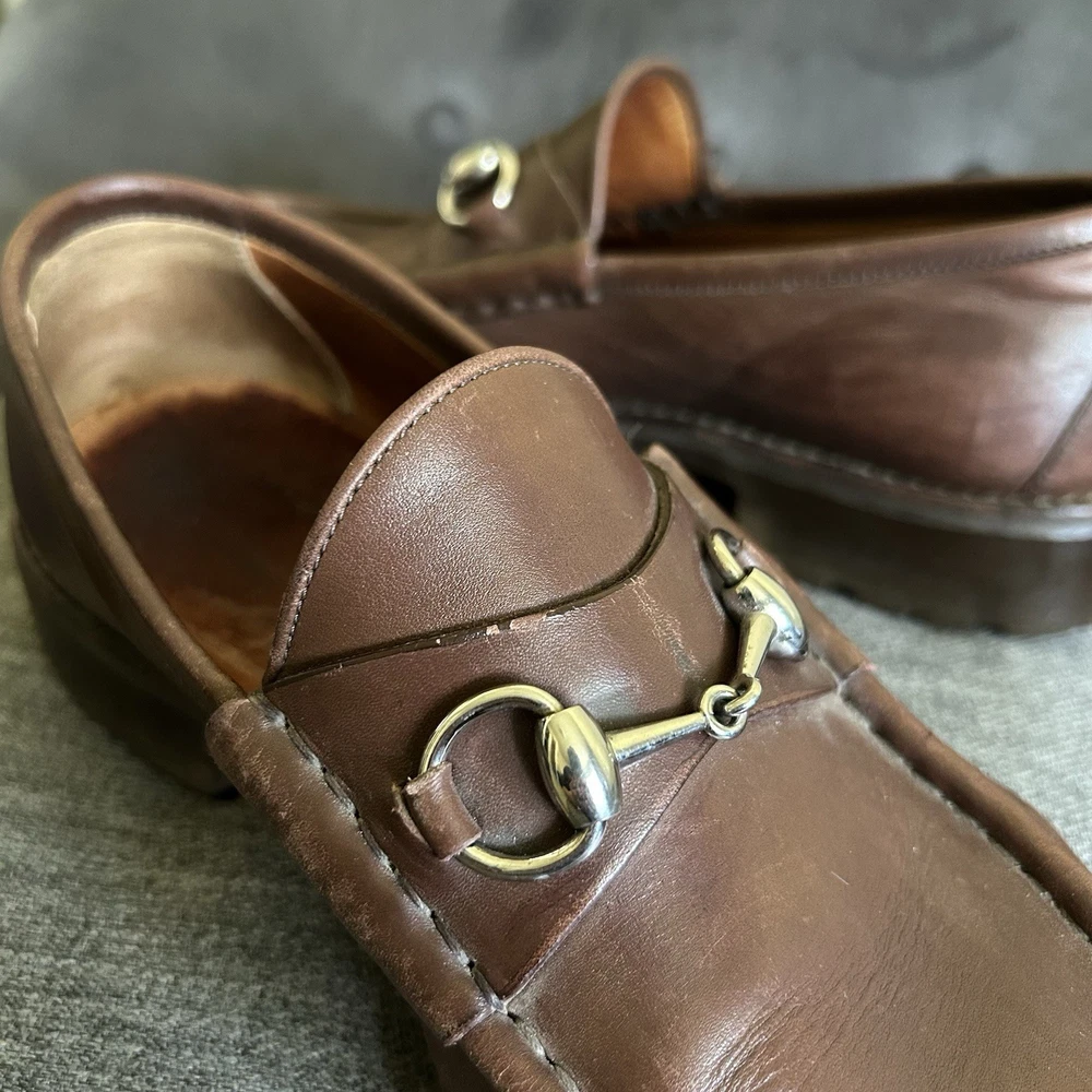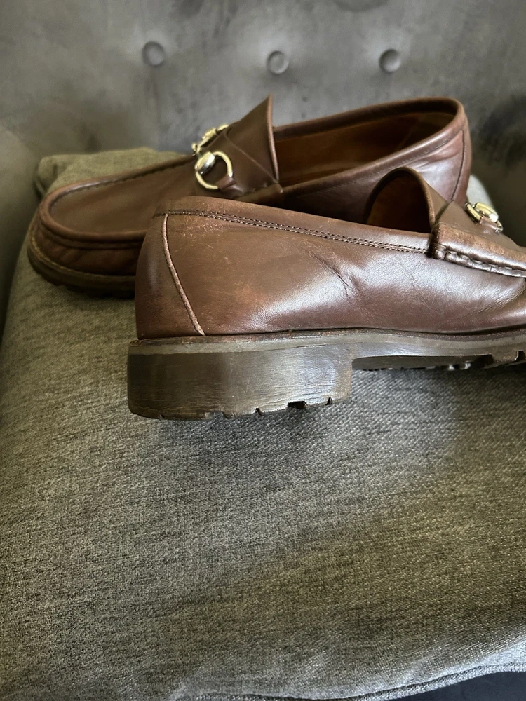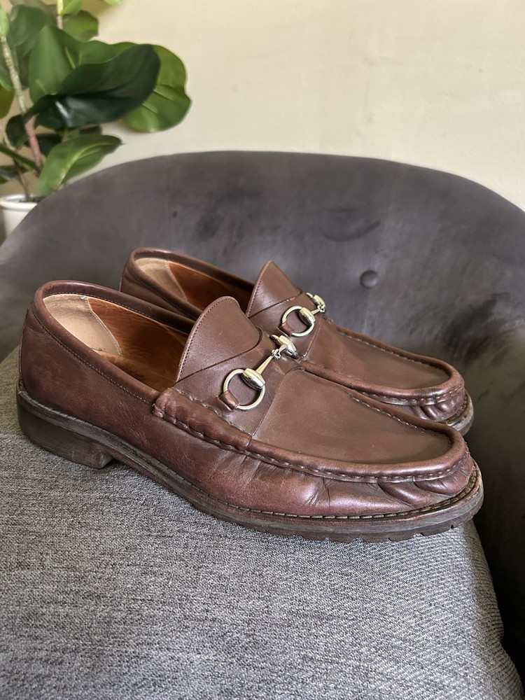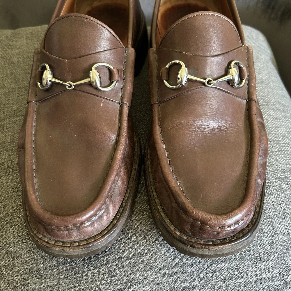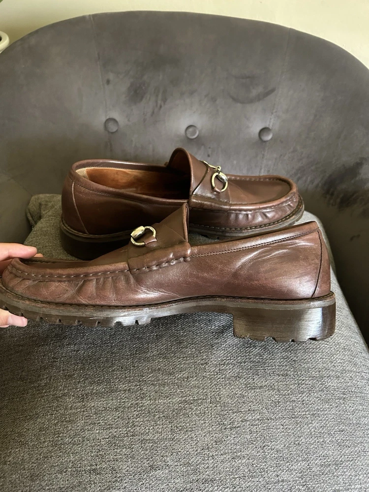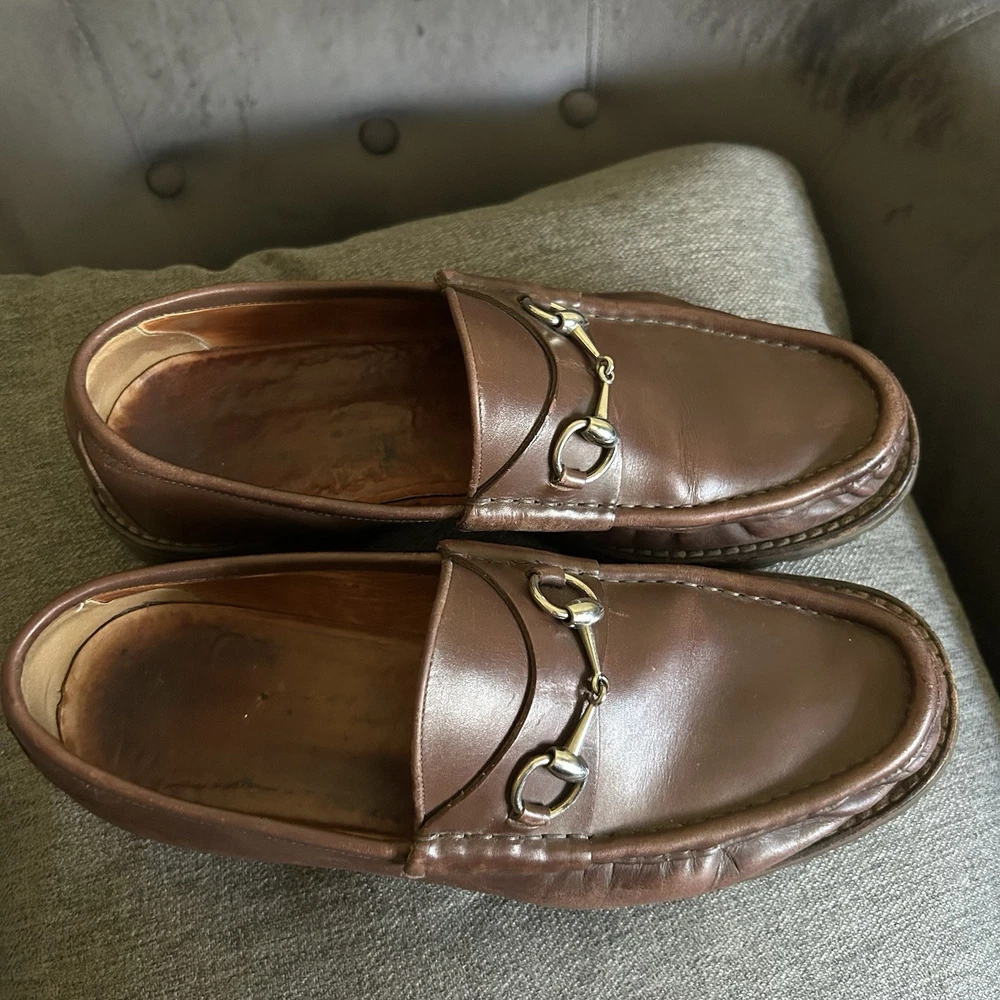Men’s Sz 10 Gucci loafers . In good condition . they have some peeling on the insoles of the shoe on wearers right shoe . The rubber soles have some wear to them as shown in pictures . The shoes could use a cleaning as they haven’t been worn in a while and they have been in my husbands closet for some time. Please see pictures for more details