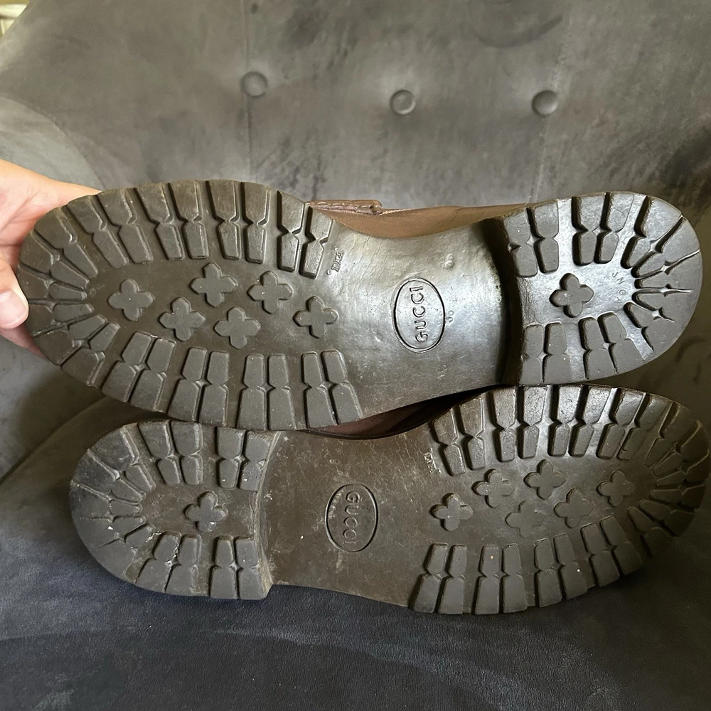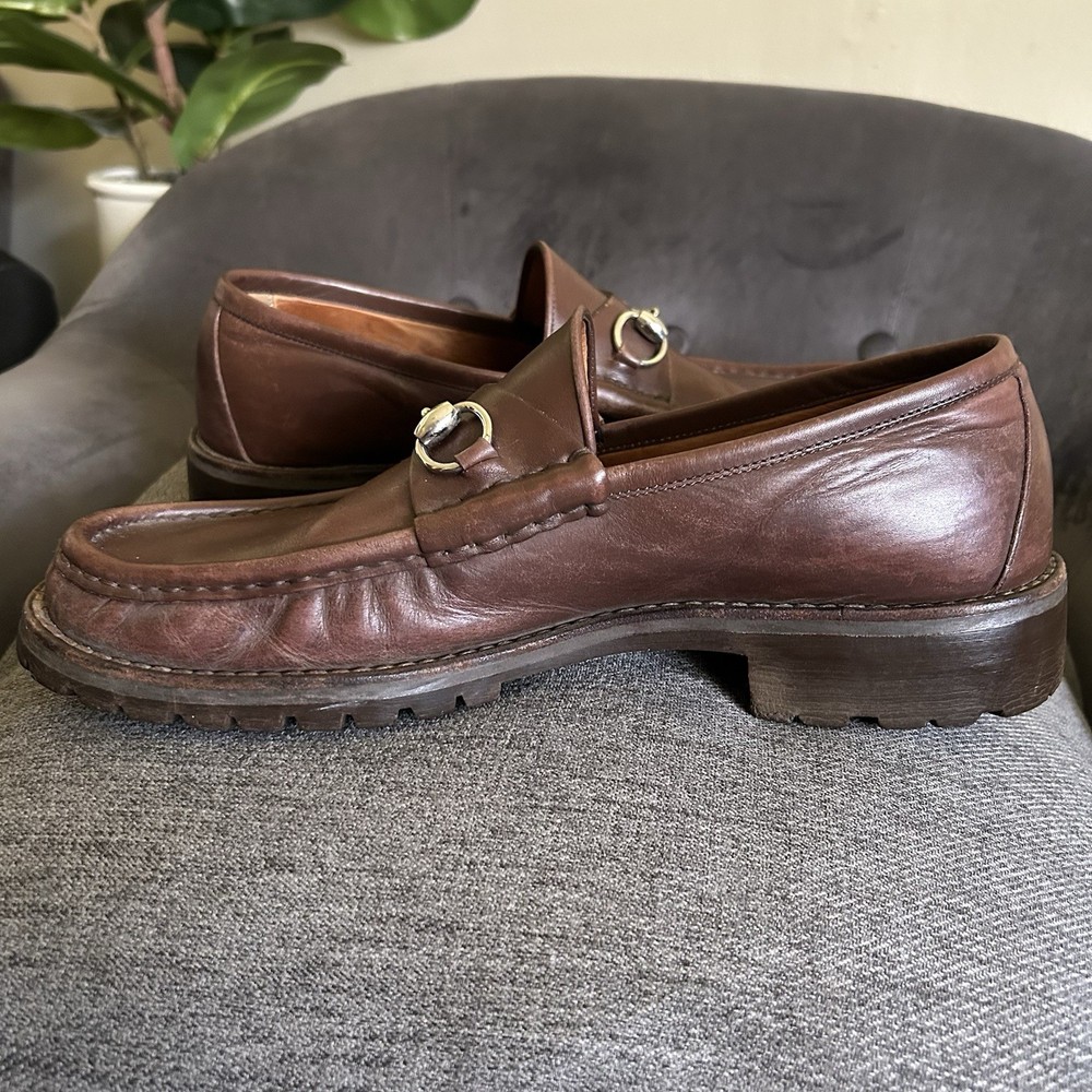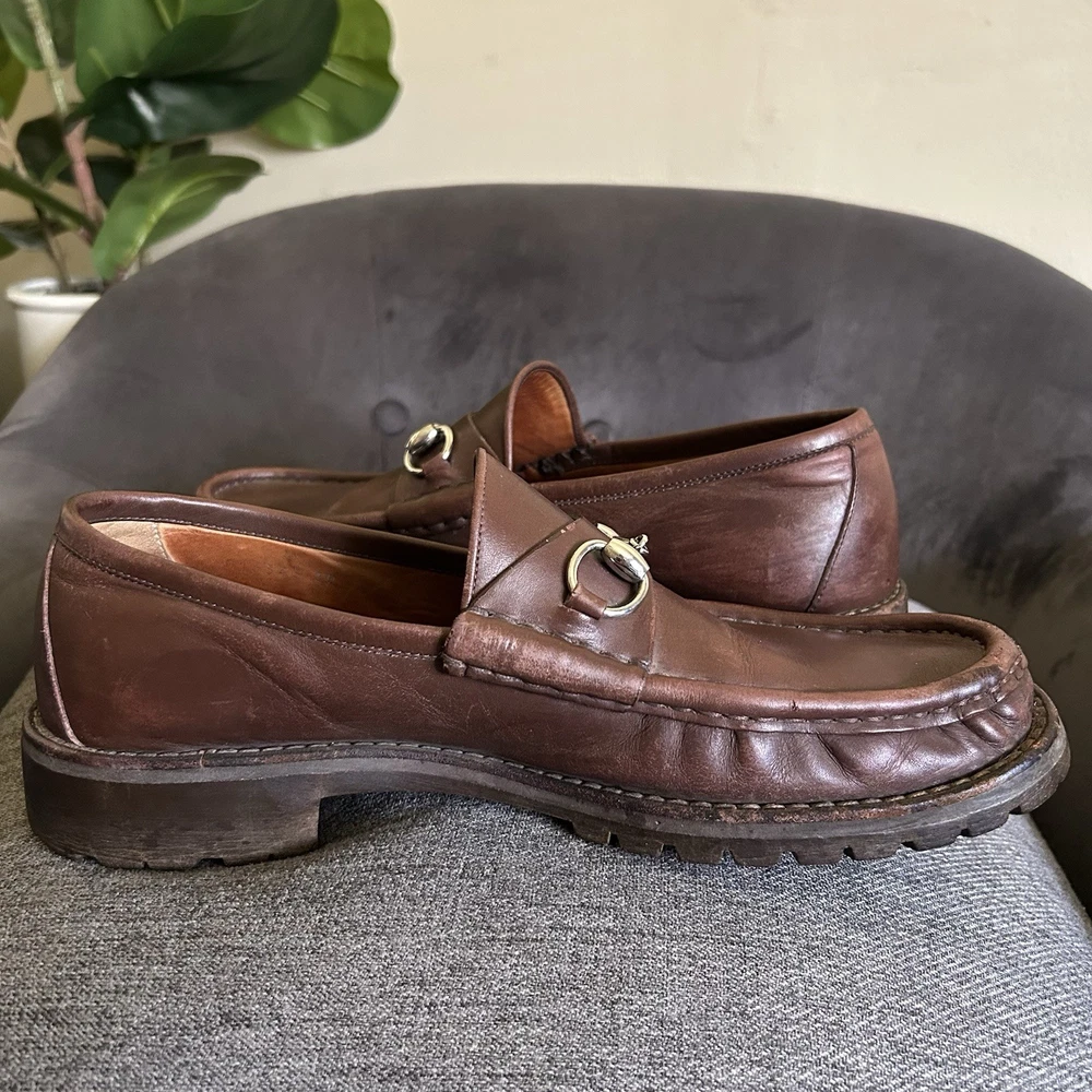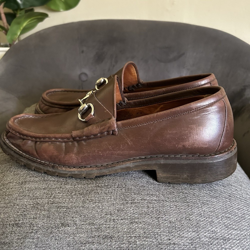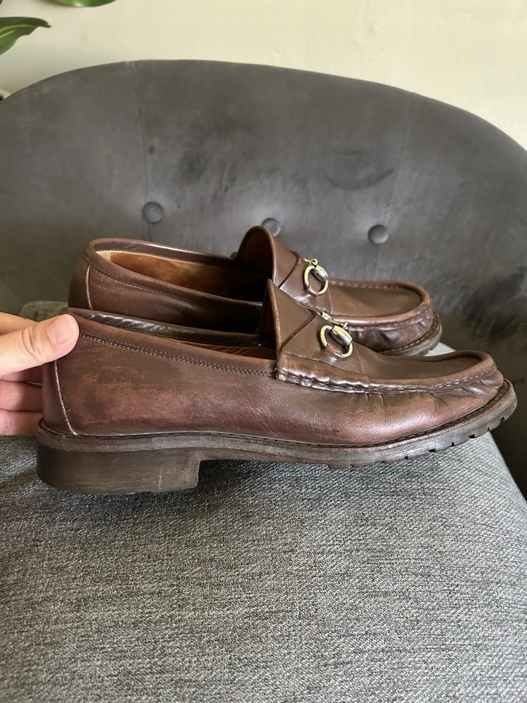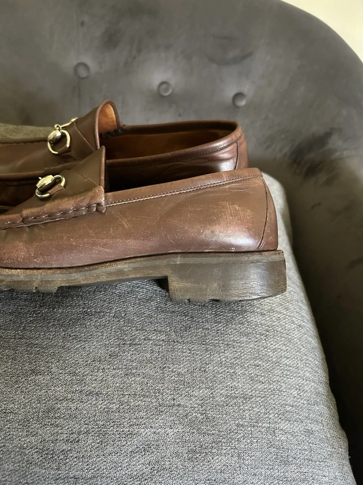 Men’s Sz 10 Gucci loafers . In good condition . they have some peeling on the insoles of the shoe on wearers right shoe . The rubber soles have some wear to them as shown in pictures . The shoes could use a cleaning as they haven’t been worn in a while and they have been in my husbands closet for some time. Please see pictures for more details