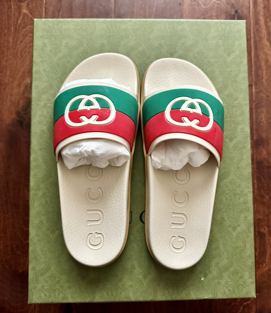 1. Just got these Gucci slides and wow, they are so comfortable and stylish! Perfect fit for my size 7 feet, and they look amazing with the classic white, red, and green colors. Love that they came with everything, totally authentic and brand new. Super happy with my purchase!