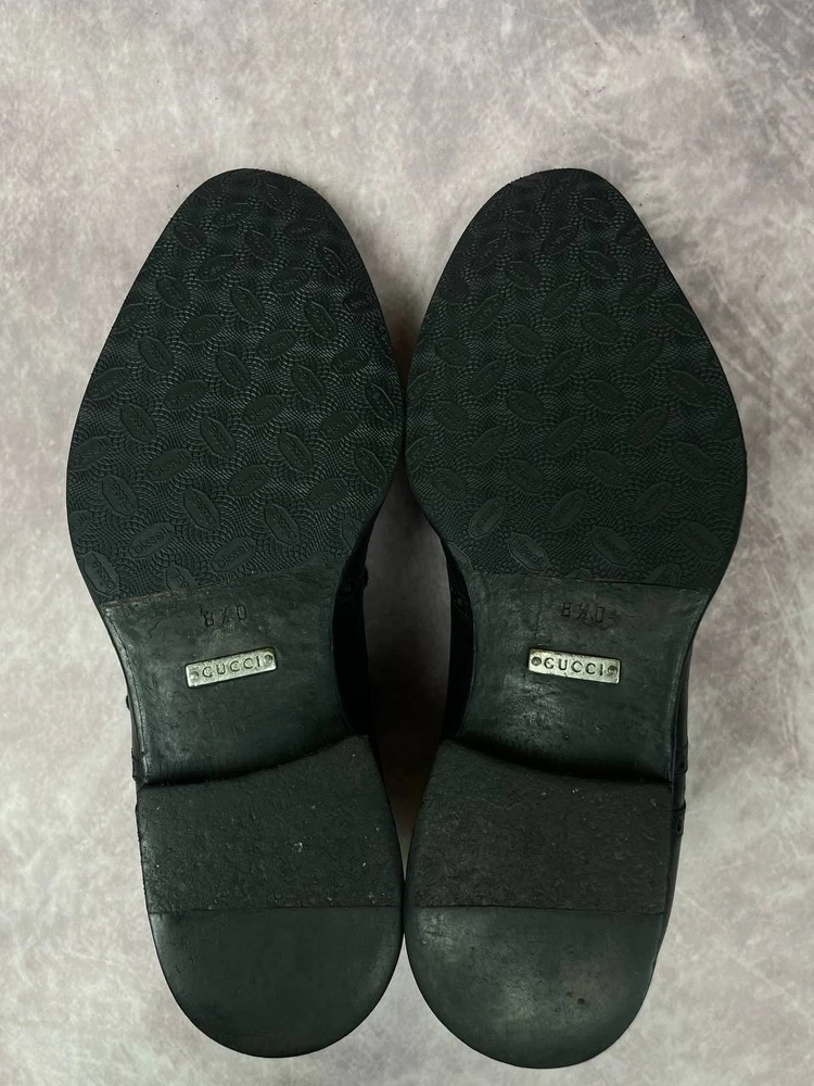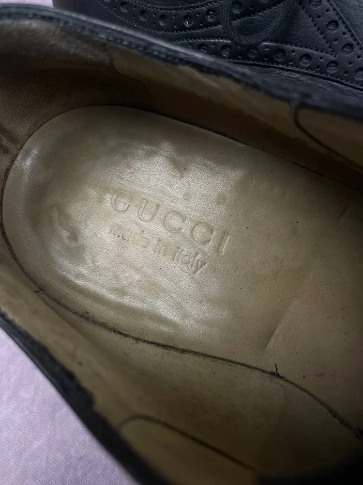 Gucci Early 00's Tom Ford era Black leather Brogue lace-up shoes Made in Italy Size: US 8.5 / Eur 42 / UK 8 Metallic logo on outsole Good pre-owned condition. There are no holes or stains. The leather shows some natural creasing and a few tiny surface cracks, typical for gently used leather shoes, but these are only noticeable upon very close inspection. Overall, they remain in great shape with plenty of life left.All details can be seen in the photos. Shipping: Ukrainian postal service Ukrposhta - 4-17 business days. Express shipping with Nova Post to Europe and USA. Can be shipped with UPS, DHL etc. for an additional shipping fee. Please feel free to ask any questions
