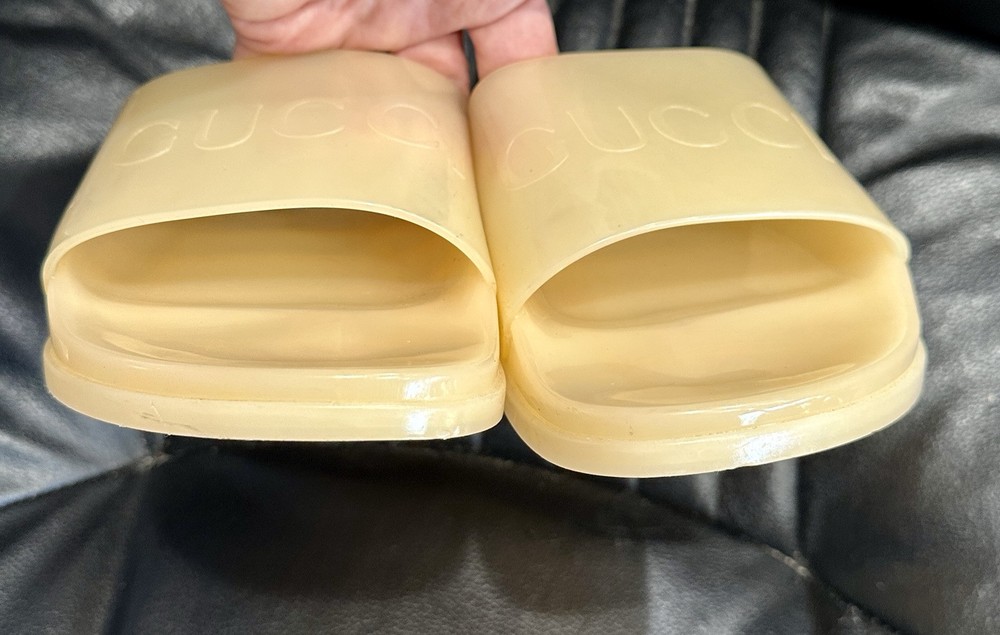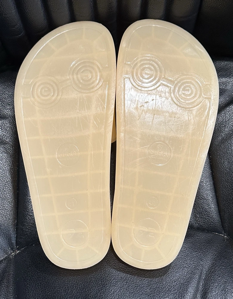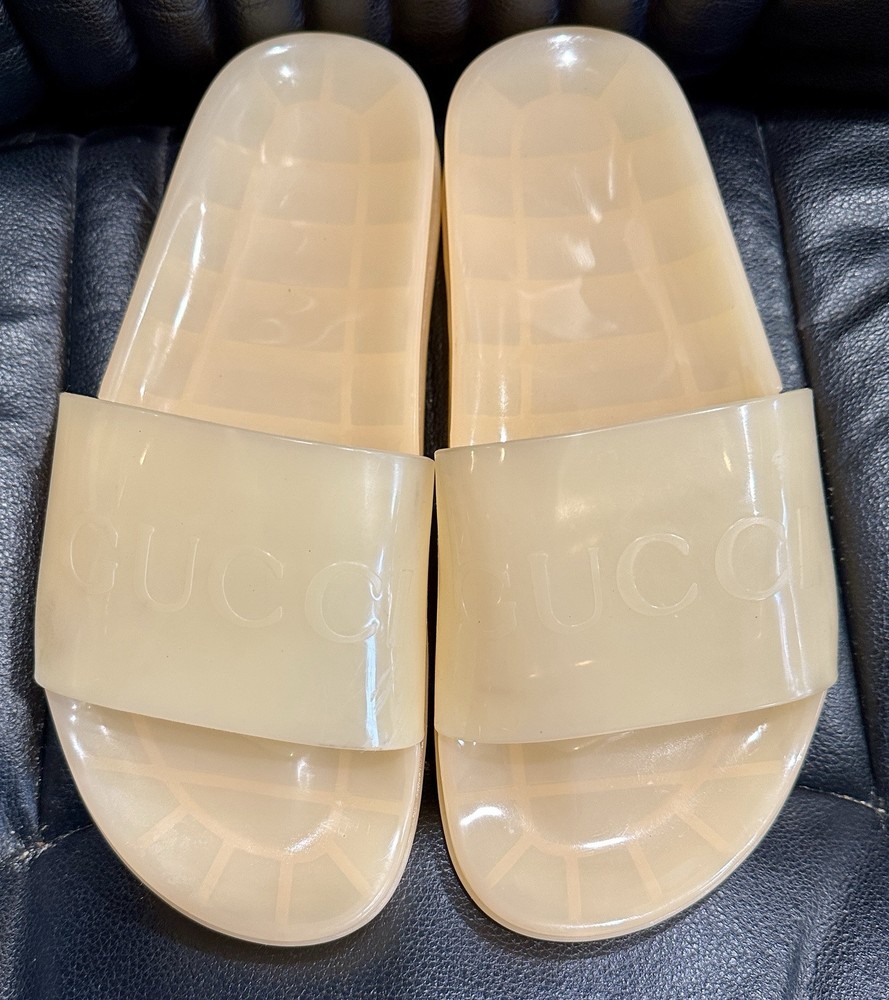 Elevate your summer footwear game with these stylish Gucci Transparent Rubber Logo Slides Sandals. Featuring a slip-on closure, standard shoe width, and a solid pattern, these sandals are perfect for any casual occasion. The upper and insole are made of high-quality rubber, ensuring comfort and durability. These sandals are designed for men and are available in US shoe size 8, and EU shoe size 41. As these are pre-owned, they are not perfect, but still great shape. Slight marks on tops -see last two pics, and a few scratches. But, a fab deal, for these status, authentic Gucci sandals! Items will always be mailed within one business day of purchase, and by using the most reliable and cost efficient method, usually Priority. If there is a huge difference in price, you will receive a shipping credit. I want to foster great lines of communication with my buyers. Please check out all photos, and feel free to ask questions before purchase. Thanks for looking, and check out my other fab handbags for sale.