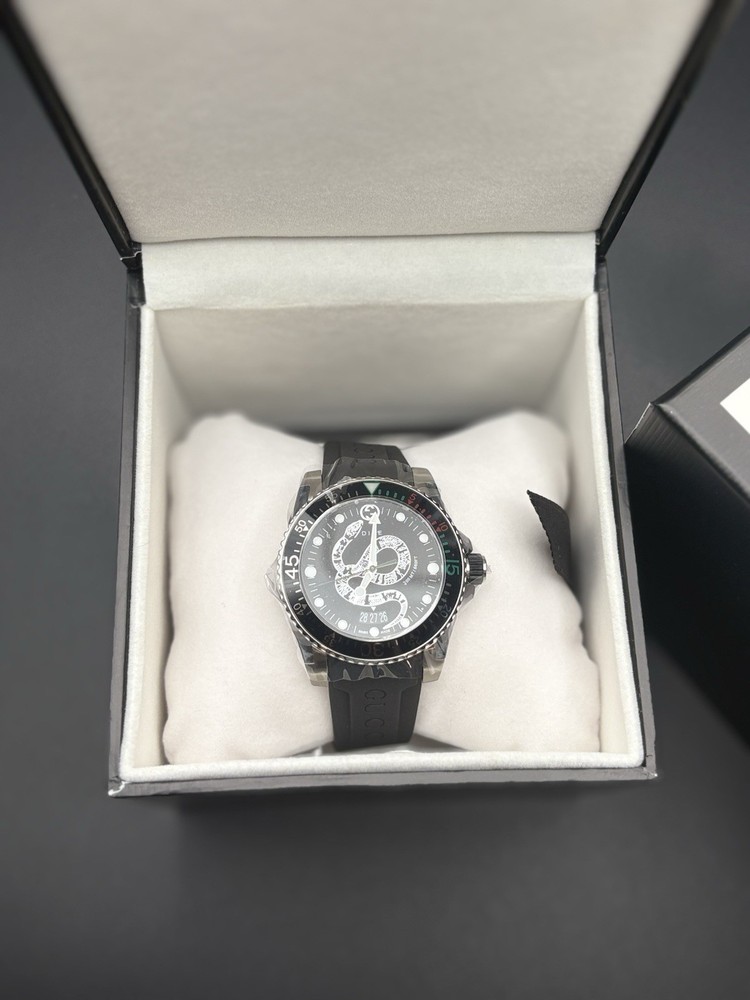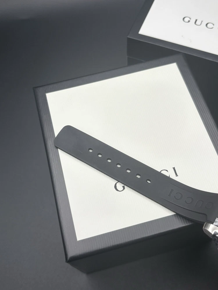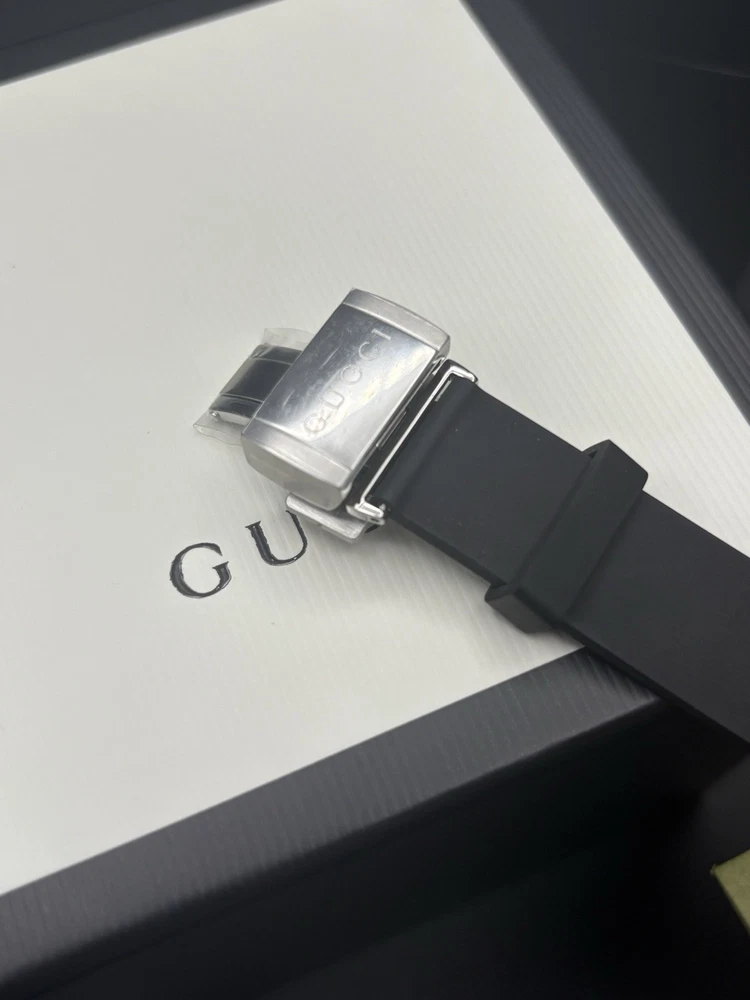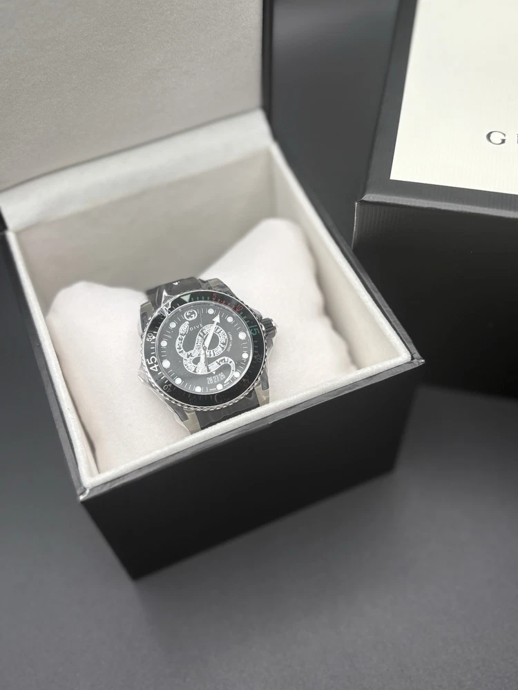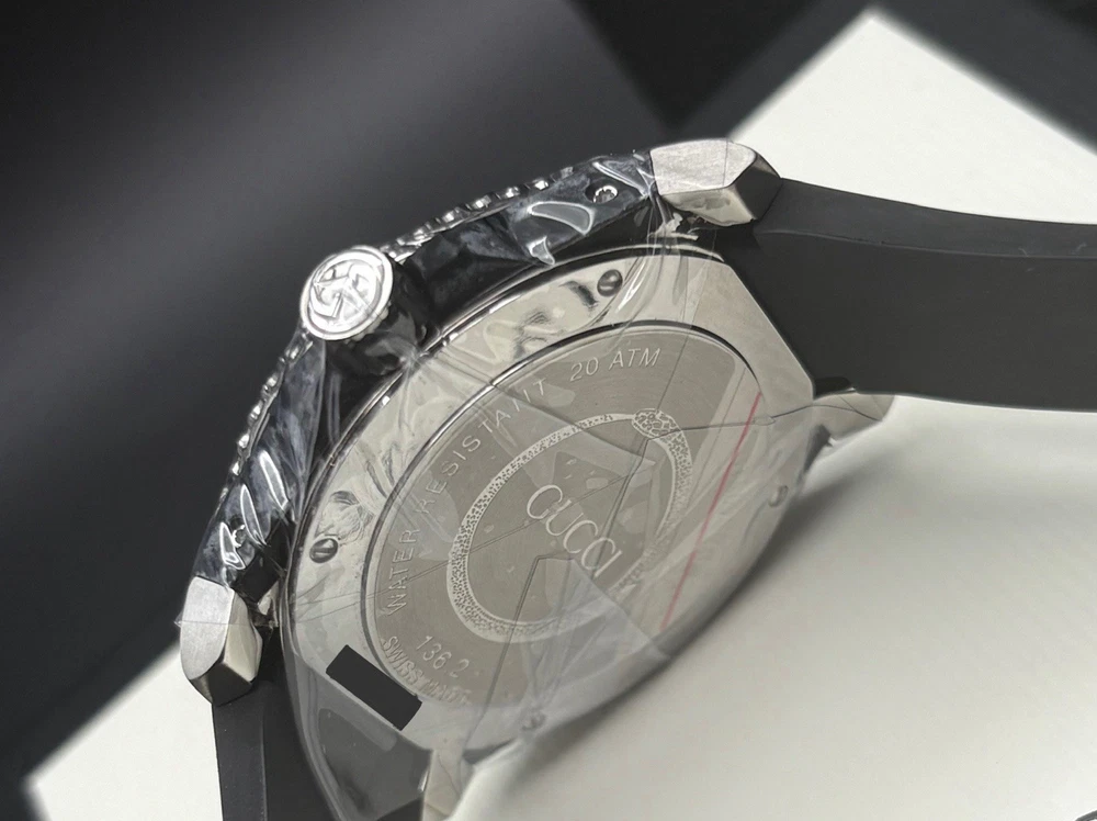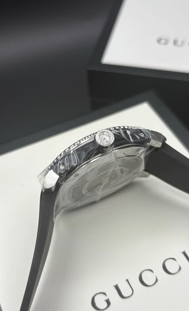 Free shipping from Miami, Florida! Delivery time 1-4 business days Product Details Case Case Thickness 10 mm Case Material Stainless Steel Case Shape Round Case Back Solid Band Band Material Rubber Band Type Strap Band Color Black Band Width 20 mm Clasp Deployment with Push Button Release Dial Dial Color Black (Kingsnake Print) Type Analog Crystal Scratch Resistant Sapphire Hands Luminous Silver-tone Dial Markers Dot Second Markers Minute Markers around the outer rim Luminiscence Hands and Markers Bezel Uni-directional Rotating Bezel Color Black Bezel Material Stainless Steel with an inlaid Black Ring Crown Screw Down Information Brand Gucci Collection Name Dive Gender Mens Model YA136323 Watch Label Swiss Made Movement Quartz Features Water Resistance 200 meters / 660 feet Calendar Date display above the 6 o'clock position Functions Date, Hour, Minute, Second Watch Features Analog, Rubber, Stainless Steel