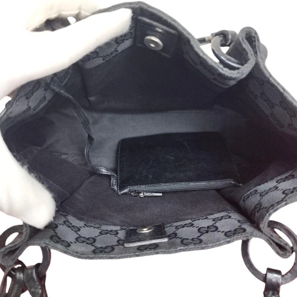 Size: Medium Theme: Designer Lining Color: Black Exterior Material: Canvas Exterior Color: Black Hardware Color: Gold Style: Tote Vintage: No Brand: GUCCI's Material: Canvas Features: Monogrammed Department: Women Pattern: Monogram Accessories: Pouch Character: N/A Country/Region of Manufacture: Italy Lining Material: Nylon Handle/Strap Color: Black Handle/Strap Material: Leather