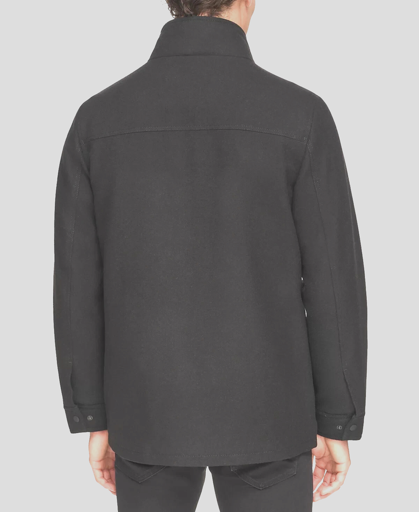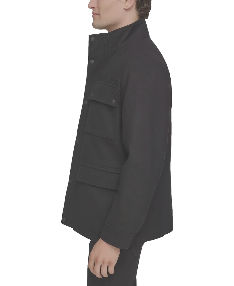 Details: - Stand collar; full-zip front closure with snap-button storm placket - Adjustable snap-button cuffs; zip-out full-zip quilted puffer bib; water-repellent; wind-resistant - Two lower front flap pockets; two snap-button flap pockets at chest - Shell: wool, polyester, acrylic, nylon, rayon, other fibers; backing: polyurethane; lining: nylon; sleeve lining: polyester; fill: polyester - Dry clean - Imported