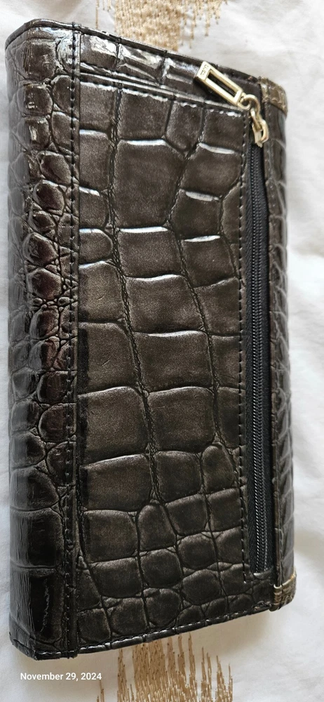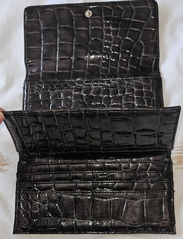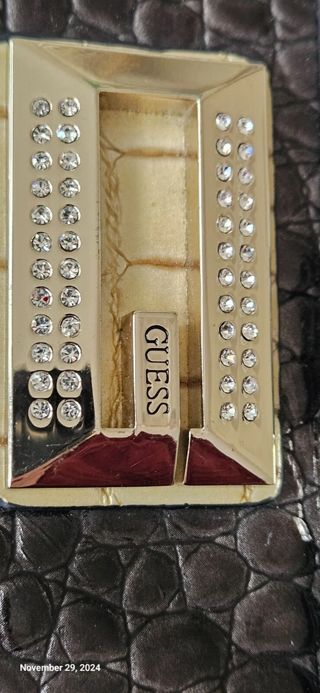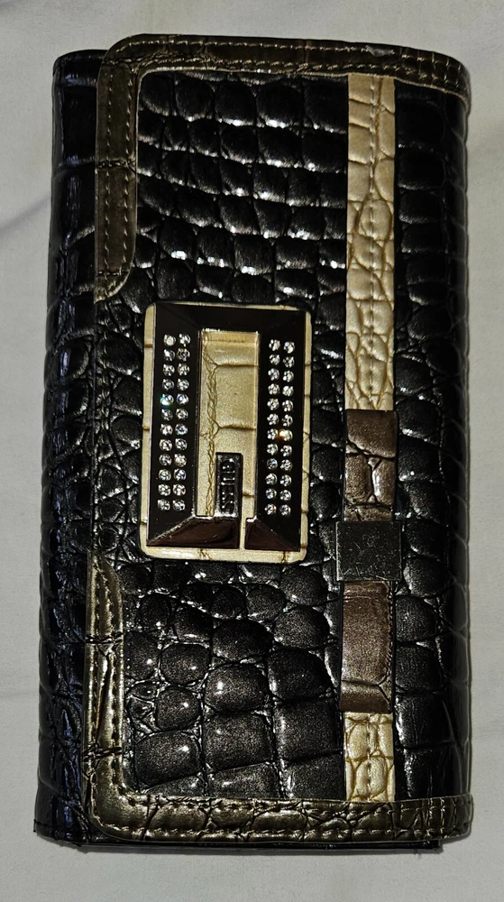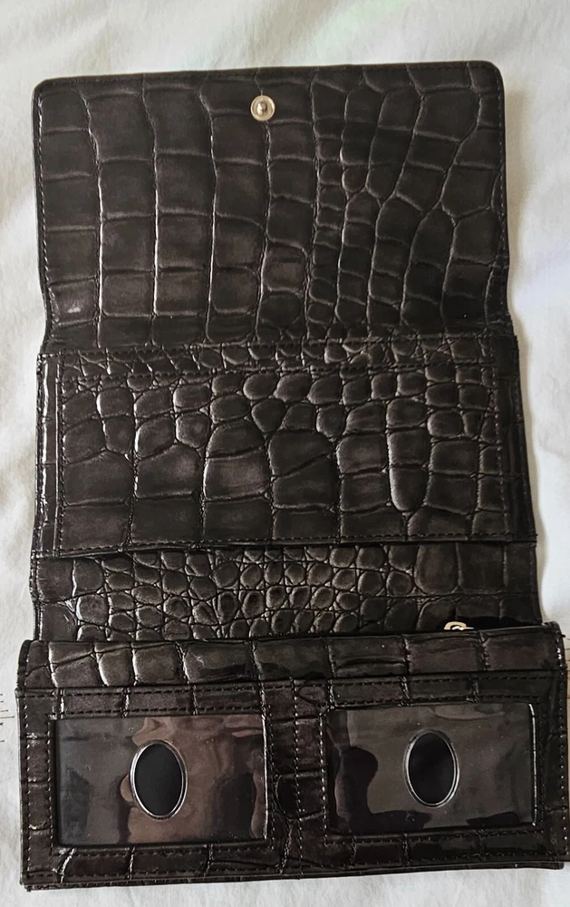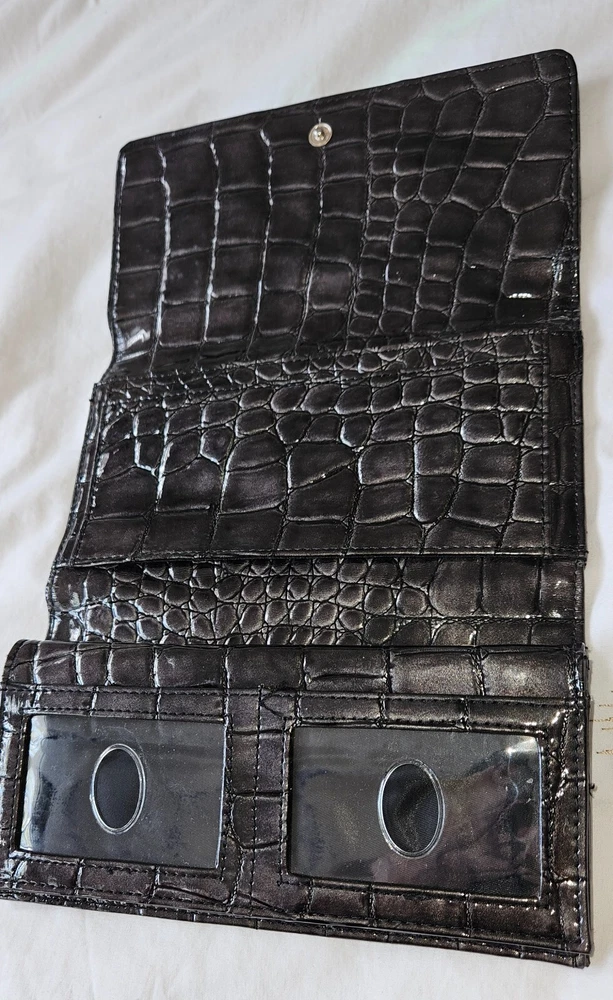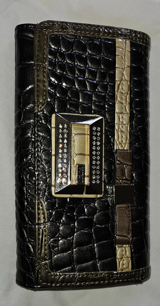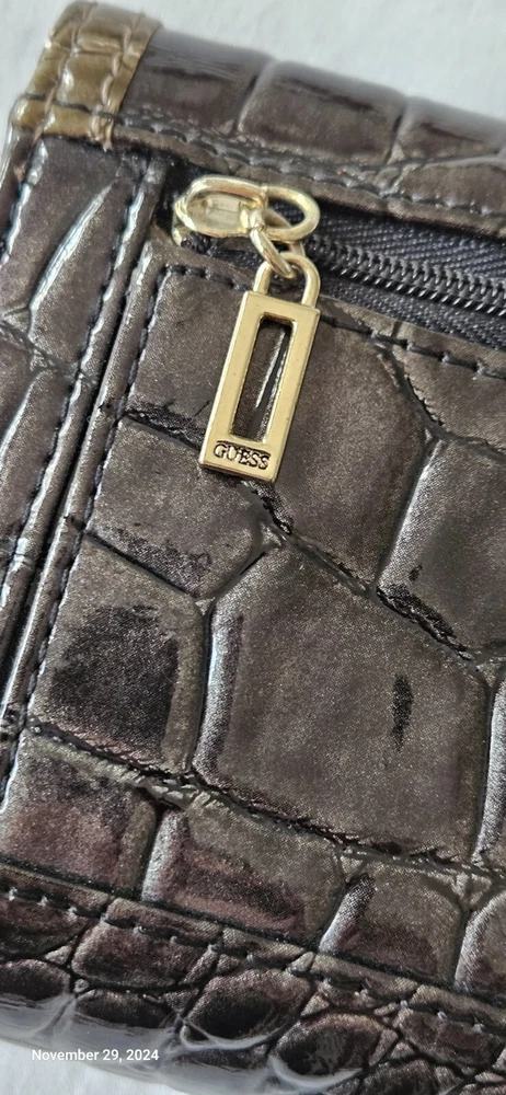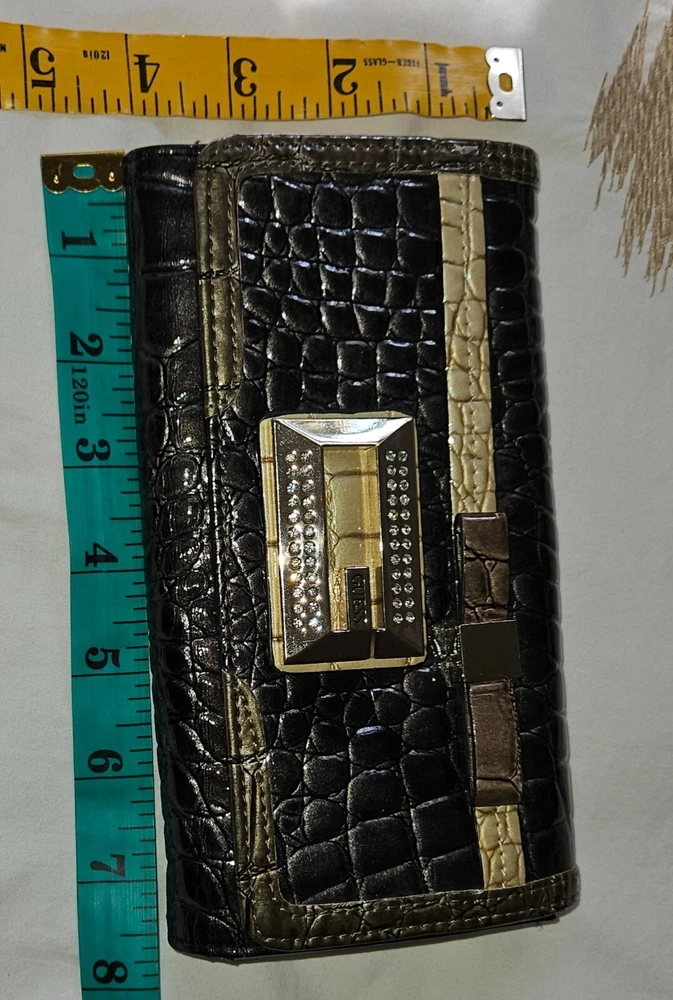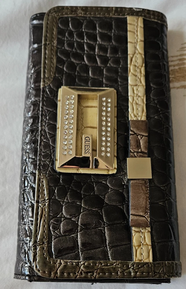 GUESS Trifold Wallet Bow Croc, Faux Leather 100% Authentic RARE slate grey metallic with Bling Logo, excellent condition-all stones intact. PM with questions, see all photos for details and measurements. No flaws noted, in good to excellent previously owned condition. Purging my Guess collection-view all listings GENERAL/SIZING check measurements against a garment you own for proper fitting, PM with questions. NO RETURNS accepted due to improper fit, minor blemishes on used items, slight variance in measurements, or buyer's remorse-only accepted if an item was misrepresented. PAYMENT & SHIPPING I use the most inexpensive method of shipping available at the time of purchase to reduce that cost for buyer and seller. *If you need an item expedited, any additional charges are buyer’s responsibility. * eBay ’s noted shipping time is just an estimation, it does not reflect actual delivery dates. 100% POSITIVE! In the land of eBay , feedback is important. If I provide anything less than exceptional, please allow me to resolve any issues prior to leaving negative feedback. * YES I will combine shipping for multiple purchases/listings*