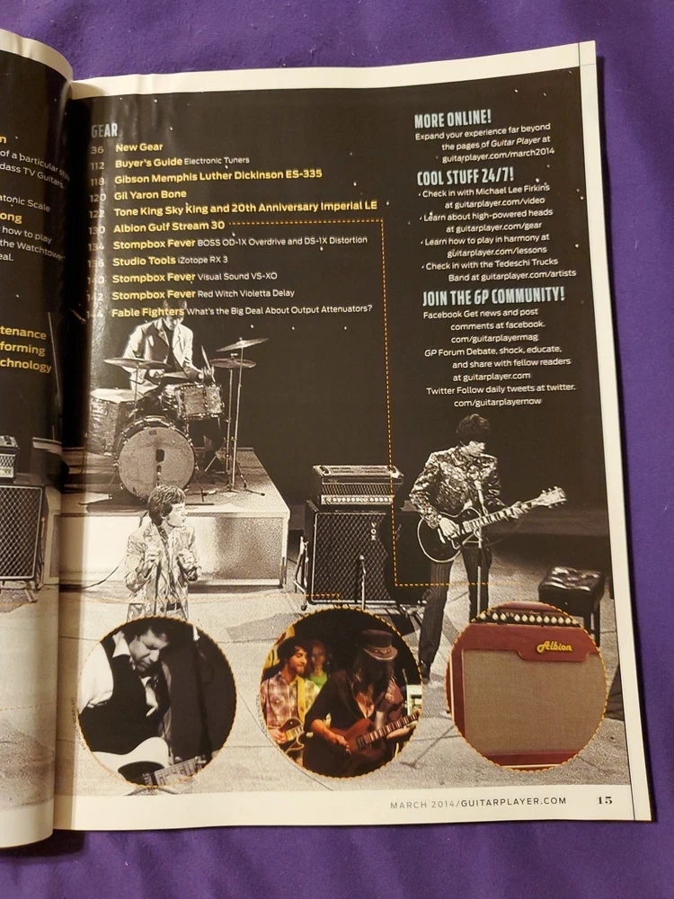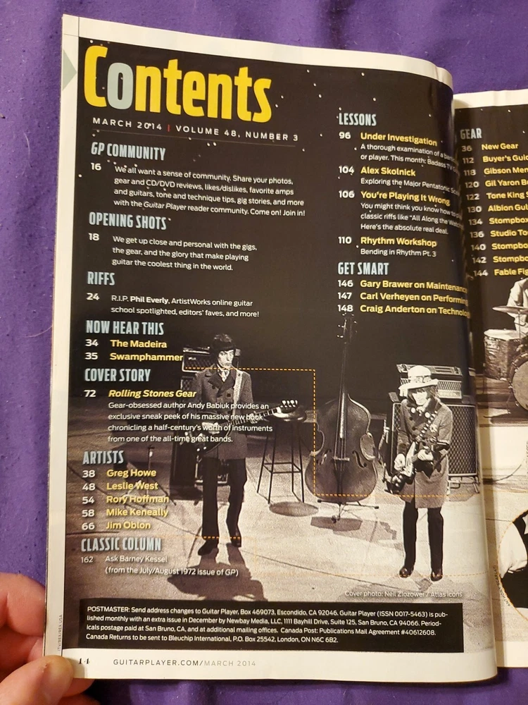 Guitar Player March 2014 Vol 48 Number 3 Rolling Stones Jimi Hendrix Alex Skolnick Phil Everly Andy Babiuk The Madeira Swamphammer Greg Howe Leslie West Rory Hoffman Mike Keneally Jim Oblon Barney Kessel Gary Brawer Carl Verheyen Craig Anderton Gibson Gil Yaron Bone Tone King Albion Boss iZotope Visual Sound Red Witch Michael Lee Firkins