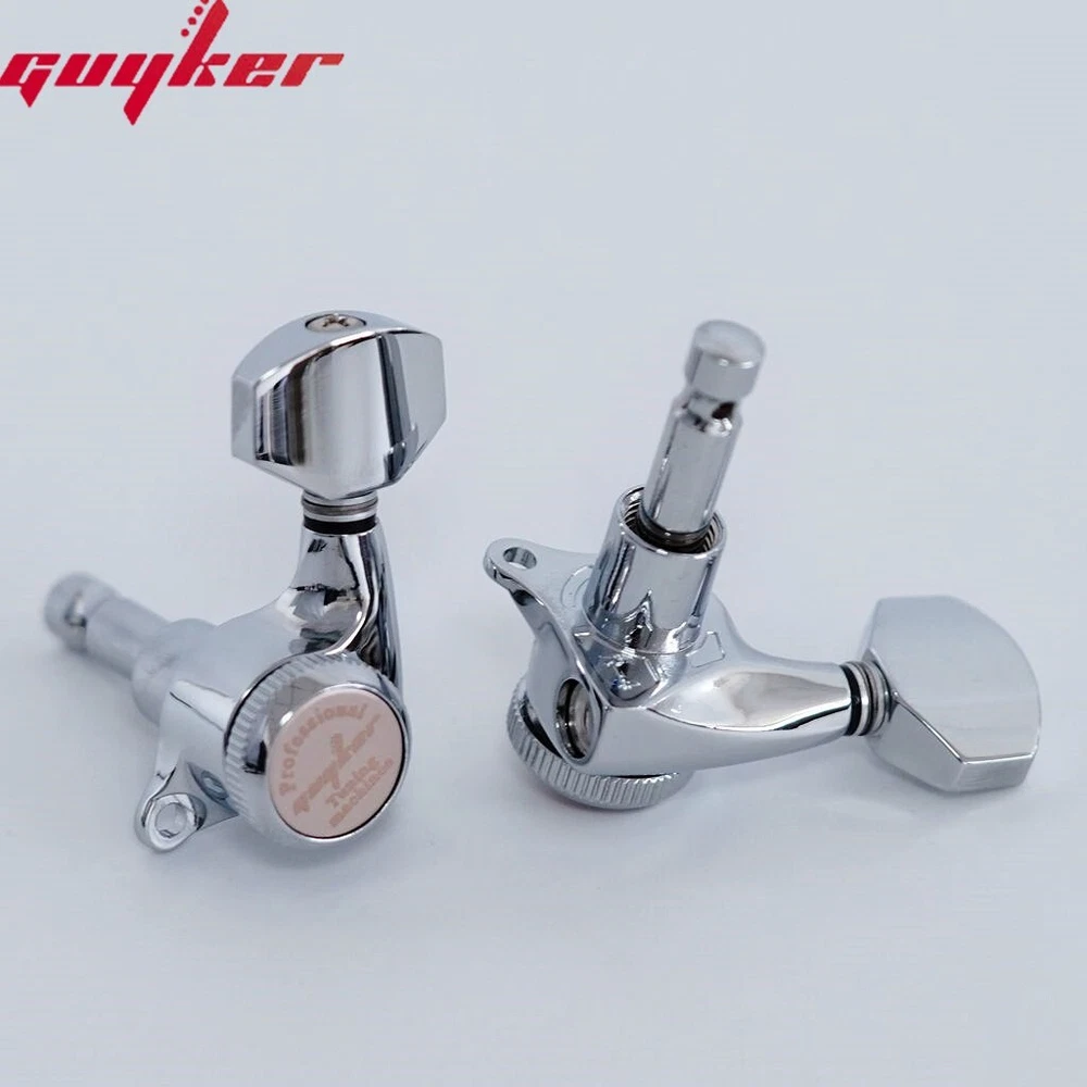 Lock chord back cover is made of metal After the version upgrade, the lock chord back cover is made of metal, which is not easy to break and damage, and has better stabilit. Good locking tuner pegs can ensure you to play your beloved guitar flexibly and accurately. Guyker locks guitar pegheads fit for LP, SG, EPI, Tele style electric or acoustic guitars. Featured with sealed machine heads and heavy-duty internal gear, it can turn smoothly, enabling the player to tune accurately and easily. product good replacement for almost electric or acoustic guitars. Guitar sealed tuning machines with heavy duty internal gear, sturdy and convenient. Easy to install, easy to replace your old and dirty guitar tuning pegs. Guyker locking tuners help to provide finer tuning and greater stability. Gear Ratio - 1:18, designed to fit modern 10mm headstock holes. Gold plated. Made in Korea. Feature: - Replacement / Upgrade parts for electric or acoustic guitars or precision instruments. - Easy to install, quick and accurate tuning. - Durable and highly reliable for easy, smooth, and precise tuning. - Made of solid materials with an elegant and professional look. - With heavy duty internal gear. - Provides finer tuning and greater stability. - Quality sealed guitar machine heads. - Made in Korea. Specifications: - 3 Combinations Available: 6R, 6L or 3R3L - Style: Hexagonal Handle GK-501D7CSP - 3 Colors Available: Golden, Black, Chrome. Package Includes: - 6 x Guitar machine head (6R, 6L or 3R3L for choose) - 6 x Ferrules - 6 x Threaded Bushings