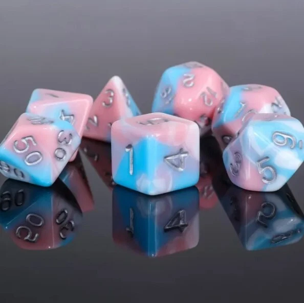 Galactic Toys Our eBay Store Follow my store! Galactic Dice Premium Dice Sets - Cotton Candy (Pink, Blue & Silver) Acrylic Set of 7 Dice The perfect companion for your gaming needs! These HD acrylic dice are exactly what you've been searching for that upcoming game night with the group. This set includes one of each: d20, d12, d10, d10 (percentile), d8, d6, and a d4 (7 dice in total) in a Product Details Width 0.500 Height 3.500 Length 2.500 Manufacturer # HDB-103 UPC 656089809326 Shipping & Order Information All items ship within 1 business day and ship using DHL Global Mail, USPS, or UPS Ground. The DHL service uses the United States Postal Service (USPS) to deliver packages. All items will be packaged with care and use proper padding and packing. International Shipping We ship international orders with tracking using DHL global mail. On orders above 40 USD we will upgrade to a faster DHL delivery service. Customers are responsible for duties and taxes in their country. We can't modify shipment values for custom purposes. Return Guidelines Please always contact us before making a return. Returns must be sent back to us using the same shipping format, protective packaging, original condition you received your item and include a tracking number. On orders that are unwanted, a 20% restock fee will apply. If you had FREE Shipping the original shipping cost will be deducted from your refund. Allow up to 3 Business Days for processing once we receive your return before being issued a refund. If a Return is being made from a mistake on our end contact us for individual instructions**