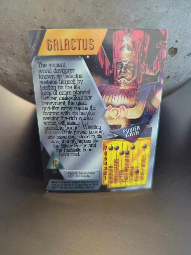 Language: English Card Thickness: 35 Pt. Franchise: Marvel (MCU), X-Men TV Show: X-Men Product: Single Country/Region of Manufacture: United States Age Level: 6+ Vintage: Yes Manufacturer: Marvel Movie: X-Men Featured Characters: Marvel Card Size: Standard Type: Non-Sport Trading Card Card Number: 16 Genre: Action, Adventure, Sci-Fi, Superhero, TV & Movies Material: Metal Character: Galactus Set: Marvel Metal Year Manufactured: 1995 Card Name: Marvel Metal