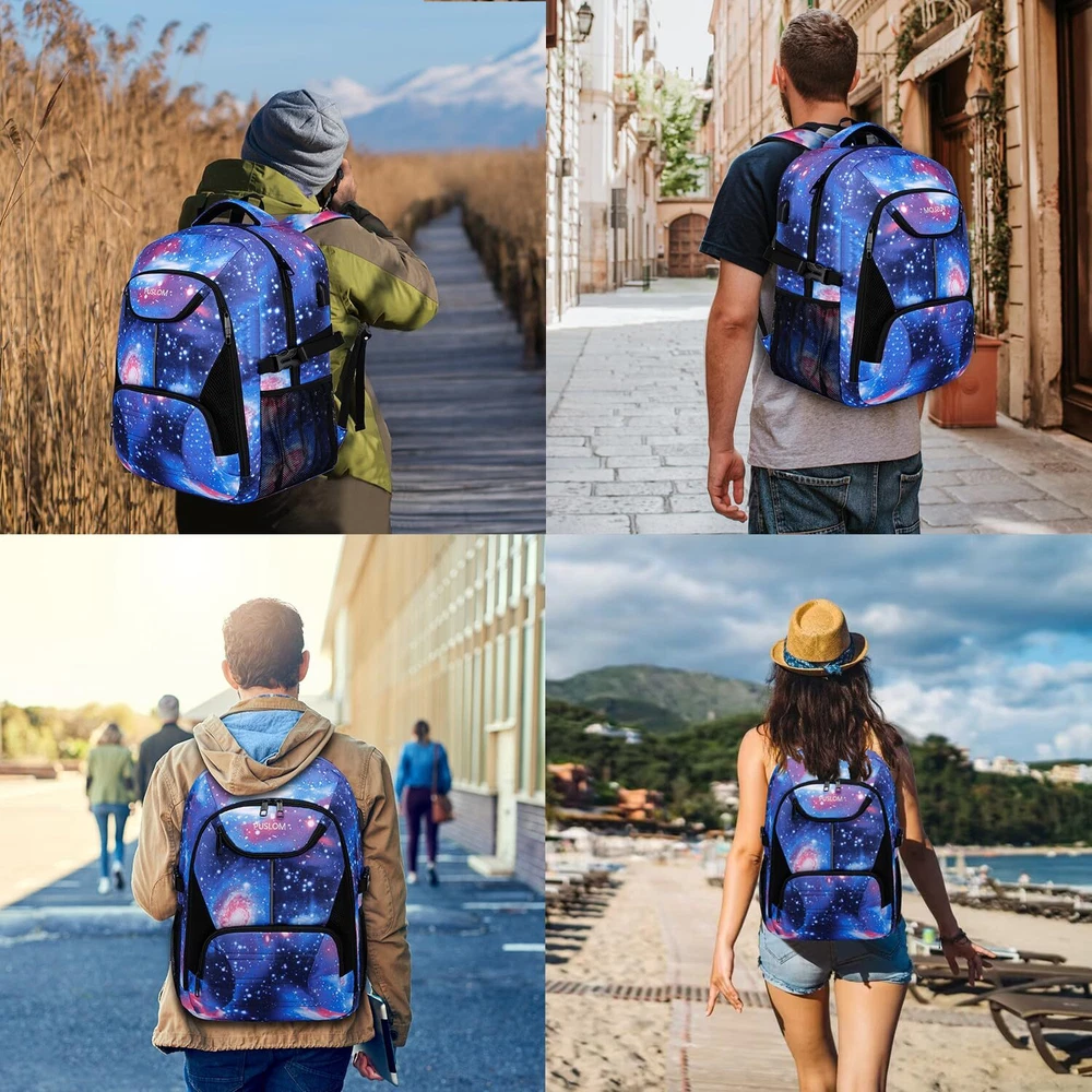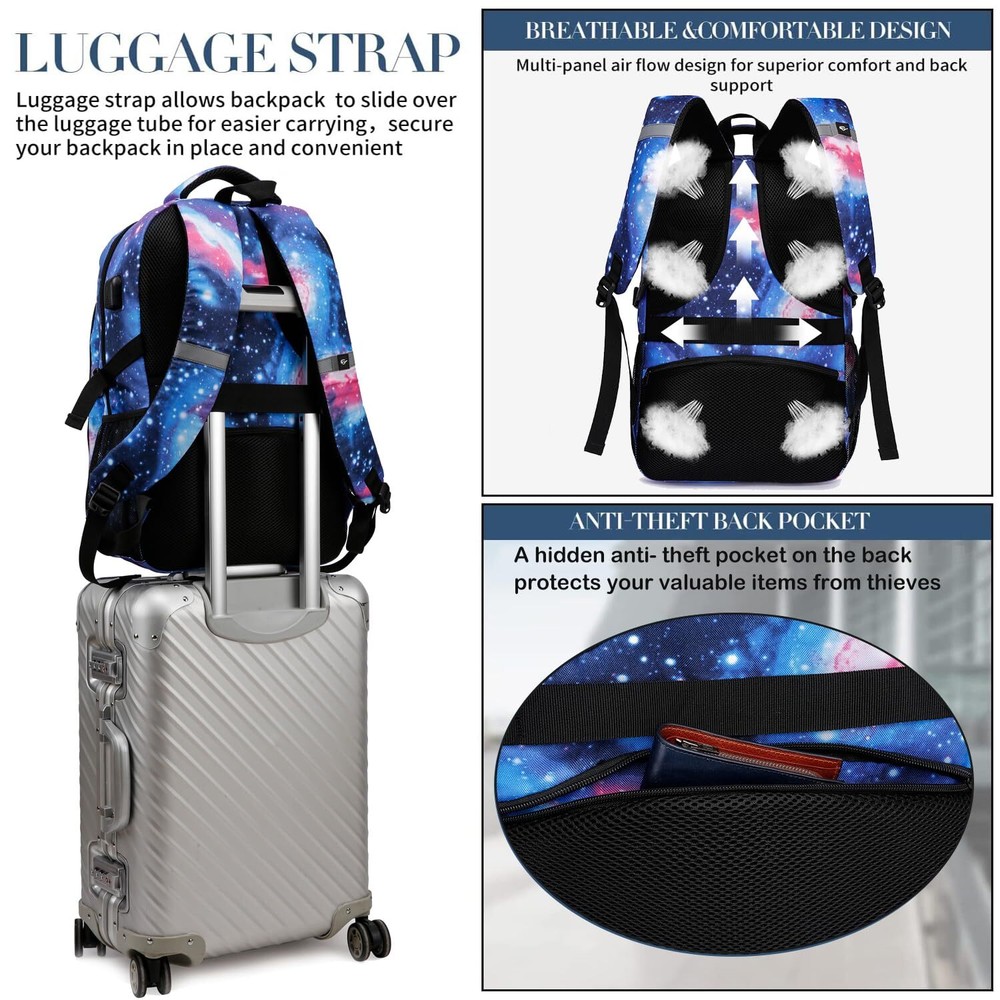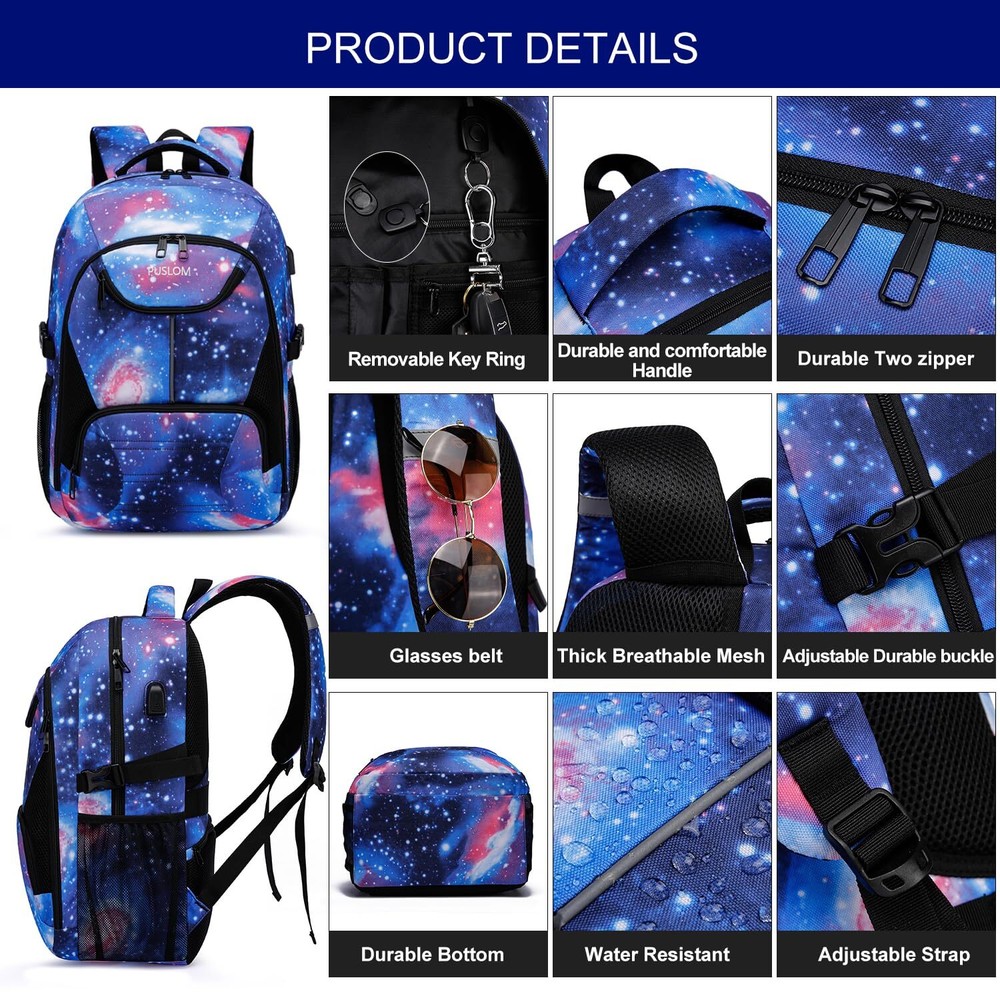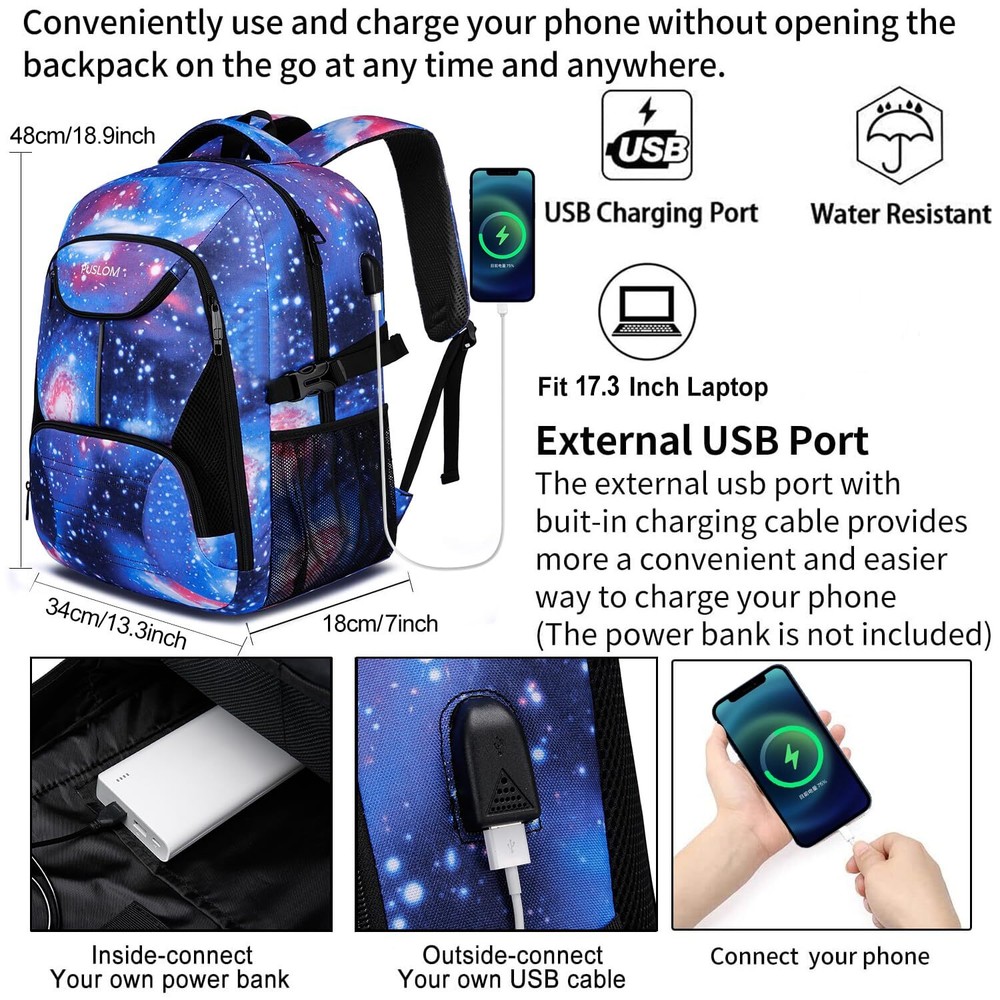 LARGE CAPACITY & MULTI POCKETS - Large backpack design with 3 spacious main compartments and 1 separate padded laptop compartment pocket. It owns many interior pockets for large storage and organization for daily necessities, such as passport, pens, phones, notebooks and some other small items, keep your things organized and easy to find. Both side mesh pockets outside for oversize water bottle and compact umbrella. With lanyard design on the shoulder strap, sunglasses is easily to hang with. PRACTICAL & MULTIPURPOSE - Design with sturdy and smooth metal zippers, tech backpack ensures daily long-lasting use. This bag meets size requirement at the airport (Length + Width + Height: cannot exceed 51 inches / 130 cm). It fits under seat on an airplane. A luggage strap on the back allows the travelling backpack to be fitted on luggage/suitcase, slide over the luggage upright handle tube for easier carrying. Serve as a extra large durable backpack for travel, large bookbag for college. GREAT GAMING BACKPACK FOR LAPTOP - Size of the extra large travel laptop backpack: 18.9*13.3*7.0 (inches). This big bookbag dimension fits 17.3, 17, 15.6, 15 inch laptops. Separate laptop compartment design with plentiful sponge padding gives laptop excellent protection. This bag offers you a more convenient way to travel or work. Serve as a large laptop bag, gaming laptop backpack, computer backpack, college backpack for men and women. USB CHARGING PORT & ANTI THEFT & NIGHT LIGHT REFLECTIVE - With built in USB charger outside and built in charging cable inside,this usb backpack provides a convenient charging of your electronic device anywhere.With a hidden anti theft pocket on the back protect your valuable items from thieves.Night light reflective design on the front and the shoulder to make you be noticed in dark.Perfect choice as professional backpacks for laptop,back packing bags for men,huge backpack,adult backpack men. DURABLE & STURDY & COMFORTABLE - Made of high-density, light and durable, smell-less, water resistant polyester material with waterproof zippers. It's very sturdy, tear resistant and heavy duty backpack. Comfortable airflow back design with breathable mesh, thick and soft multi-panel ventilated sponge padding gives you maximum back support. Wide breathable and adjustable shoulder straps relieve the stress of the shoulders. A rugged handle with Foam padded for a long time carry on.