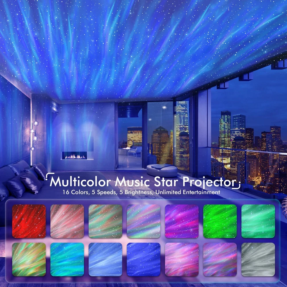 Upgraded 4-in-1 Galaxy Projector Night Light - This galaxy projector for bedroom combines an aurora projector, night light, Bluetooth speaker, and white noise machine all in one device. It now boasts dual projection lenses, capable of projecting northern lights with 33 light effects and lively star light sky to create a relaxing atmosphere with soothing music, bringing you to enjoy the beauty of nature. Transform your room into a beautiful and romantic gateway with peaceful moving lights. Sound Activated & Built-in Music Speaker - Our star projector boasts a cool feature that enables you to synchronize the projection with your music, making it move along with the beat and creating a fun and energetic party atmosphere. Color changing LED lights for bedroom add even more excitement to your party. You can also connect via Bluetooth to play music from this galaxy light projector and watch in amazement as the little stars and galaxy lights move rhythmically to the beat of the music. White Noise Sound Machine - The night lights for kids room come pre-installed with 8 different white noise sounds that can help you, your babies, toddlers, and kids fall asleep more easily. The 8 soothing sounds include Twinkle, Twinkle, Little Star, Summer Night, Stream, Ocean Waves, Birds Chirping, Rain, Lullaby, and Campfire. Use the kids night light projector for education or entertainment and the white noise machine as a soothing tool to help you relax and alleviate insomnia. Remote Controlled & Timer Function - The star projector galaxy light comes with a remote that allows you to easily turn ON/OFF the galaxy web and starry night sky, adjust brightness, change the lighting mode, speed, music, and volume. The starlight projector also has a timer which you can set to turn off after 1 or 2 hours. No need to worry about leaving it on when trying to fall asleep. It will automatically turn off after 4 hours if you forget to set the timer. Great Room Decor and Gift Ideas - At , we highly value each customer and always strive to provide you with the best kind of service, ensuring customer enjoyment, health, and safety. All star projector galaxy lights are FCC, RoHS, and CE certified. It is perfect for decorating bedroom, kids room, bathroom, game room, home theater, wall, ceiling, show, wedding, birthday, anniversary, party, and Christmas decorations. An excellent present for all seasons and great gifts for family and kids.