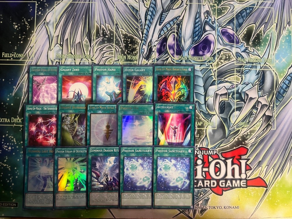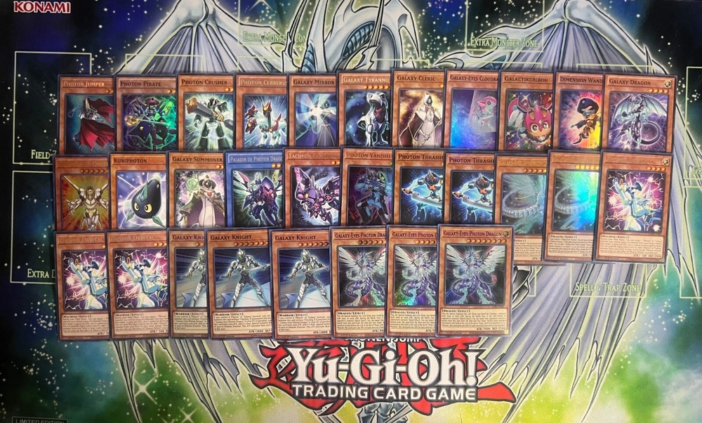 Hello! You are purchasing the deck list below, the cards will be English, real, and near mint to light play condition at worst. All decks are built with the lowest rarities for cards in mind to keep the price of the deck low and affordable for all duelists! Some cards may be in speed duel printing if this is the cheapest available copy of the card, but do not worry these are real cards and legal for tournament use! Purchase with confidence and safety! As an added bonus one pack of card sleeves will be included with your deck! Thanks again and good luck dueling! Now here's the decklist; Monsters: 1| Photon Jumper 1| Galaxy Dragon 1| Dimension Wanderer 1| Galactikuriboh 1| Galaxy-Eyes Cloudragon 1| Galaxy Cleric 1| Galaxy Tyranno 1| Galaxy Mirror Sage 1| Photon Cerberus 1| Photon Crusher 1| Photon Pirate 1| Photon Vanisher 1| Tachyon Cloudragon 1| Paladin of Photon Dragon 1| Galaxy Summoner 1| Kuriphoton 1| Guardian of Order 2| Galaxy-Eyes Afterglow Dragon 2| Photon Thrasher 3| Galaxy-Eyes Photon Dragon 3| Galaxy Knight 3| Photon Orbital Spells; 1| Rank-Up-Magic Barian's Force 1| Hyper Galaxy 1| Photon Hand 1| Galaxy Zero 1| Tachyon Spiral of Destruction 1| Luminous Dragon Ritual 1| Photon Stream of Destruction 1| Numbers Last Hope 1| Accelight 1| Photon Veil 1| Rank-Up-Magic Astral Force 1| Galaxy Hundred 1| Rank-Up- Magic - The Seventh One 2| Photon Sanctuary Traps; 1| XYZ Reborn 1| Eternal Bond 1| Photon Change 1| Lord of the Tachyon Galaxy 3| Tachyon Transmigration Extra Deck; 1| Galaxy Photon Dragon 1| Galaxy-Eyes Full Armor Photon Dragon 1| Starliege Photon Blast Dragon 1| Galaxy-Eyes Cipher Blade Dragon 1| Number 38: Hope Harbinger Dragon Titanic Galaxy 1| Number C107: Neo Galaxy-Eyes Tachyon Dragon 1| Number C62: Neo Galaxy-Eyes Prime Photon Dragon 1| Galaxy Stealth Dragon 1| Neo Galaxy-Eyes Photon Dragon 1| Number 62: Galaxy-Eyes Prime Photon Dragon 1| Galaxy-Eyes Cipher Dragon 2| Number 107: Galaxy-Eyes Tachyon Dragon 2| Galaxy Satellite Dragon