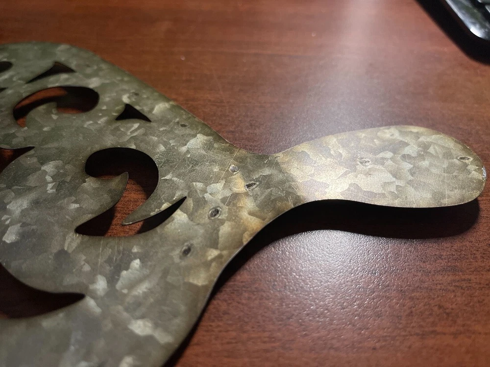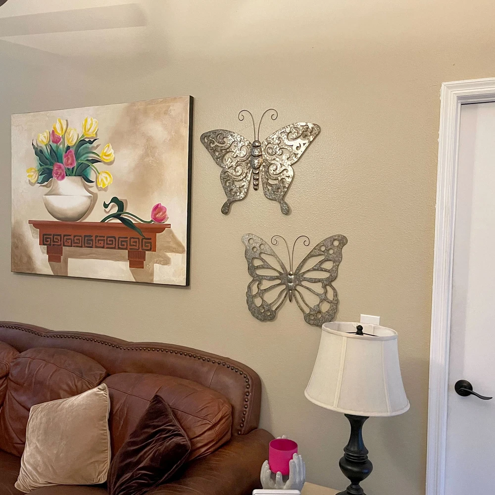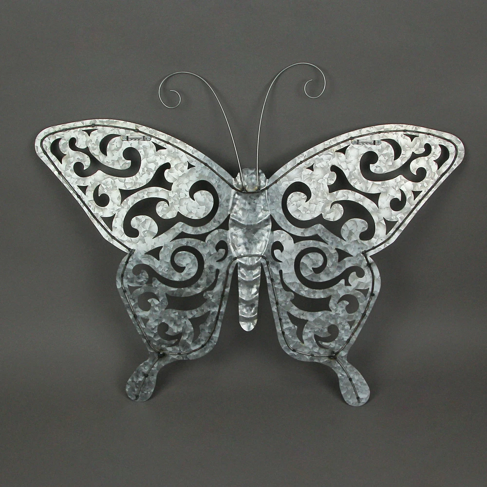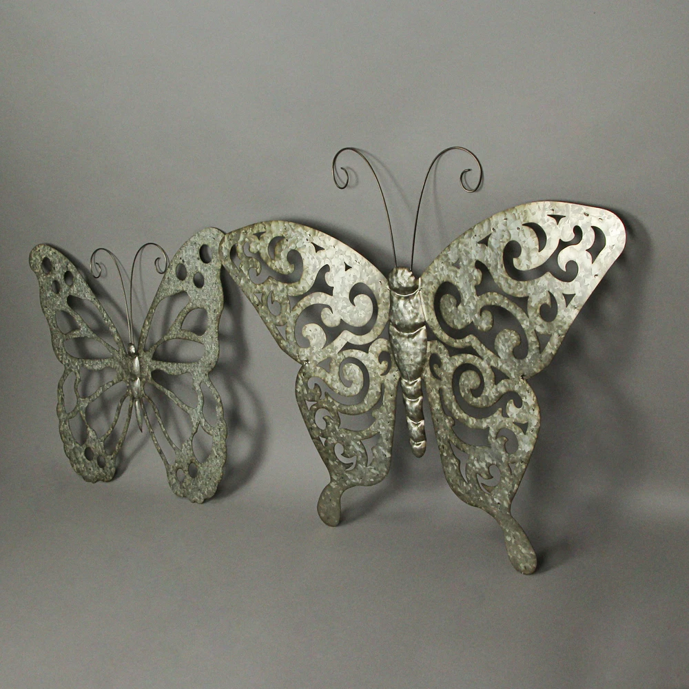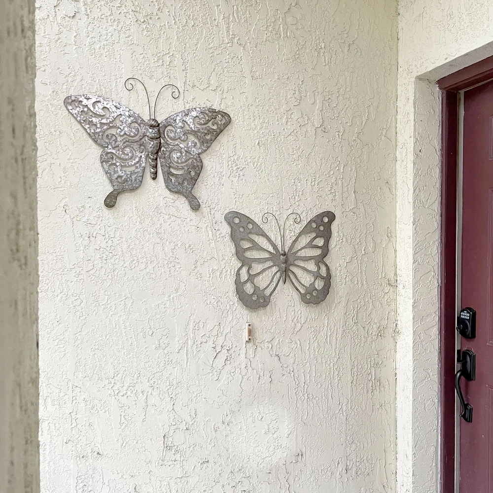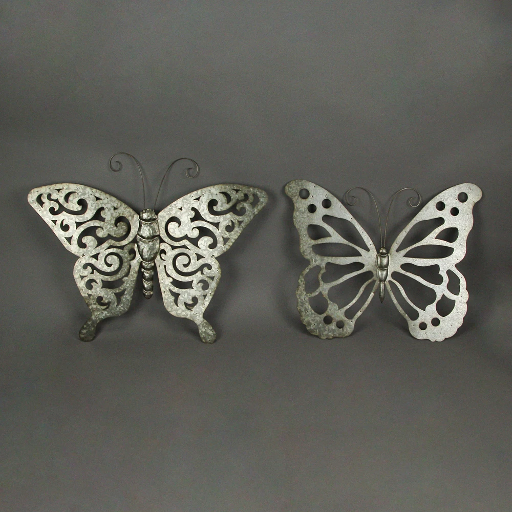 NOTE - DUE TO DEFECTS/DENTS IN THE FINISH this item is being sold at a reduced price. Please see last photo for damages/defects. Creatively Crafted of Metal Distressed Grey Galvanized Finish with an Open Work Body and 2 Sawtooth Mounting Hangers On the Back Liven Up Your Indoor Outdoor Space and Display in the Living Room or On a Patio Wall or Let them Make a Big Buzz On a Garden Fence Beautiful and Distinct Designs Include Openwork and Filigree Style Wings Full of Butterfly Character LG - 23.5 inch Long, 20.5 inch High, .25 inch Wide / SM - 19.5 inch Long, 16.75 inch High, .25 inch Wide Our eBay Store About Us Add to Favorite Sellers Galvanized Finish Metal Art Butterfly Wall Hangings Indoor Outdoor Set of 2 NOTE: DUE TO DEFECTS/DENTS IN THE FINISH this item is being sold at a reduced price. Please see last photo for damages/defects. NOTE - DUE TO DEFECTS/DENTS IN THE FINISH this item is being sold at a reduced price. Please see last photo for damages/defects. Creatively Crafted of Metal Distressed Grey Galvanized Finish with an Open Work Body and 2 Sawtooth Mounting Hangers On the Back Liven Up Your Indoor Outdoor Space and Display in the Living Room or On a Patio Wall or Let them Make a Big Buzz On a Garden Fence Beautiful and Distinct Designs Include Openwork and Filigree Style Wings Full of Butterfly Character LG - 23.5 inch Long, 20.5 inch High, .25 inch Wide / SM - 19.5 inch Long, 16.75 inch High, .25 inch Wide NOTE: DUE TO DEFECTS/DENTS IN THE FINISH this item is being sold at a reduced price. Please see last photo for damages/defects. Create a beautiful buzz that is just full of positive energy and hang this 2 piece butterfly wall art set in or around your home. Each piece is creatively crafted of metal with a lightly distressed grey galvanized finish, and their artful open work designs are sure to liven up any indoor or outdoor space. The butterflies are great for a patio, porch or garden, or display them inside your home and bring a sense of nature into your living space. You can display these butterflies anywhere using the sawtooth mounting hangers on the back of each piece. This set of 19.5 inch long, 16.75 inch high, .25 inch wide and 23.5 inch long, 20.5 inch high, .25 inch wide hanging butterflies brings a whimsical touch of artful inspiration to any home decor setting. Product Details Color Grey Height 20.5 Length 23.5 Weight 1.65 LB