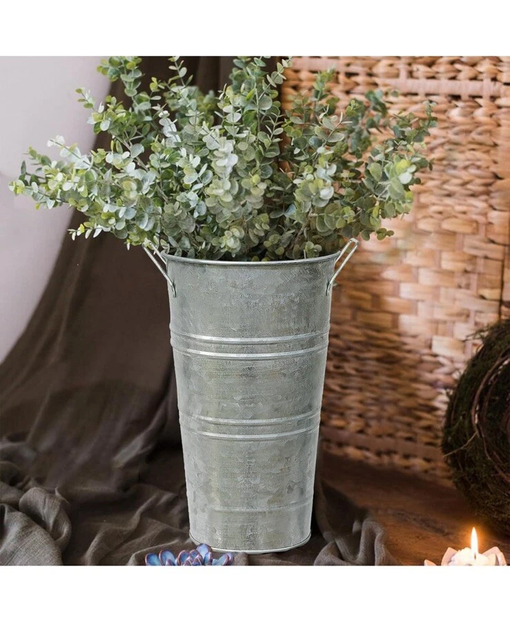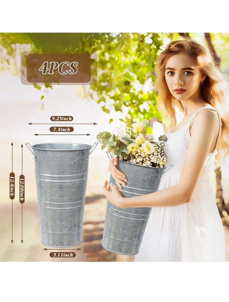 Top highlights Material Metal Color Large silver Set of 4 Special Feature Rust prevention, waterproof Style French Country Planter Form Plant Pot Shape Cylindrical ✿✿PREMIUM METAL MATERIAL - The galvanized vase is made of thickened and high-quality metal with a galvanized coating on the surface to prevent rusting,It has a waterproof coating inside, which is strong, durable and not easily deformed, and can provide excellent durability and long service life. ✿✿DIMENSIONS - Set of 8 premium quality metal buckets. Each vase is 7.48 x 7.48 x 12.08 inches tall with a bottom diameter of 5.13 inches.. The durable 4-point connected handles on the metal vases make them as functional as they are elegant. ✿✿GALVANIZED FLOWER VASES - Bring a charming rustic flair to your home decor with these decorative metal flower vases. Pair them with real, artificial flowers or plants to complete the vintage french country look.These table vases are ideal for flower arrangements, dried flowers or plants. Perfect as decor for restaurants, you can use the rustic vases on their own to elevate the look of any space. ✿✿ELEGANT DECORATION - The classic retro appearance of the galvanized flower vase can perfectly match any home decoration, adding an elegant and rustic atmosphere to your house. The galvanized finish has a well-designed pattern texture,These farmhouse vases for flowers will add a touch of rustic decor to your home or kitchen, you will love this vintage vase.