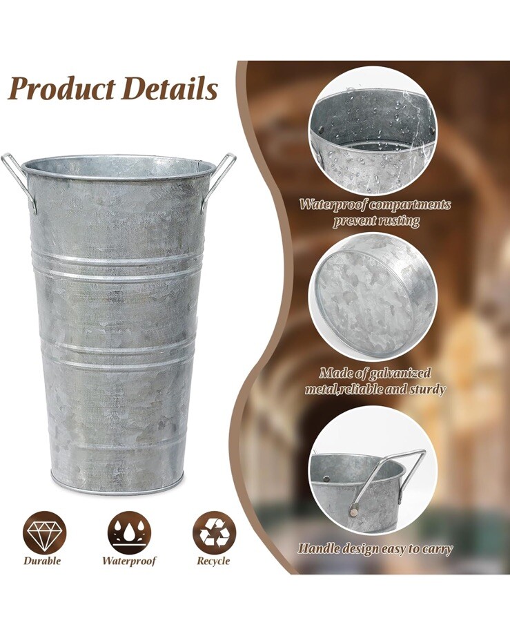 Top highlights Material Metal Color Large silver Set of 4 Special Feature Rust prevention, waterproof Style French Country Planter Form Plant Pot Shape Cylindrical ✿✿PREMIUM METAL MATERIAL - The galvanized vase is made of thickened and high-quality metal with a galvanized coating on the surface to prevent rusting,It has a waterproof coating inside, which is strong, durable and not easily deformed, and can provide excellent durability and long service life. ✿✿DIMENSIONS - Set of 8 premium quality metal buckets. Each vase is 7.48 x 7.48 x 12.08 inches tall with a bottom diameter of 5.13 inches.. The durable 4-point connected handles on the metal vases make them as functional as they are elegant. ✿✿GALVANIZED FLOWER VASES - Bring a charming rustic flair to your home decor with these decorative metal flower vases. Pair them with real, artificial flowers or plants to complete the vintage french country look.These table vases are ideal for flower arrangements, dried flowers or plants. Perfect as decor for restaurants, you can use the rustic vases on their own to elevate the look of any space. ✿✿ELEGANT DECORATION - The classic retro appearance of the galvanized flower vase can perfectly match any home decoration, adding an elegant and rustic atmosphere to your house. The galvanized finish has a well-designed pattern texture,These farmhouse vases for flowers will add a touch of rustic decor to your home or kitchen, you will love this vintage vase.