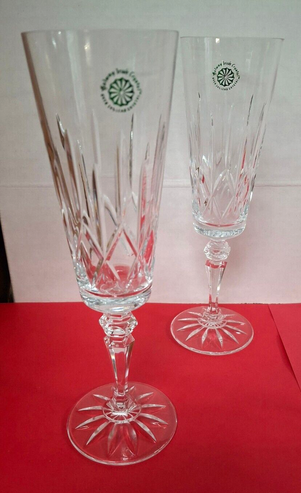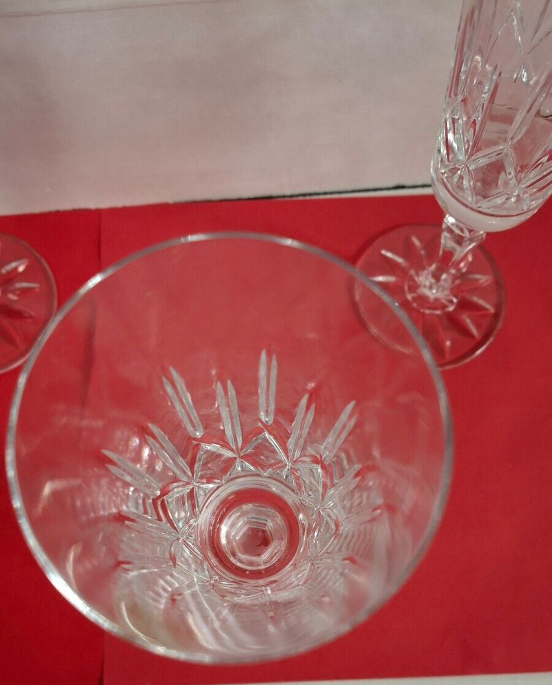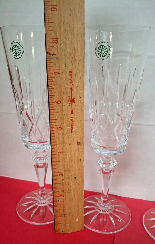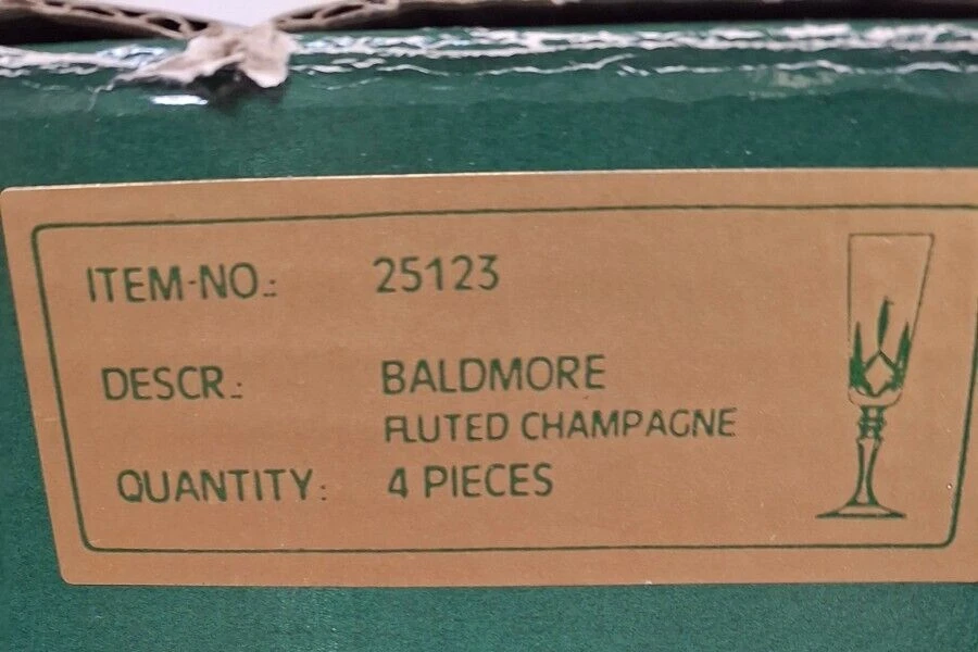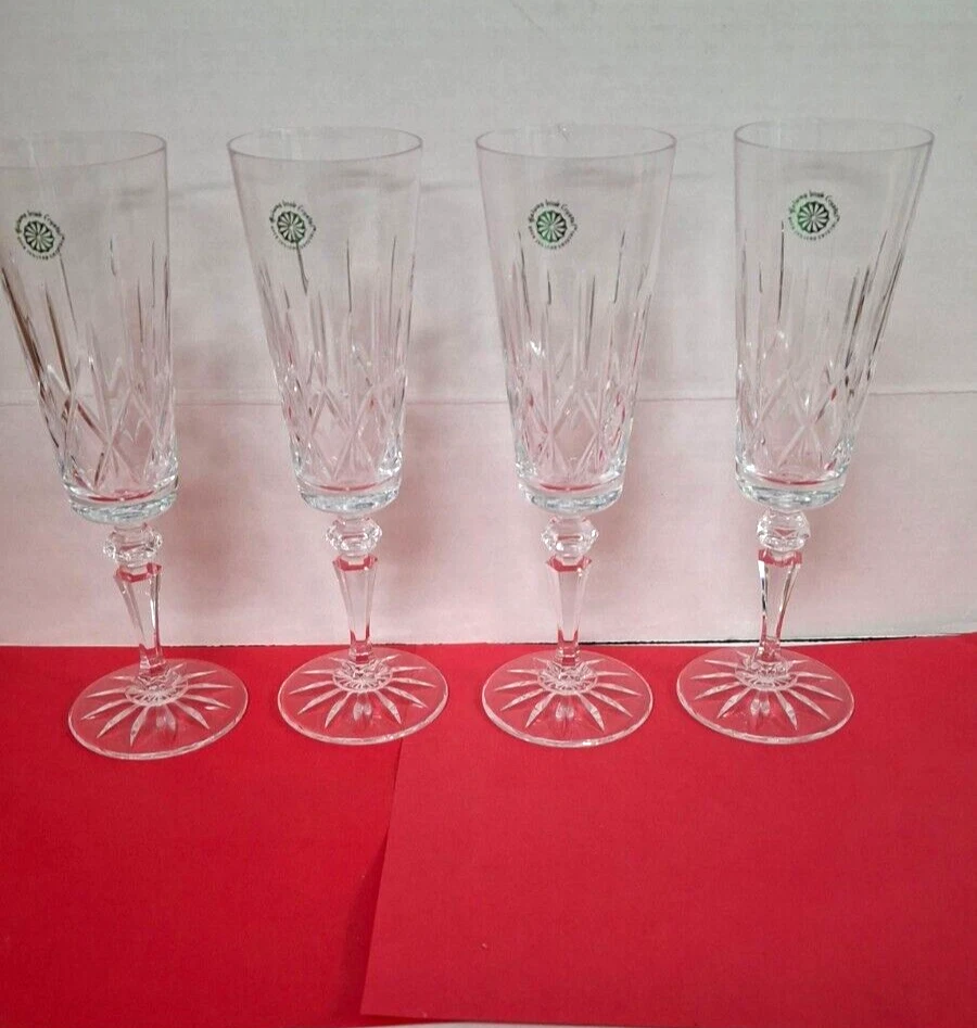 Brand New in Original Box. Model #25123 From Ireland Galway Irish Crystal Over 24% Lead Crystal. 4 Piece Set Fluted Champagne Glasses Vintage 1982 A Towle Company Box show signs of wear and sticker on bottom of box.