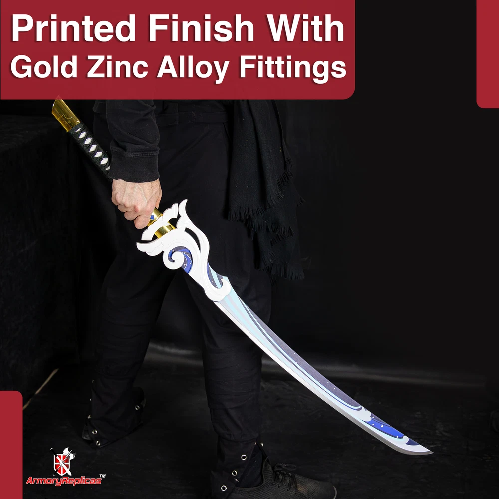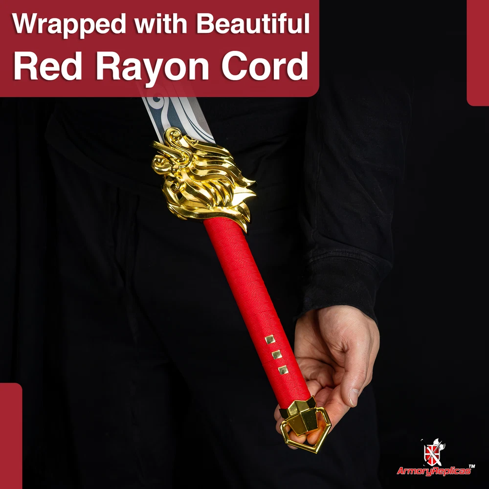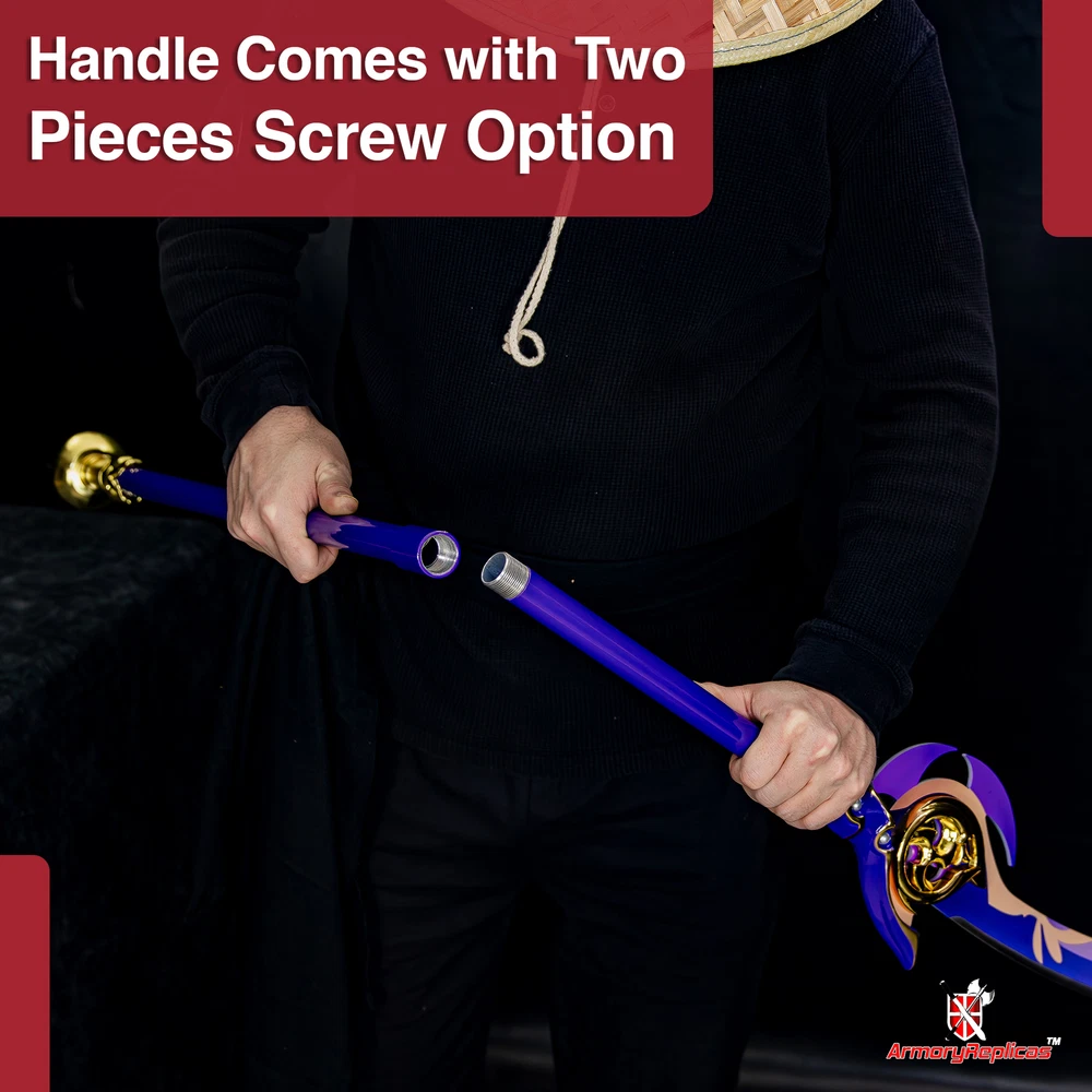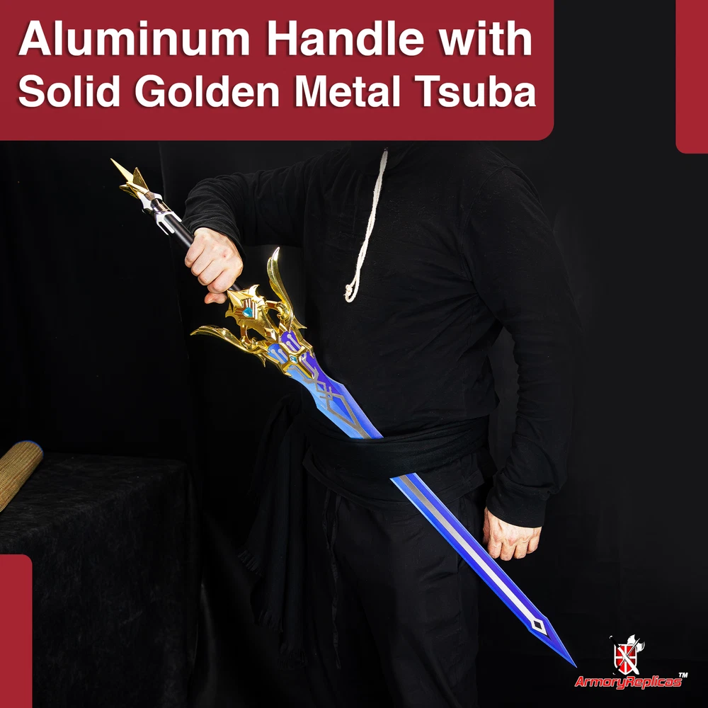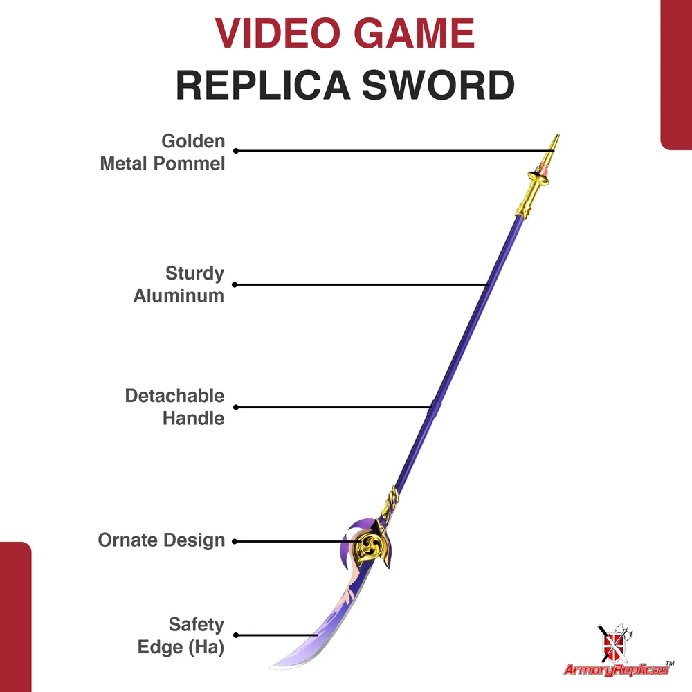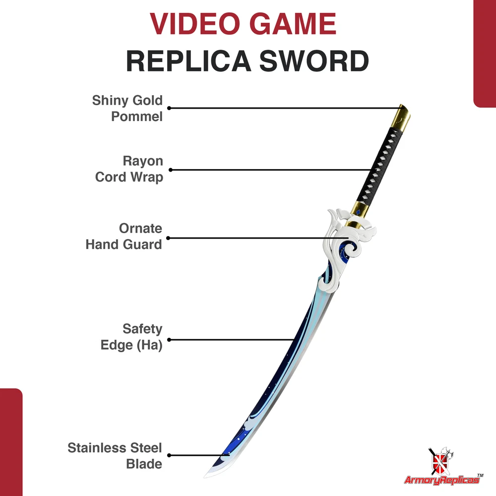 Freedom-Sworn Sword Overall Length: 45.25 inches, Blade Length: 27 inches, Handle Length: 12 inches, Video Game Replica Sword, Stainless Steel Blade, Printed Blue Finish, Wooden Handle, Gold Zinc Alloy Finish, Faux Jewel Accents. Lion's Roar Sword Overall Length: 37.25 inches, Blade Length: 24.5 inches, Handle Length: 9.75 inches, Video Game Replica Sword, Stainless Steel Blade, Printed Finish, Wooden Handle, Red Rayon Wrapping, Gold Zinc Alloy Fittings Akuoumaru Sword Overall Length: 43 inches, Blade Length: 23.5 inches, Handle Length: 12 inches, Video Game Replica Sword, Stainless Steel Blade, Printed Finish, Wooden Handle, Faux Rayskin Cover, Black Rayon Wrapping, Gold/White Zinc Alloy Fittings Engulfing Lightning Sword Overall Length: 69 inches, Blade Length: 16 inches, Handle Length: 49 inches, Video Game Replica Naginata, Stainless Steel Blade, Printed Purple Finish, Factory Edge, Aluminum Handle, Gold Zinc Alloy Fittings, Faux Pearl Accents Replicated from the 5-star polearm obtained through weapon event wishes, this naginata is made to look as though it came straight from the popular action roleplay video game Genshin Impact. The blade is constructed of stainless steel with a factory edge and has a printed coating to perfectly duplicate the beautiful purple blade in the game. The handle is made from aluminum with a vibrant purple finish and gold zinc alloy fittings. The handle comes in two pieces which easily screw together to create this near 70-inch weapon. The ornate guard is also made from zinc alloy in a pinwheel design with a gorgeous golden sheen. Light pearls are inlayed in the guard for even more elaborate detail. Now you can bring home this legendary piece for your collectio