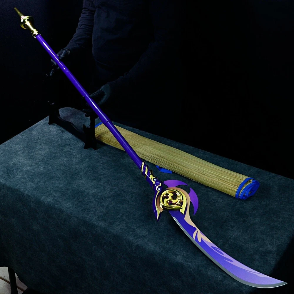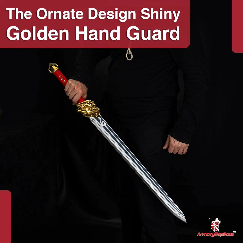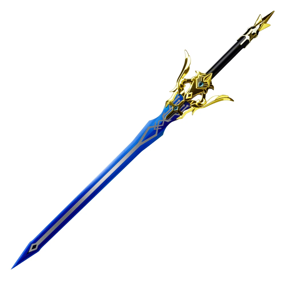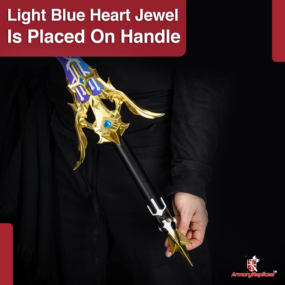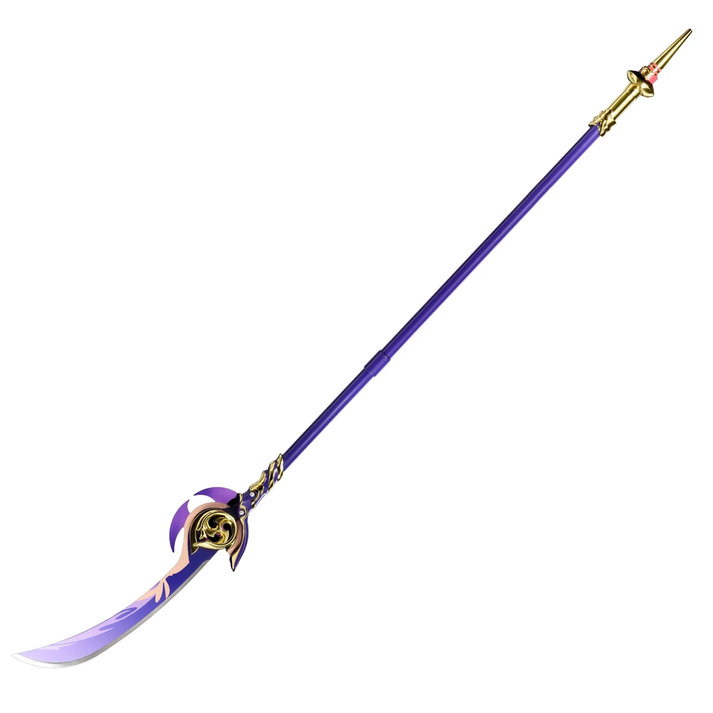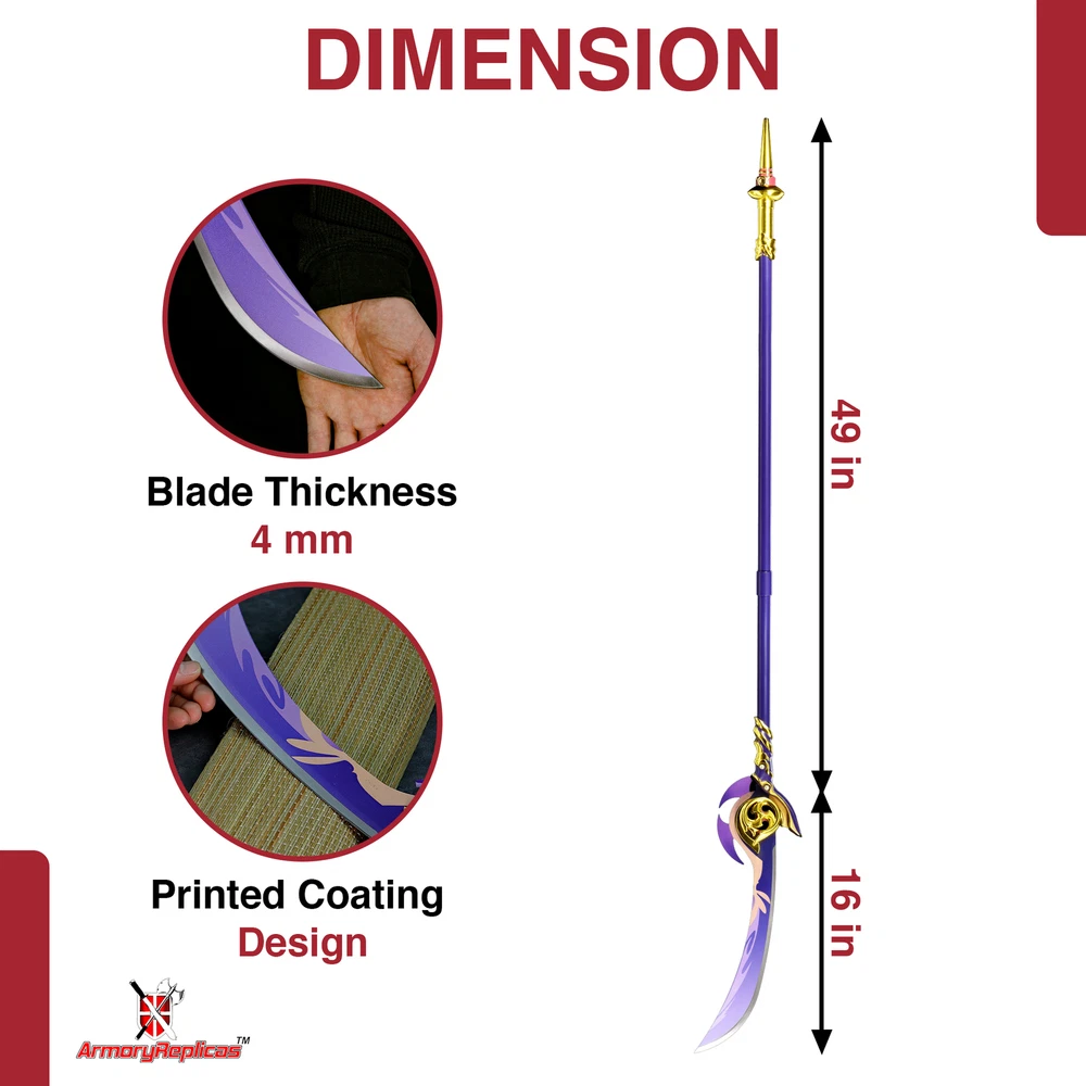 Freedom-Sworn Sword Overall Length: 45.25 inches, Blade Length: 27 inches, Handle Length: 12 inches, Video Game Replica Sword, Stainless Steel Blade, Printed Blue Finish, Wooden Handle, Gold Zinc Alloy Finish, Faux Jewel Accents. Lion's Roar Sword Overall Length: 37.25 inches, Blade Length: 24.5 inches, Handle Length: 9.75 inches, Video Game Replica Sword, Stainless Steel Blade, Printed Finish, Wooden Handle, Red Rayon Wrapping, Gold Zinc Alloy Fittings Akuoumaru Sword Overall Length: 43 inches, Blade Length: 23.5 inches, Handle Length: 12 inches, Video Game Replica Sword, Stainless Steel Blade, Printed Finish, Wooden Handle, Faux Rayskin Cover, Black Rayon Wrapping, Gold/White Zinc Alloy Fittings Engulfing Lightning Sword Overall Length: 69 inches, Blade Length: 16 inches, Handle Length: 49 inches, Video Game Replica Naginata, Stainless Steel Blade, Printed Purple Finish, Factory Edge, Aluminum Handle, Gold Zinc Alloy Fittings, Faux Pearl Accents Replicated from the 5-star polearm obtained through weapon event wishes, this naginata is made to look as though it came straight from the popular action roleplay video game Genshin Impact. The blade is constructed of stainless steel with a factory edge and has a printed coating to perfectly duplicate the beautiful purple blade in the game. The handle is made from aluminum with a vibrant purple finish and gold zinc alloy fittings. The handle comes in two pieces which easily screw together to create this near 70-inch weapon. The ornate guard is also made from zinc alloy in a pinwheel design with a gorgeous golden sheen. Light pearls are inlayed in the guard for even more elaborate detail. Now you can bring home this legendary piece for your collectio