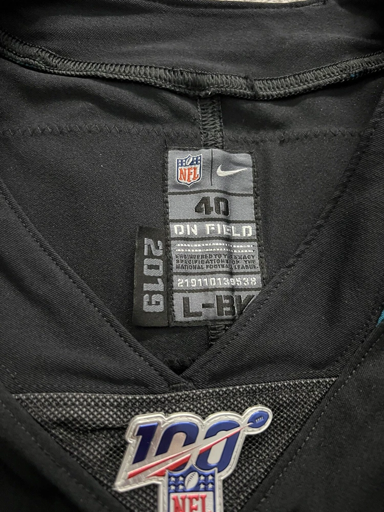 Nike size 40 from the 2019 season. Has the NFL 100 logo as well as the 25th anniversary logo. Issued to Savion Smith.