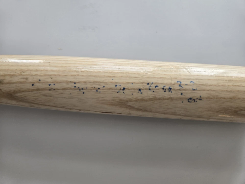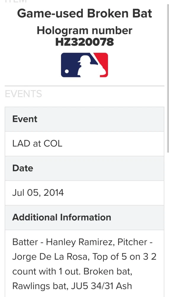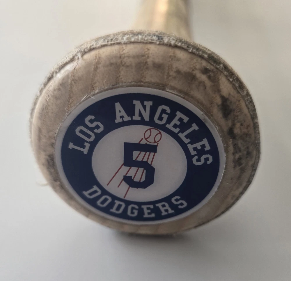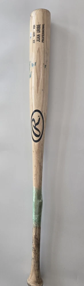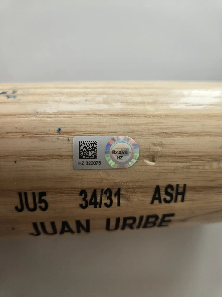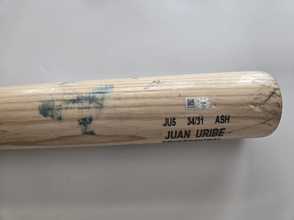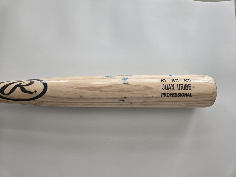 Mlb authenticated Game Used Baseball bat. Juan uribe ju5 model rawlings bat blonde with dodger #5 end cap. Game used and broken during at bat by teammate hanley ramirez. Rear of barrel has remnants of the authenticator notes